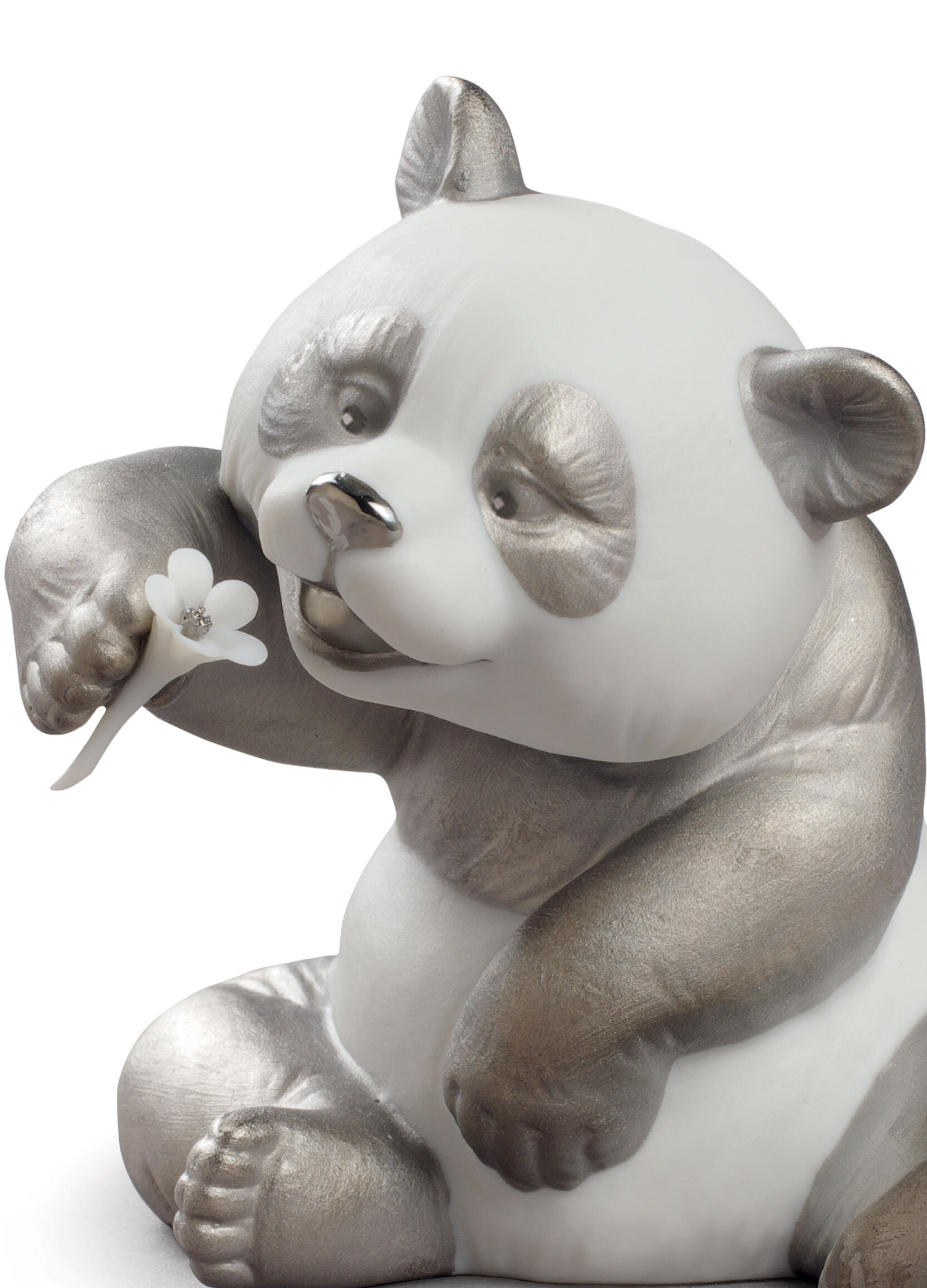 The Re-Deco concept gives a new life to the classic pieces of the LladrĂ³ catalogue through a new and striking decorative approach. This charming panda is given a much more contemporary style through the contrast between the matte white porcelain finish and the silver lustre that highlights parts of the piece.