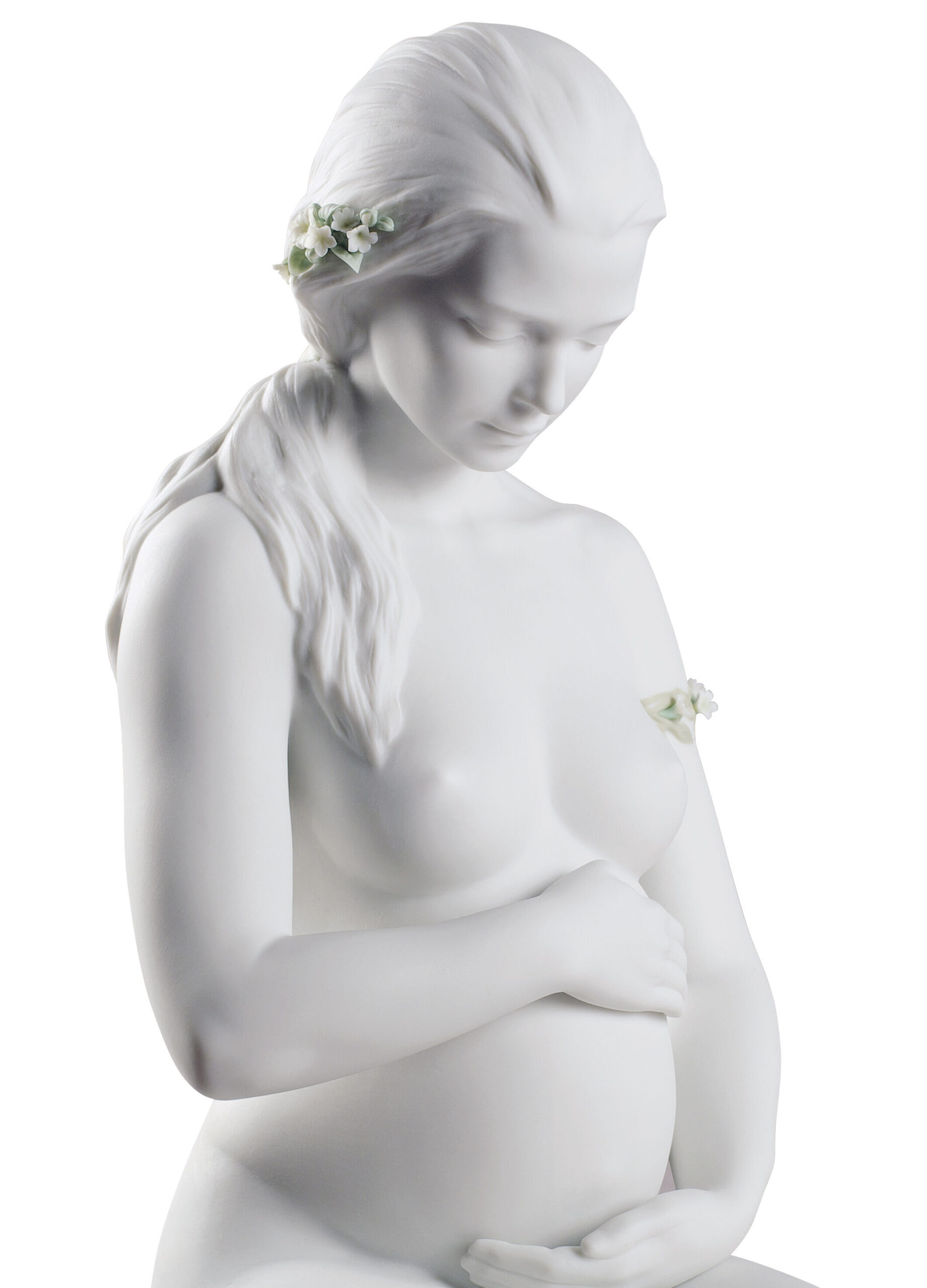 Serene and focused on the new life growing in her womb, this pregnant woman symbolises the beauty and fullness of motherhood. A matte white porcelain piece, ideal as a gift to a mother-to-be.