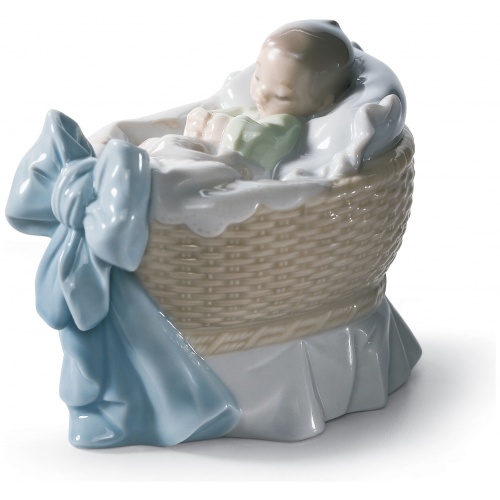 It awakens in us the tenderness, the sweetness and the instinct of protection. A little boy rests in his cradle as we imagined in the romantic fairy tales: in a beautiful wicker basket adorned with a large ribbon. A perfect piece to give as a gift and to celebrate the birth of a new member of the family. Also available is the version with a girl and the pink bow.