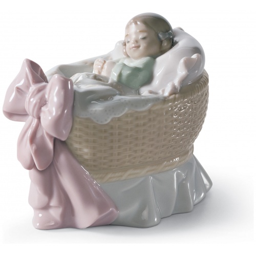 It awakens in us the tenderness, the sweetness and the instinct of protection. A little girl rests in her crib as we imagined in the romantic fairy tales: in a beautiful wicker basket adorned with a large ribbon. A perfect piece to give as a gift and to celebrate the birth of a new member of the family. Also available is the version with one child and blue ribbon.