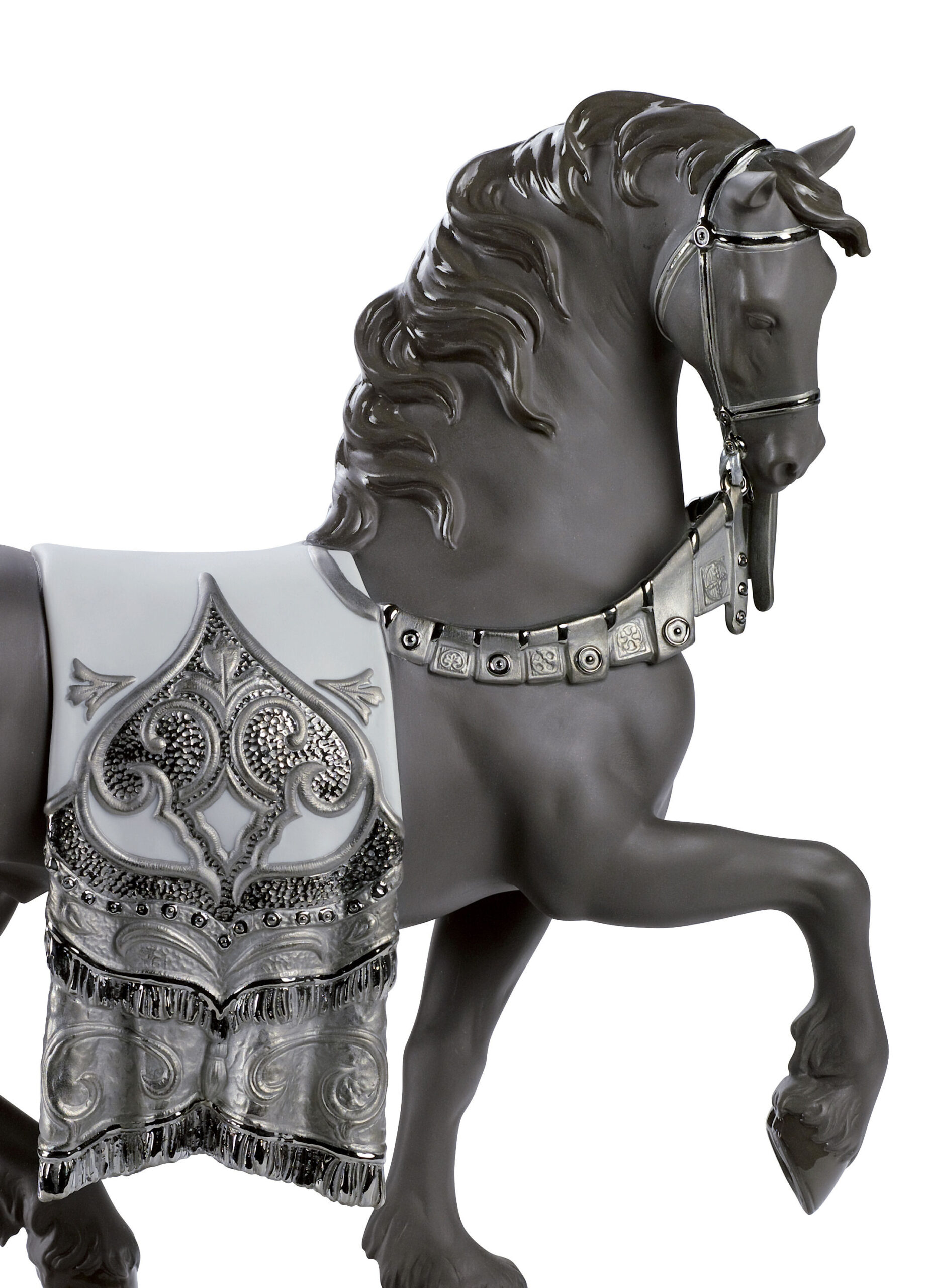 The Re-Deco concept gives a new life to the classic pieces of the LladrĂ³ catalogue through a new and striking decorative approach. This elegant horse is given a much more contemporary style through the contrast between the matte white porcelain finish and the silver lustre that highlights the fine harness it wears.