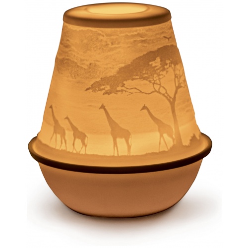 The African Savannah lithophany votive depicts the wildlife of the savannah in precisely defined engravings and relief sculpture in translucent porcelain. An adult elephant leads her herd on a long path, symbolizing the relationships among the similar and the different, between adults and youngsters.