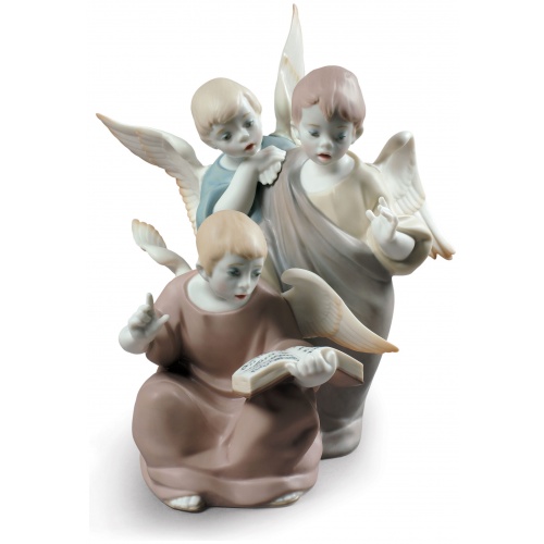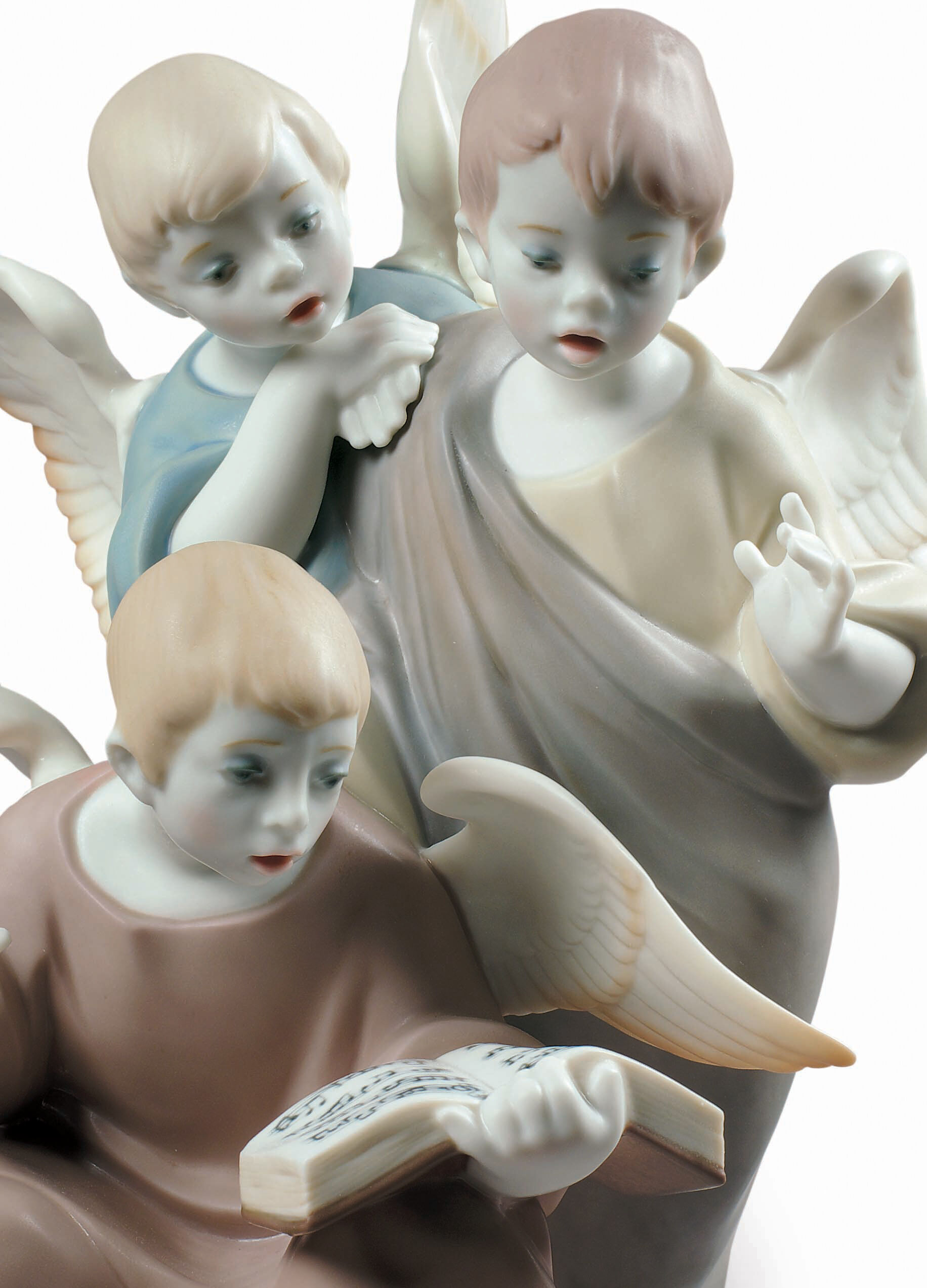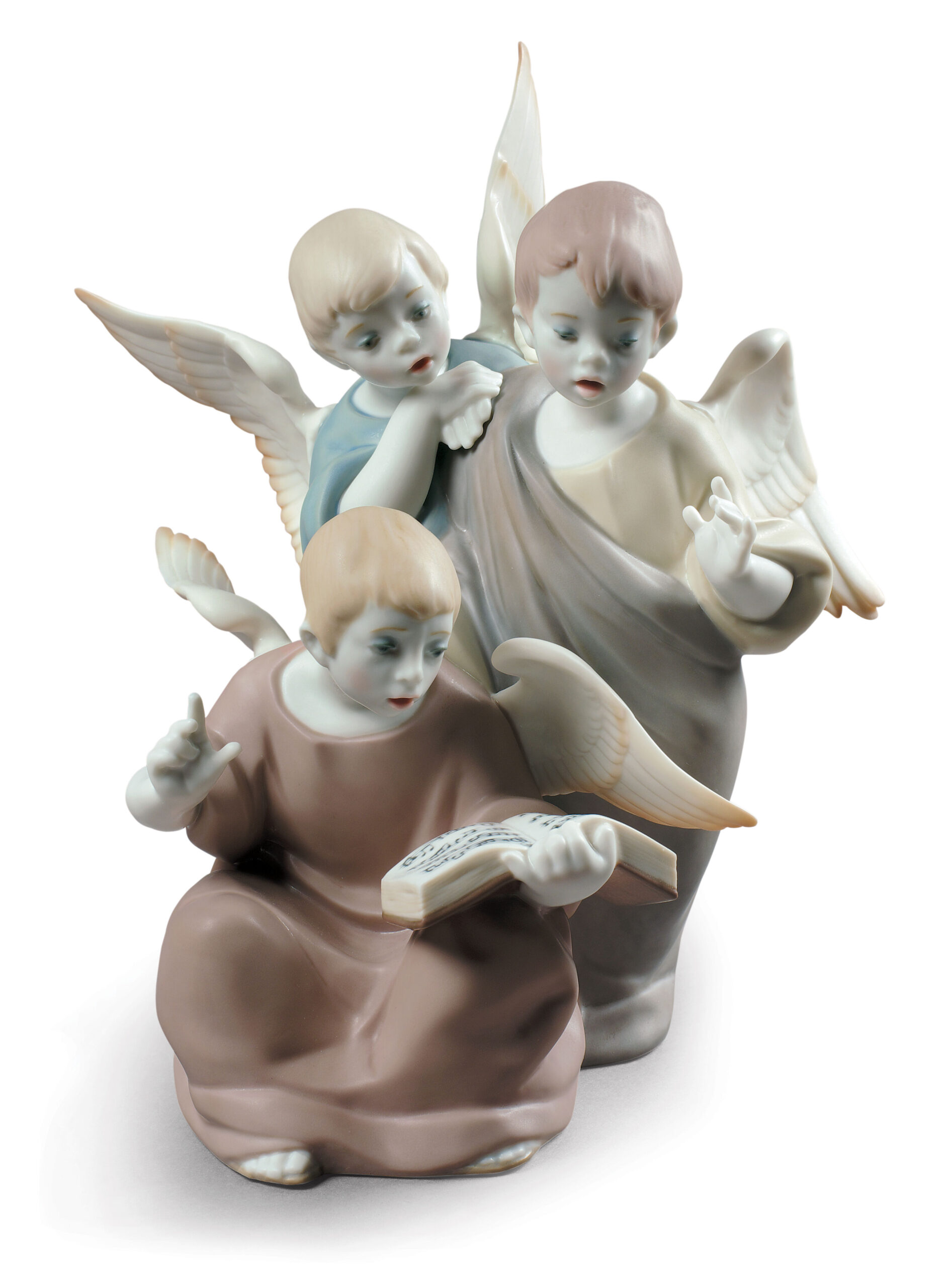 We envision heaven as being lifted by divine music, as sublime and delicate as that sung by this charming little angelic choir. A porcelain piece, with satin finish and soft colours, perfect as a gift, collectible or decoration.
