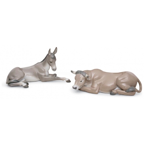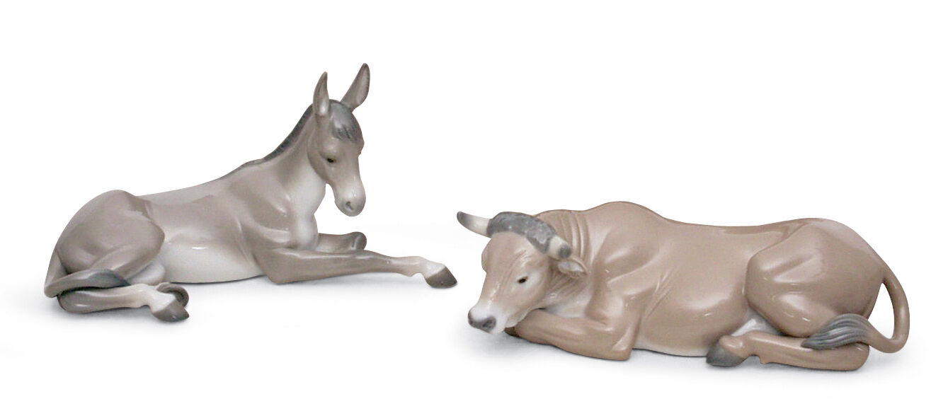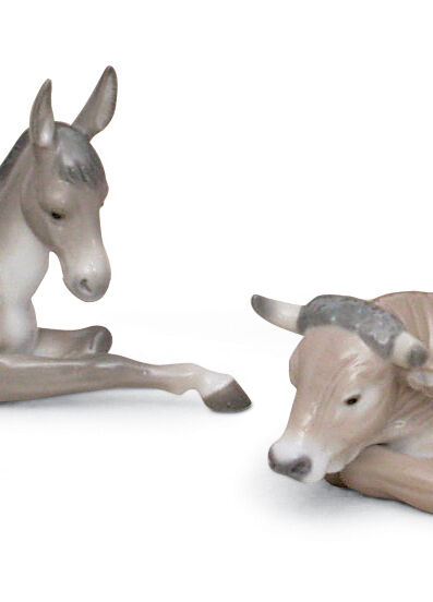 The ox and the mule. Set in glossy porcelain that complements Silent Night Nativity Set (ref. 01007804) that includes the three main figures of the nativity scene.
