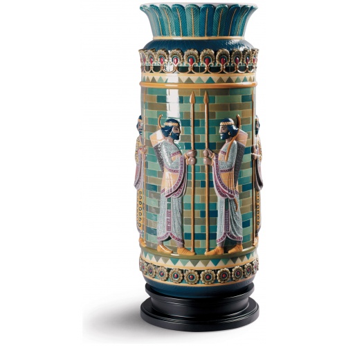 Known as the ¨immortals¨, the archers of the Persian royal guard transport us 2,500 years back in time, as recreated in this stunning vase. A High Porcelain limited edition evokes the splendour of this civilisation with masterful relief decoration and a carefully chosen colour palette. The Greek historian Herodotus recounts that the Persians taught their children only three things: horseback riding, archery and to tell the truth, which is why their soldiers were the best in the world. This piece is inspired by the Frieze of Archers which adorned the palace of Darius I (522-486 BC.) in Susa, showing the warriors of the royal guard, richly adorned with bracelets and earrings, embroidered tunics and colourful turbans.