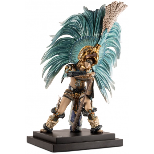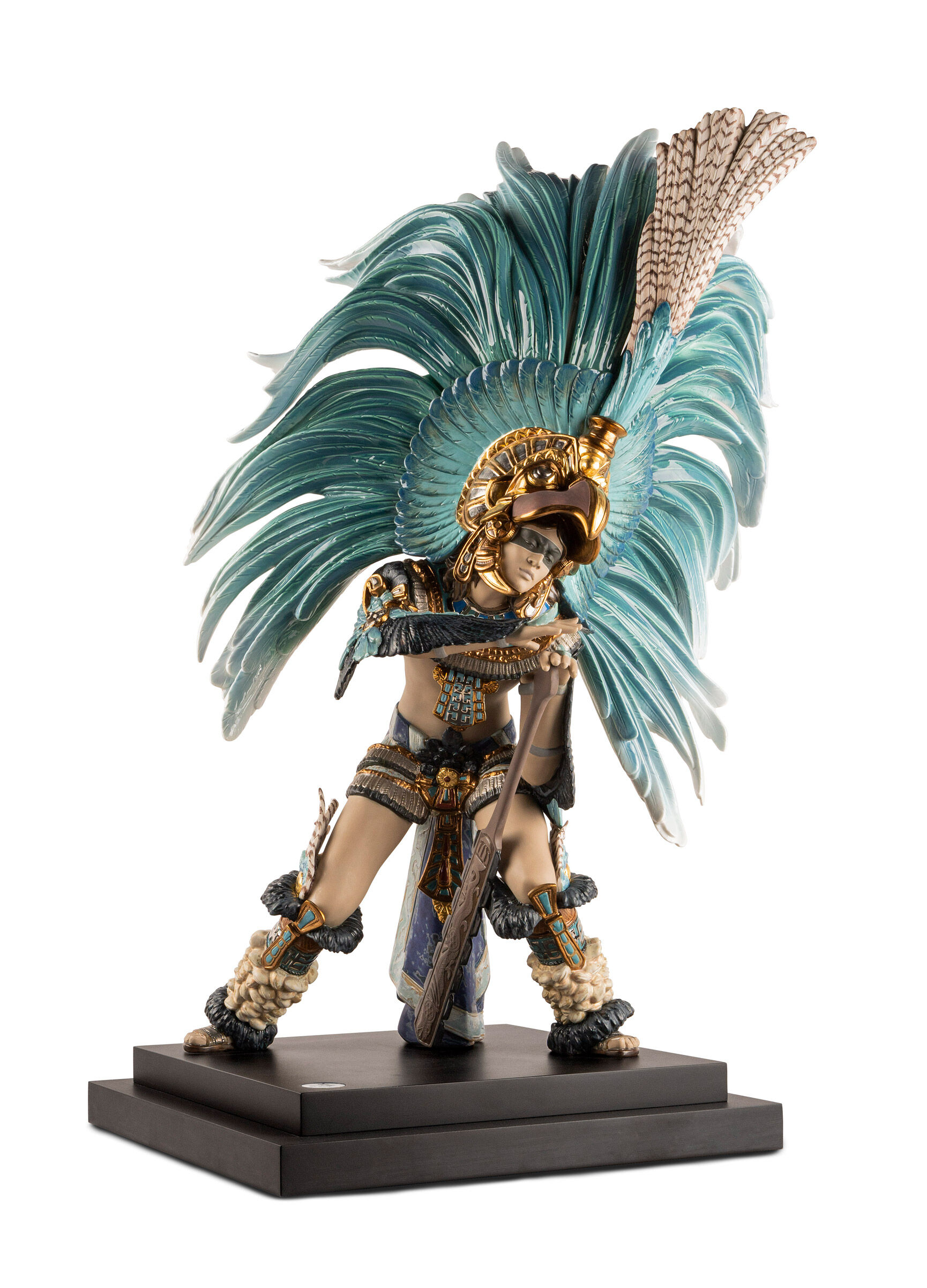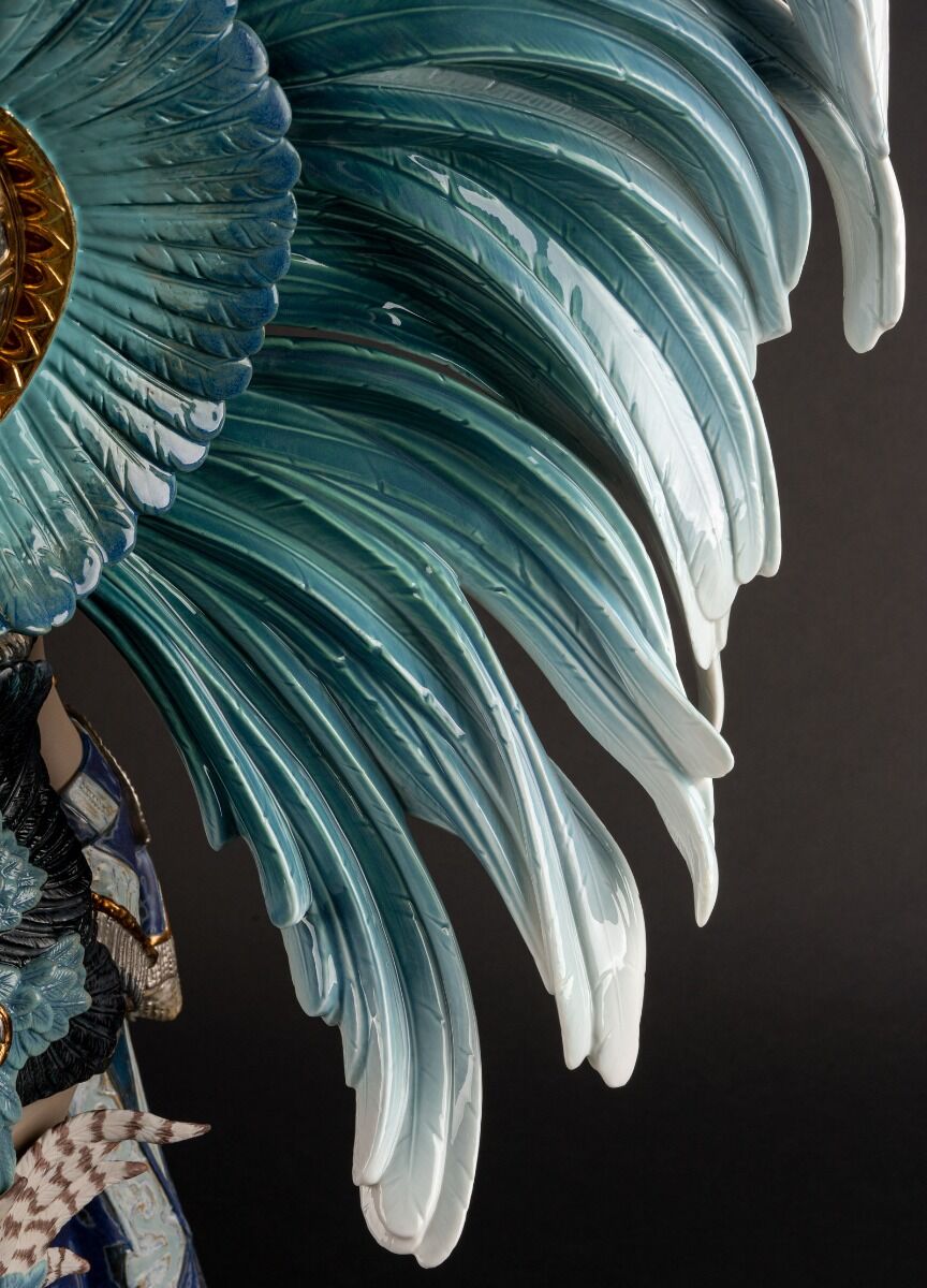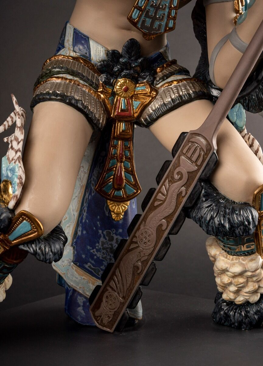 The size, posture and expressive gestures of this porcelain creation entailed a highly complex process of elaboration, making it an excellent example of Lladró’s technical and decorative virtuosity. Taken overall, the feathers, the knee and ankle cuffs, the skirt and the breastplate have been worked with minute ornamental detail and with a meticulous use of enamels and metallic lusters.