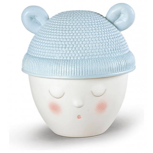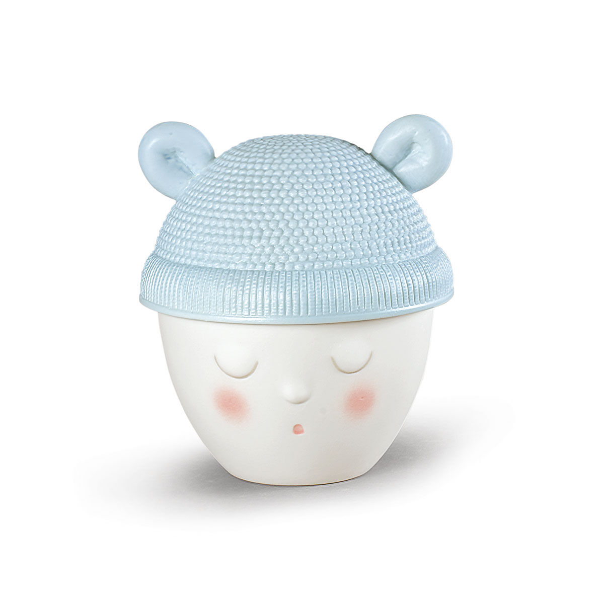 Finished in matte porcelain on the face and on the outside and inside of the hat in the shape of a baby bear in blue with a satin finish, decorated with perfection. The face is decorated with soft touches of colour.