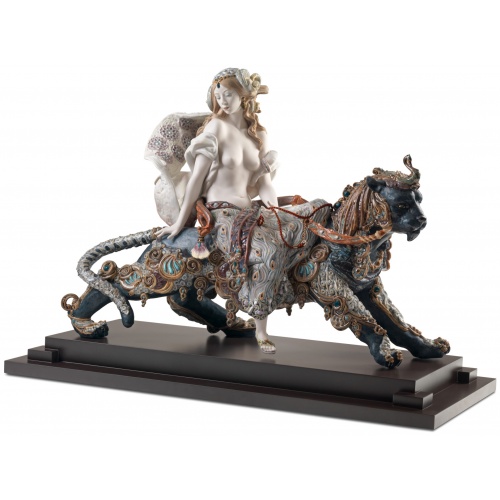 The beauty of women is enhanced by the imposing force of the feline. With this spectacular creation, the artists of the LladrĂ³ High Porcelain workshop contribute their own vision of a classic theme which has inspired great masterpieces. With a theme based on the Bacchae of Ancient Greece, later recreated by Renaissance and Baroque painters such as Titian, Michelangelo and Rubens, the temperament and sumptuous decoration of this sculpture reminds us of the painting, Bacchante with a panther (1855) by the French painter William Adolphe Bouguereau. The sensuality of this limited edition is accentuated by the semi-nudity of the woman and her very white skin. There is a contrast between this clarity and the decorative richness in the dark tones of her skirt and, above all, with the Panther upon which she is seated. The wealth of finishes, hues, backgrounds and textures is achieved through the combination of matte porcelain and complex enamelling techniques, all applied by hand.