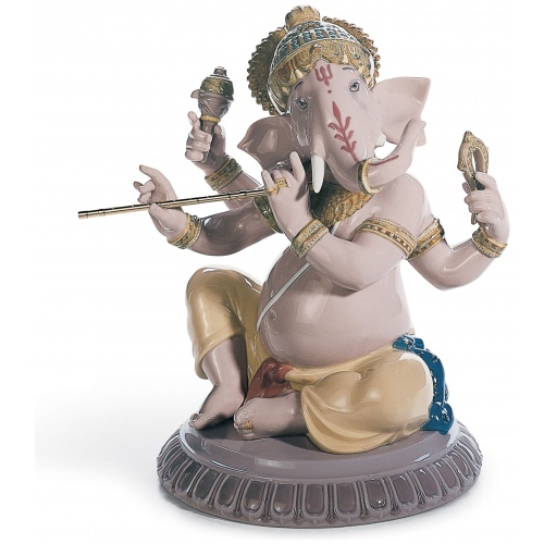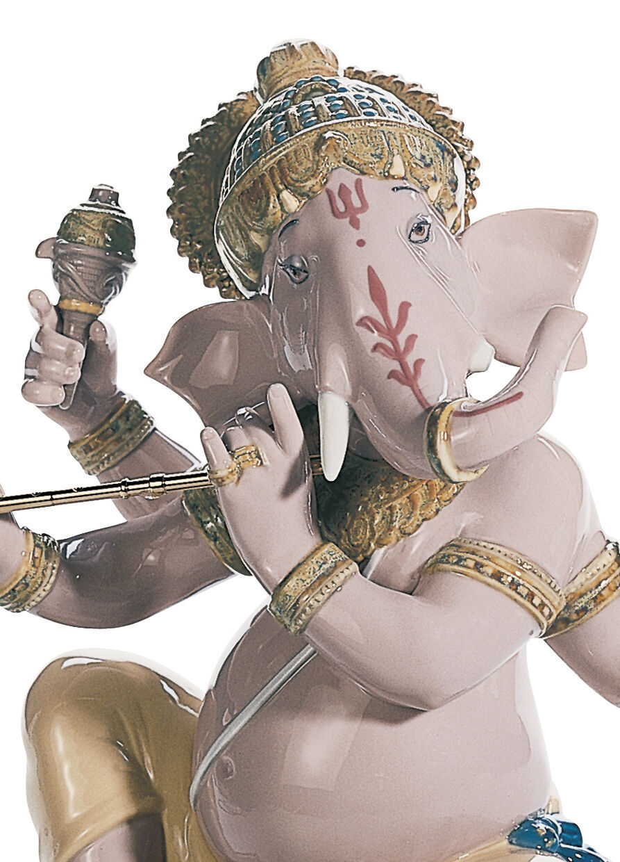 Lord Ganesha is the god of wisdom and knowledge. This deity is very popular in India, and he is represented here playing an Indian flute (bansuri). In addition, the piece portrays other attributes of the traditional iconography of Ganesha, such as the gada (mace), the Paasha (rope) and the broken fang, all elements whose symbolism is contained in the avatars, or traditional stories about Ganesha, which are known well by his numerous worshippers.
