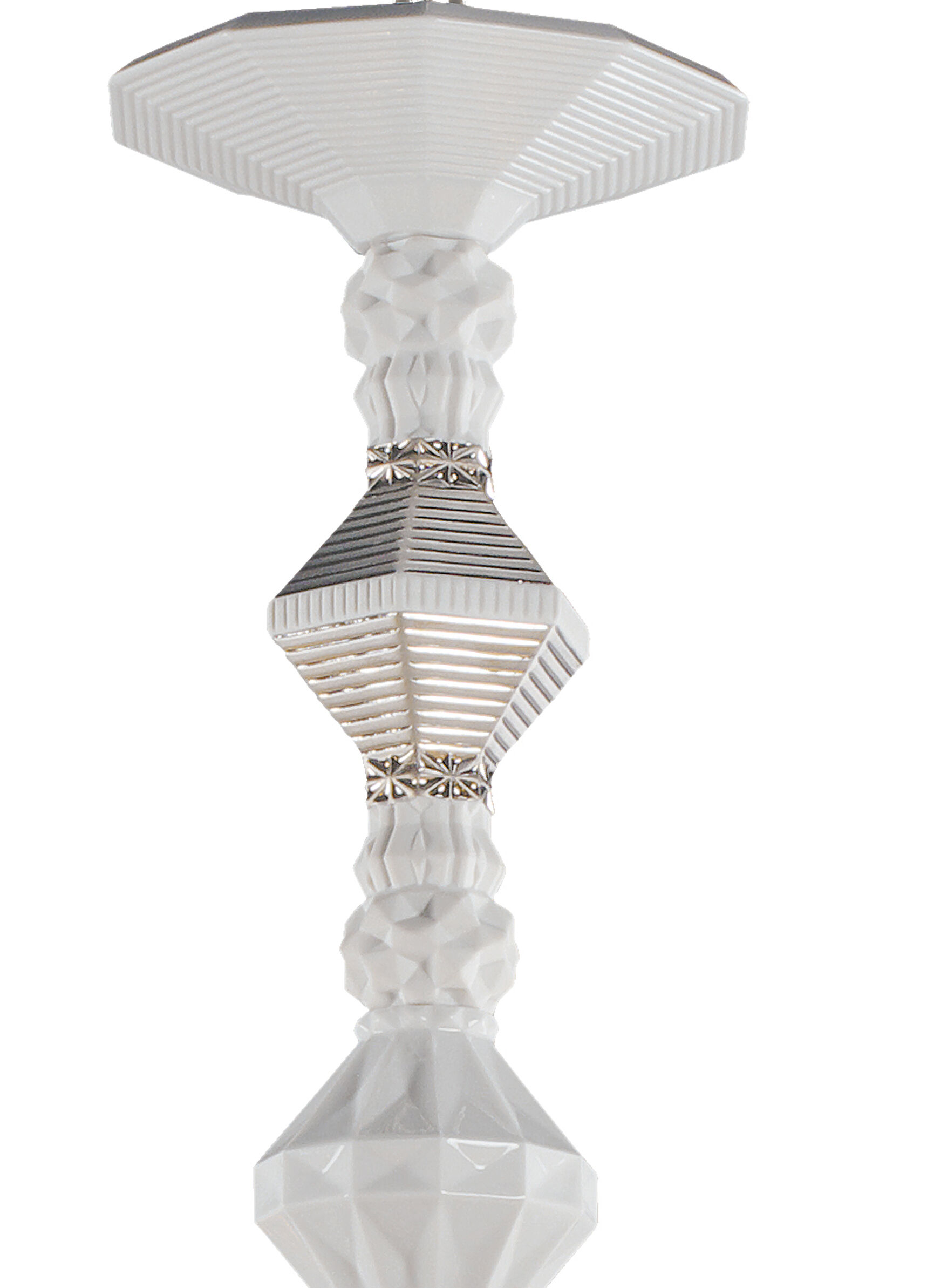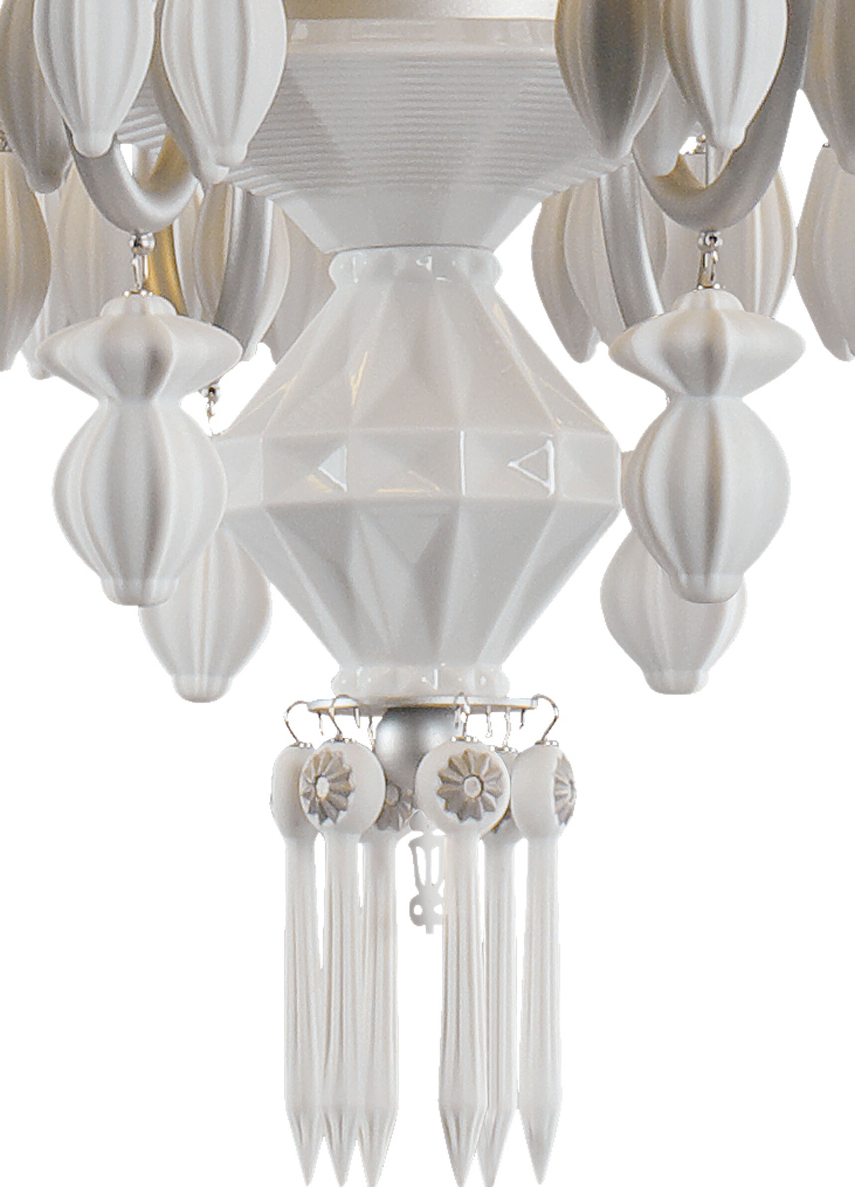 Beauty of the Night. Such is the name of the plant whose petals reflect the moonlight, thus acquiring the magical property of glowing in the dark. This striking species provides the inspiration for the Belle de Nuit lighting collection, particularly the Silver model chandelier. Classic chandelier lamps are reinterpreted through the unique language of porcelain and with the elegance and sophistication of the silver hue. Available with 12, 24, 40 and 56 lights and white porcelain lampshades.
