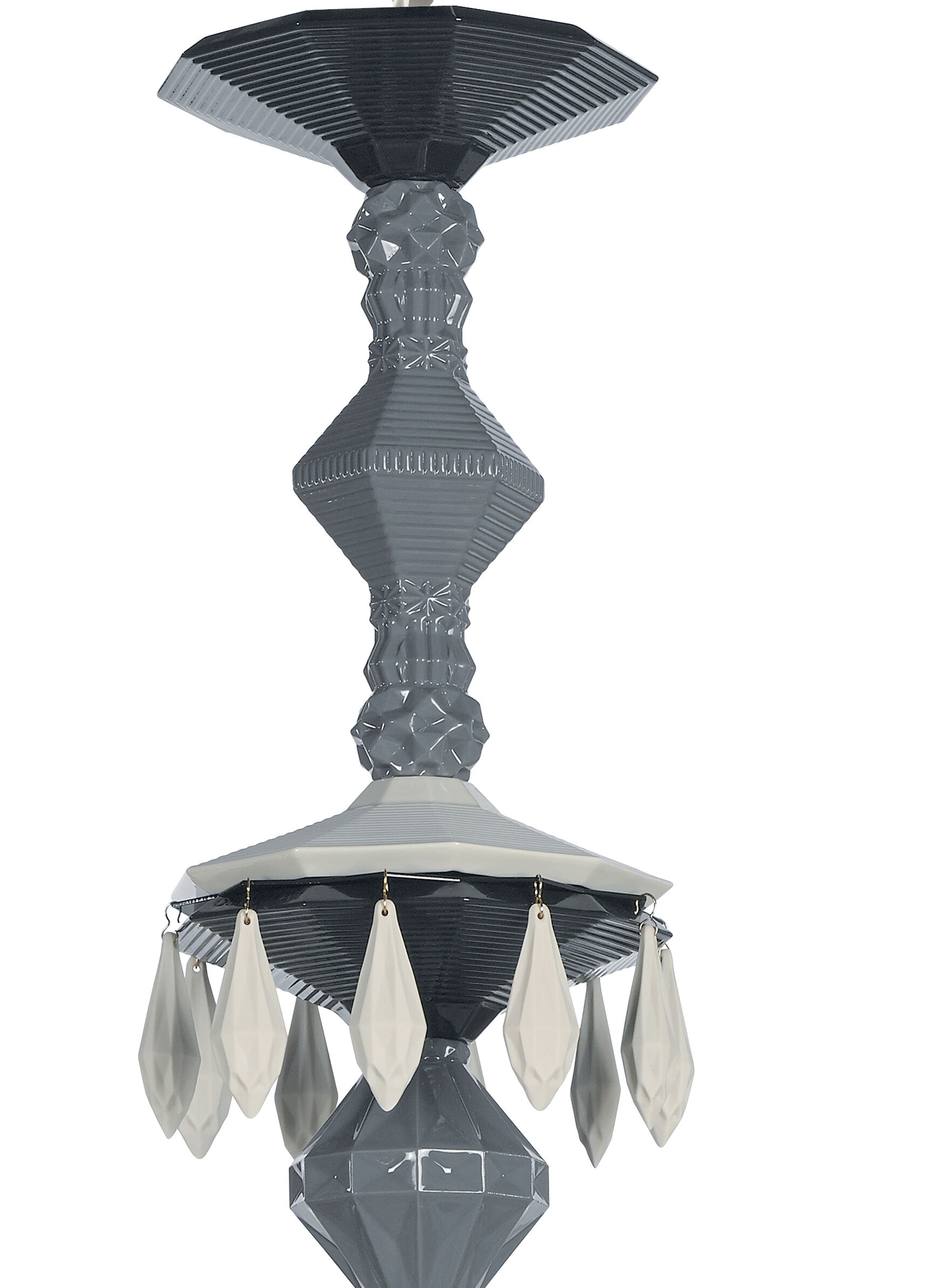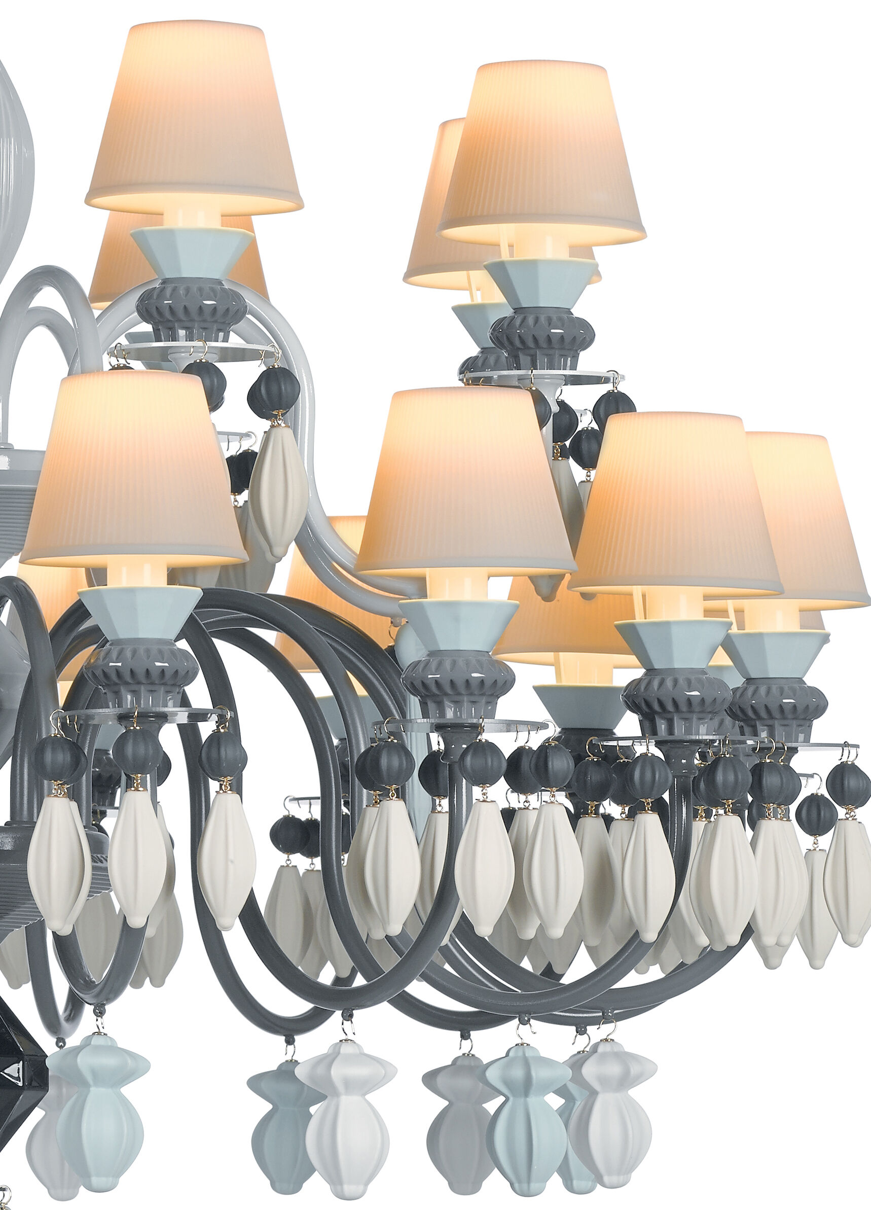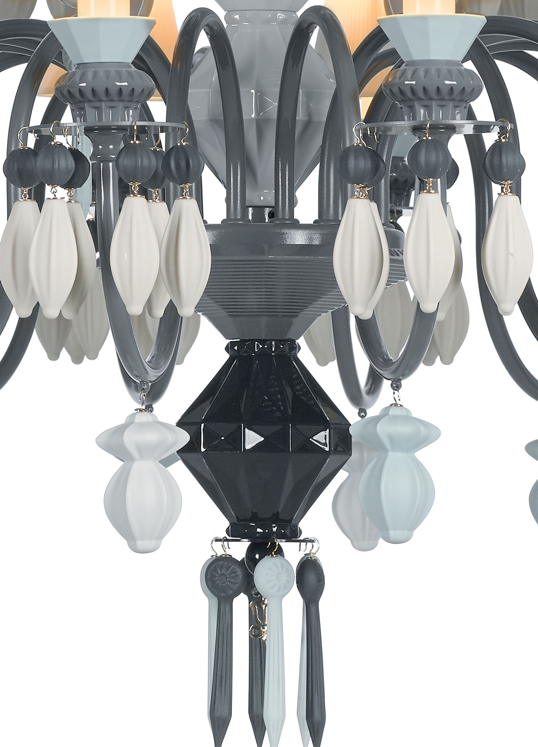 Beauty of the Night. Such is the name of the plant whose petals reflect the moonlight, thus acquiring the magical property of glowing in the dark. This striking species provides the inspiration for the Belle de Nuit lighting collection, particularly the Black model chandelier. Classic chandelier lamps are reinterpreted through the unique language of porcelain. Available with 12, 24, 40 and 56 lights and white porcelain lampshades.