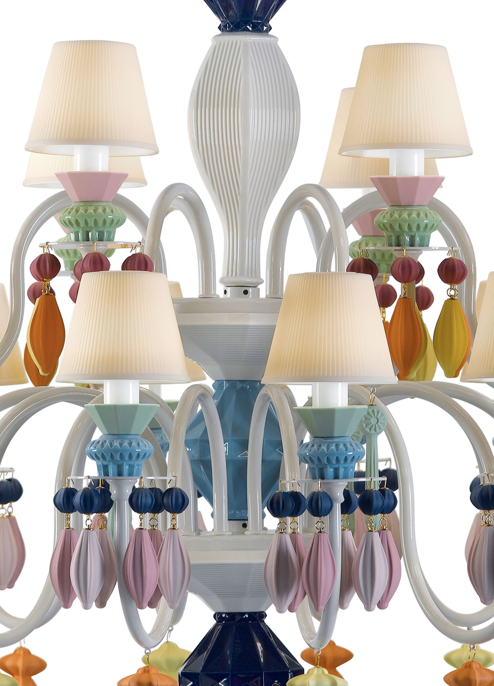 Beauty of the Night. Such is the name of the plant whose petals reflect the moonlight, thus acquiring the magical property of glowing in the dark. This striking species provides the inspiration for the Belle de Nuit lighting collection, particularly the Multicoloured model chandelier. Classic chandelier lamps are reinterpreted through the unique language of porcelain. Available with 12, 24, 40 and 56 lights and white porcelain lampshades.