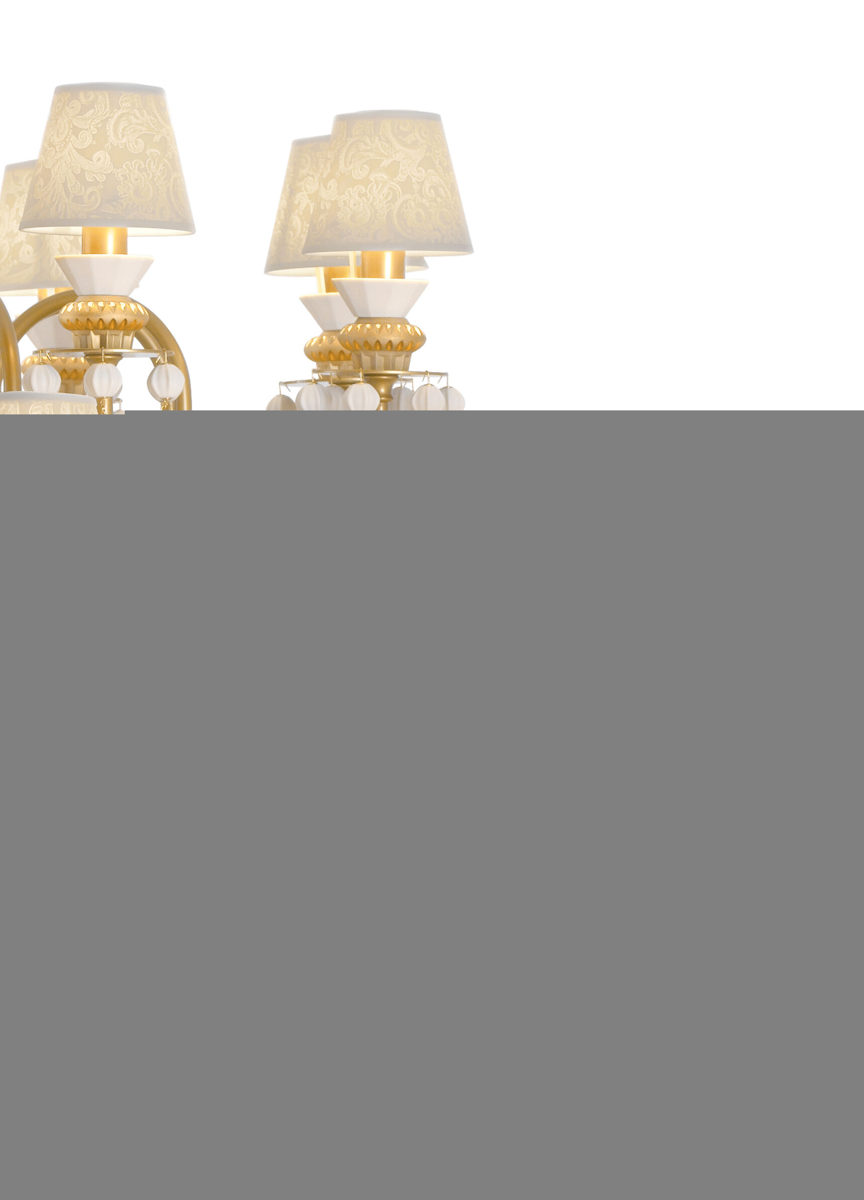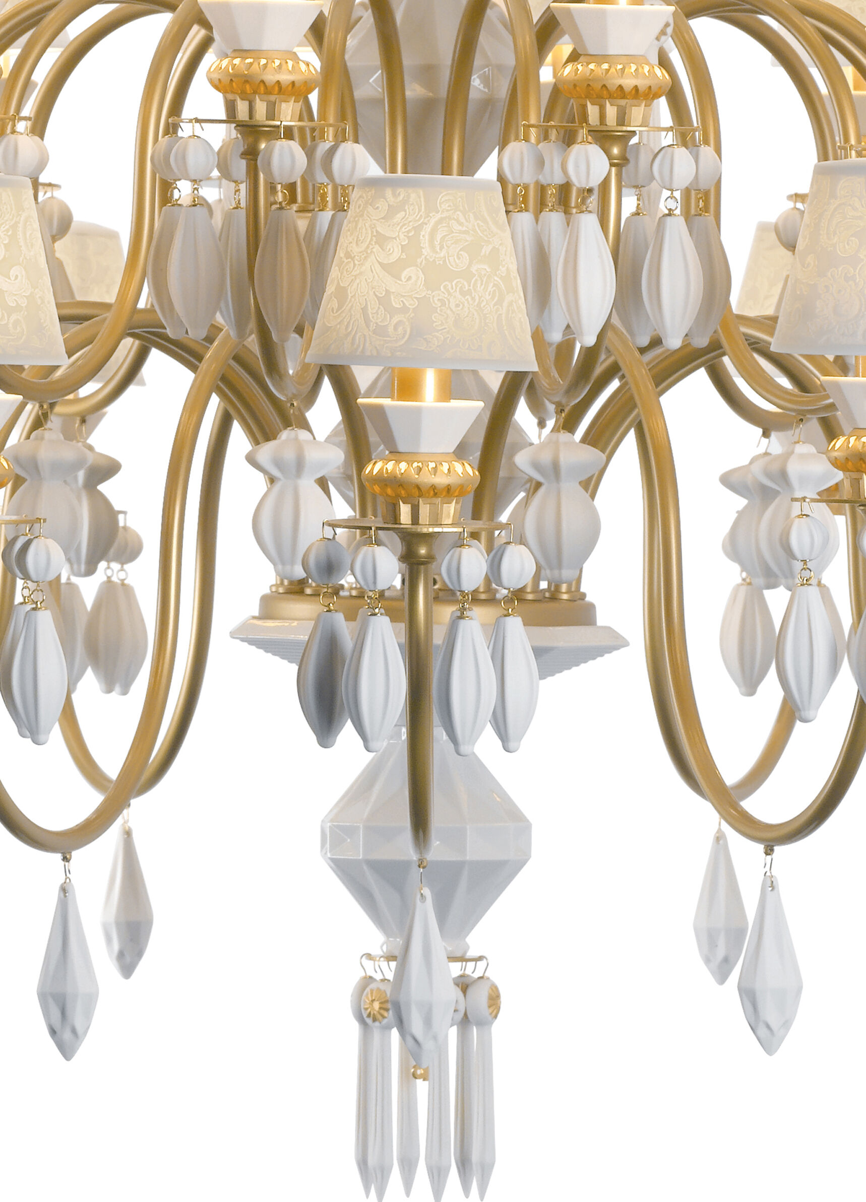 Beauty of the Night. Such is the name of the plant whose petals reflect the moonlight, thus acquiring the magical property of glowing in the dark. This striking species provides the inspiration for the Belle de Nuit lighting collection, particularly the Gold model chandelier. Classic chandelier lamps are reinterpreted through the unique language of porcelain, with the elegance and sophistication of gold hues. Available with 12, 24, 40 and 56 lights and white porcelain lampshades.