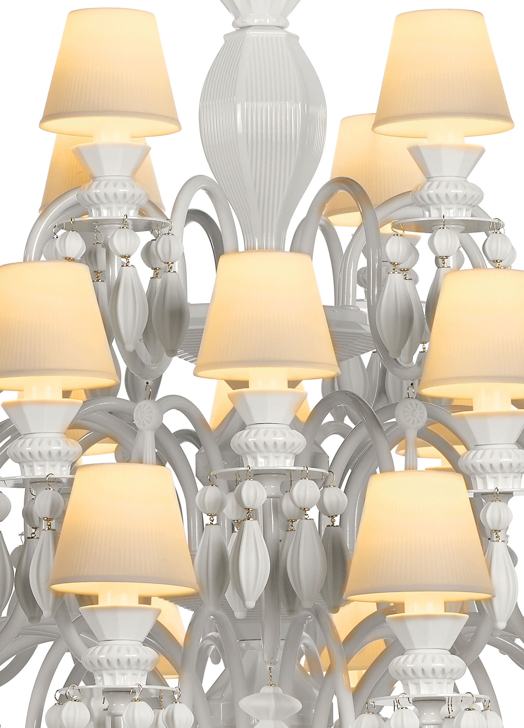 Beauty of the Night. Such is the name of the plant whose petals reflect the moonlight, thus acquiring the magical property of glowing in the dark. This striking species provides the inspiration for the Belle de Nuit lighting collection, particularly the White model chandelier. Classic chandelier lamps are reinterpreted through the unique language of porcelain. Available with 12, 24, 40 and 56 lights and white porcelain lampshades.