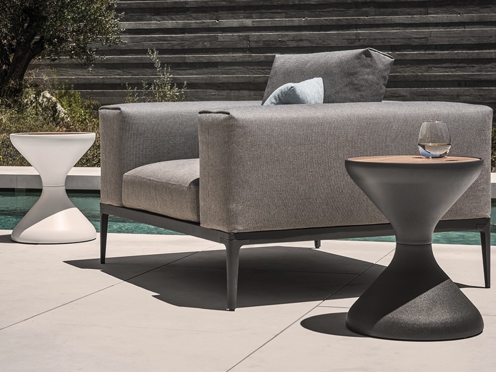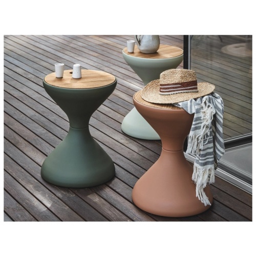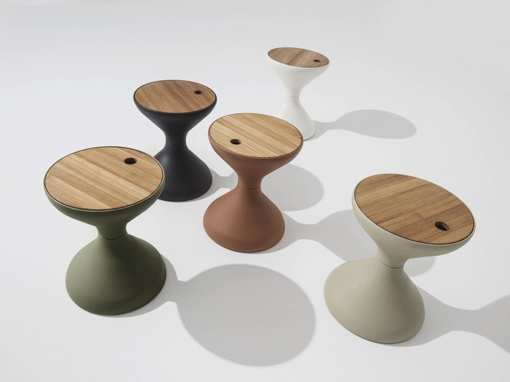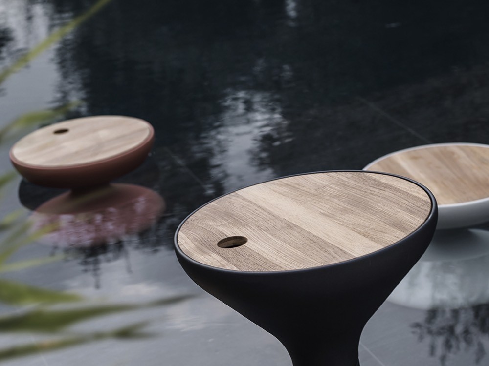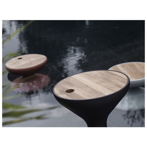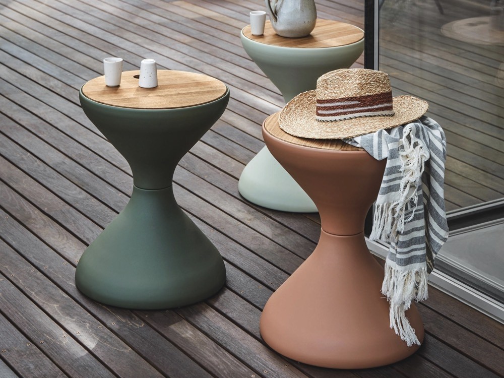 All sinuous lines and symmetrical forms, Bells plays homage to its namesake in typical Gloster style with a beautiful teak top and an industrial-looking frame. Available in a wide range of hues and models, it can customised with a removable top and ice-bucket insert for effortless alfresco dining.
