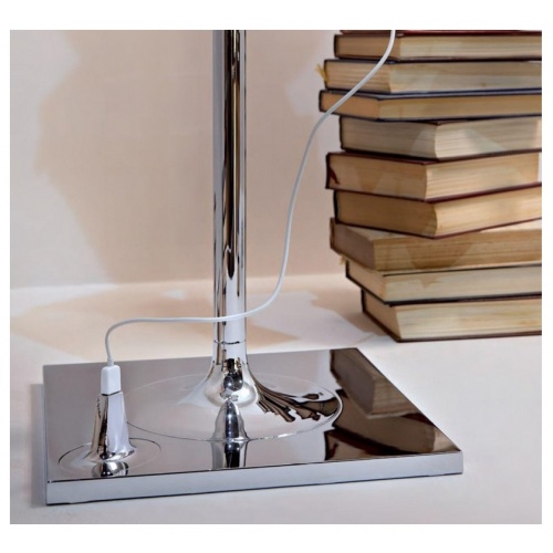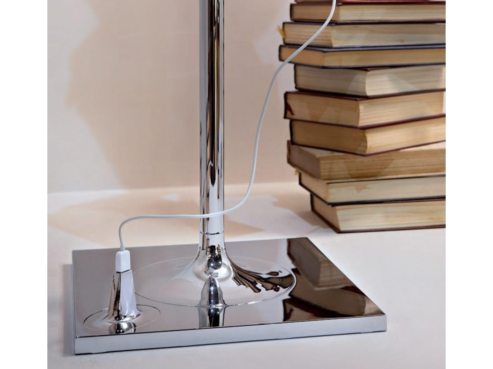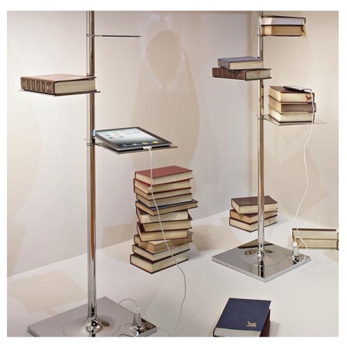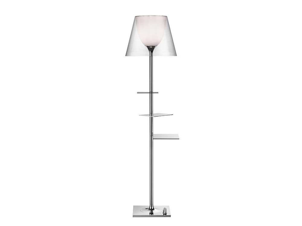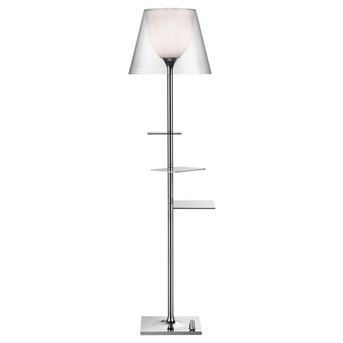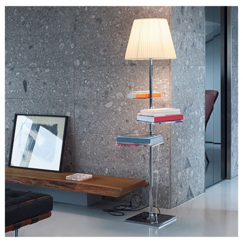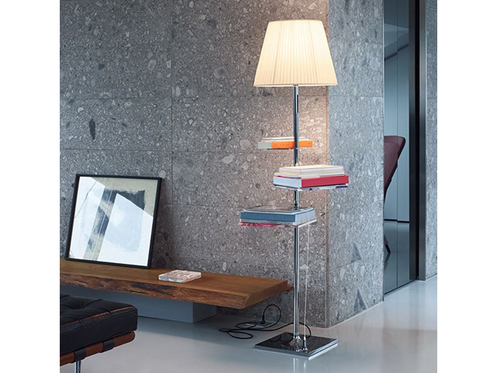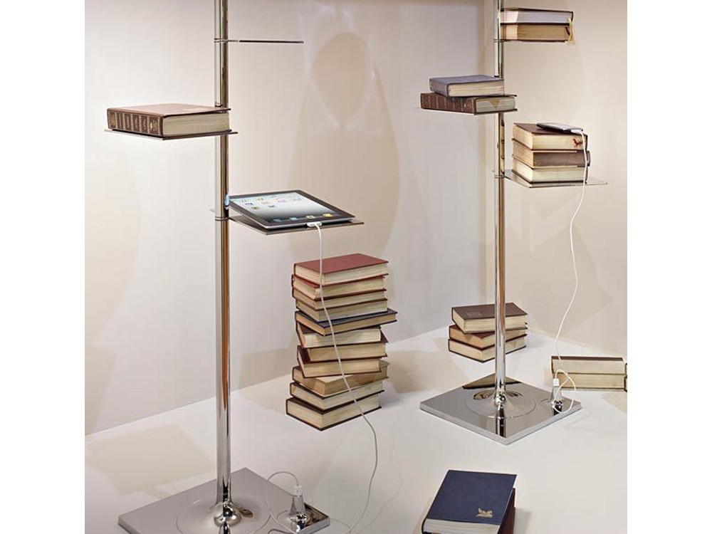 This standing lamp designed by Philippe Starck is also perfect as a bookshelf with its stainless steel shelves placed beside the central stem.