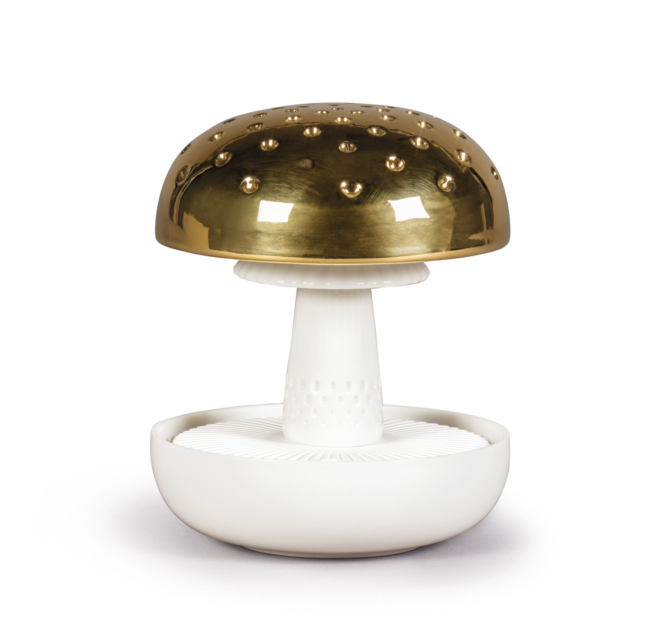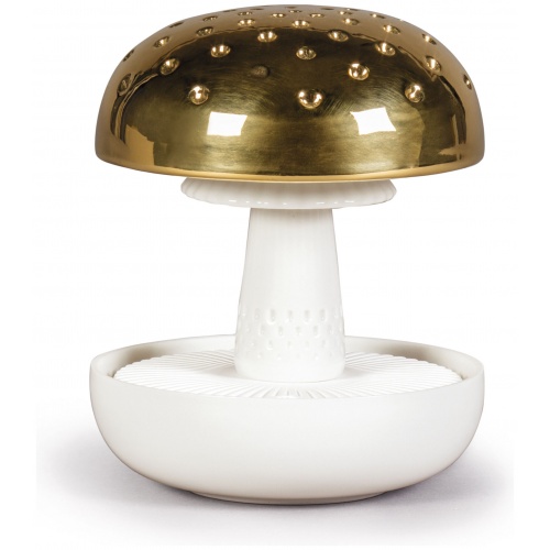 “Belonging to the Boletus Fragrans collection, this diffusor is made entirely with white matte porcelain decorated with golden enamels. When pouring the essential oil on the base, it perfumes the home with a pleasant aroma. The “”On the prairie”” is an exclusive fragrance with very special ingredients like blackcurrant, lotus flower and frankincense. It represents the magic of the night and the full moon.”
