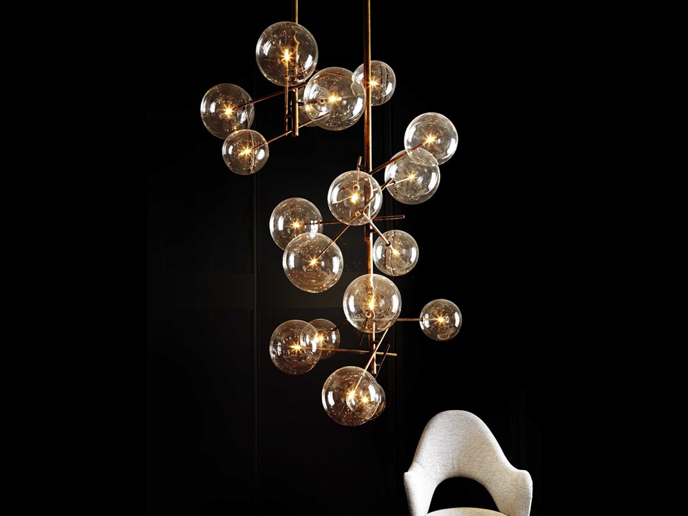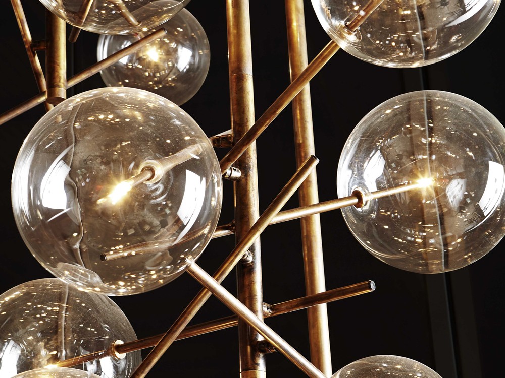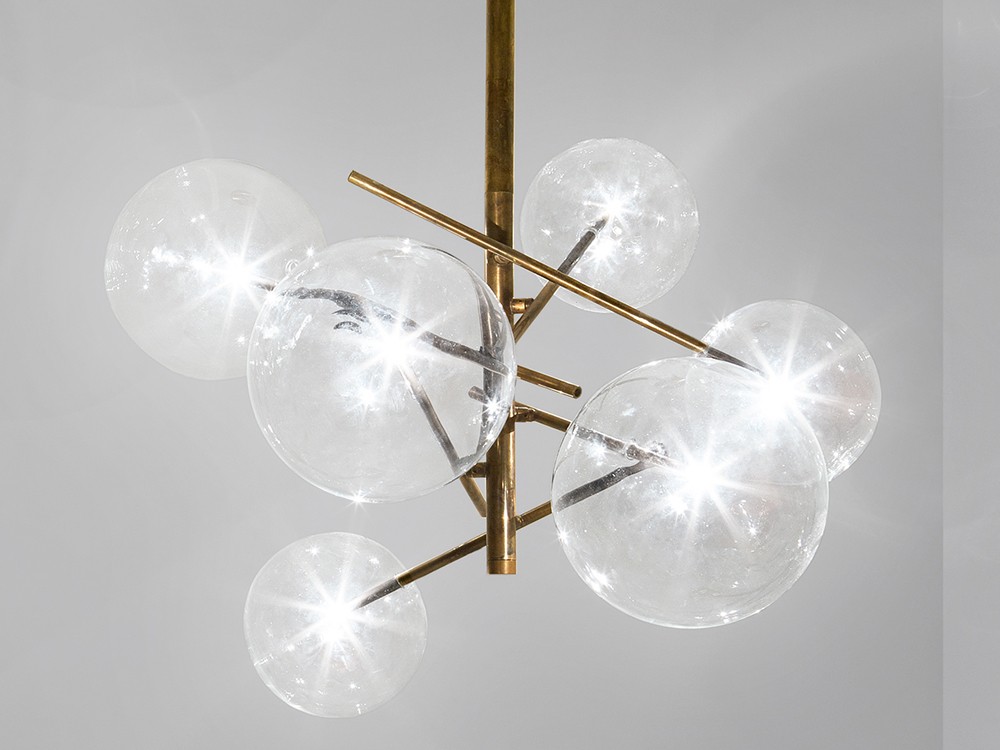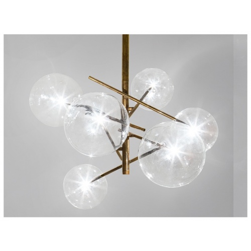 This glamorous pendant light features four or six small spheres crafted from clear glass which. These spheres beautifully reflect the hand-finished burnished brass frame.