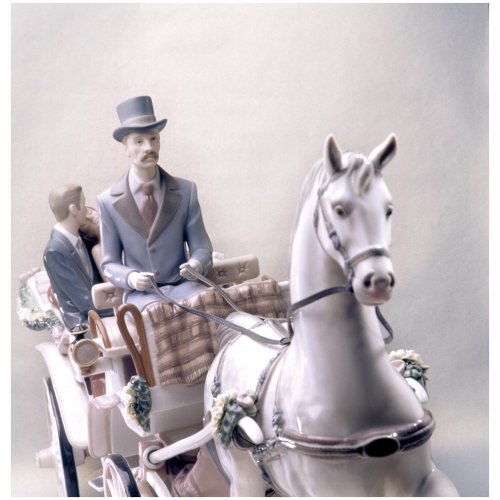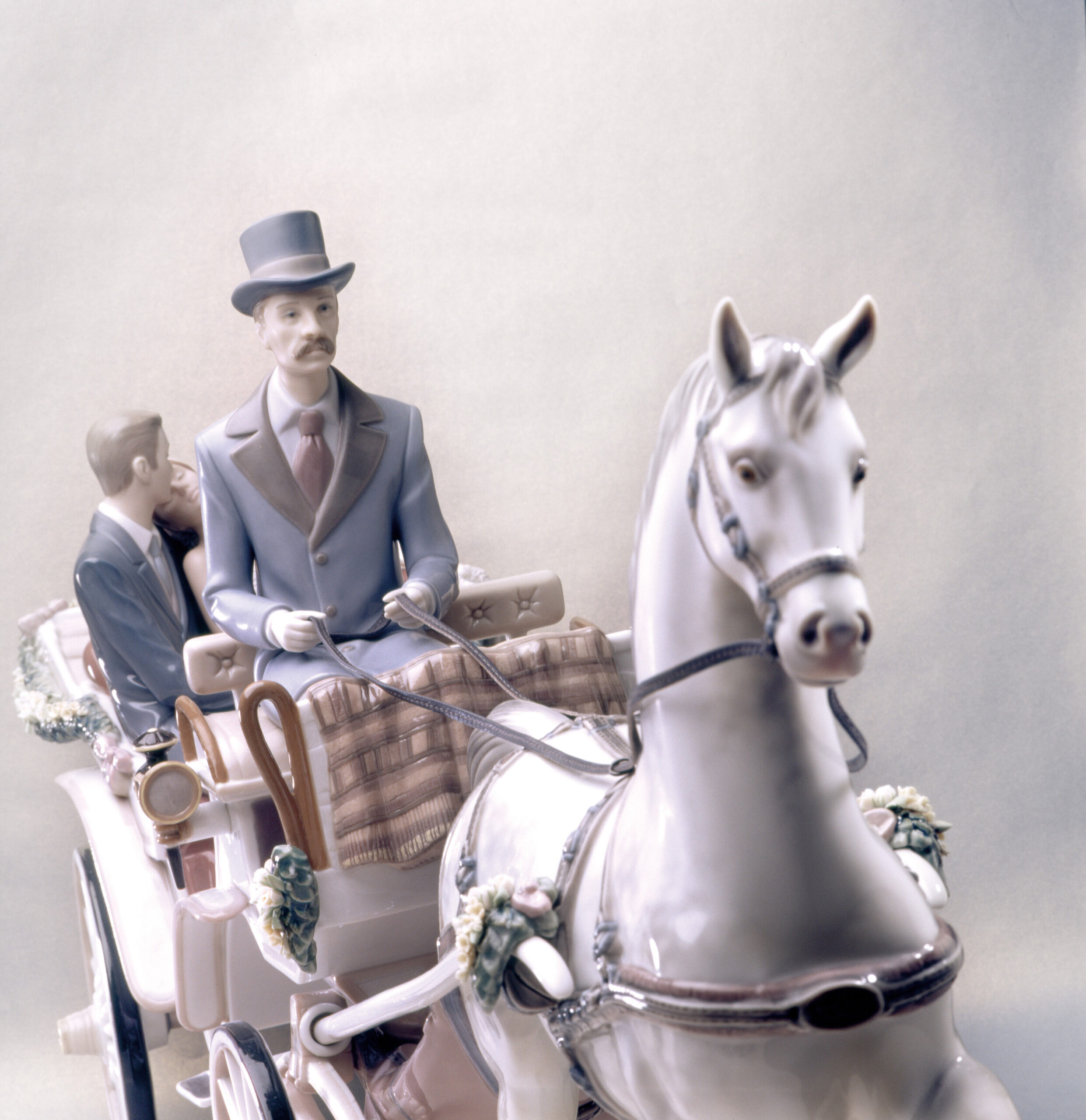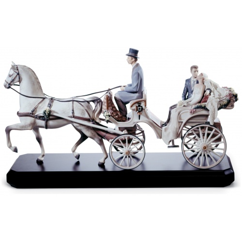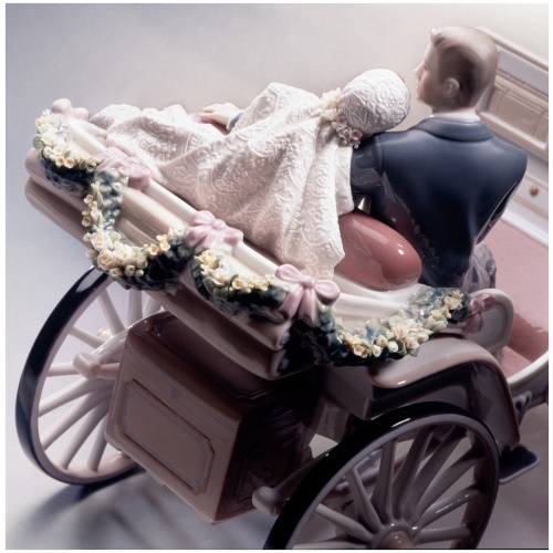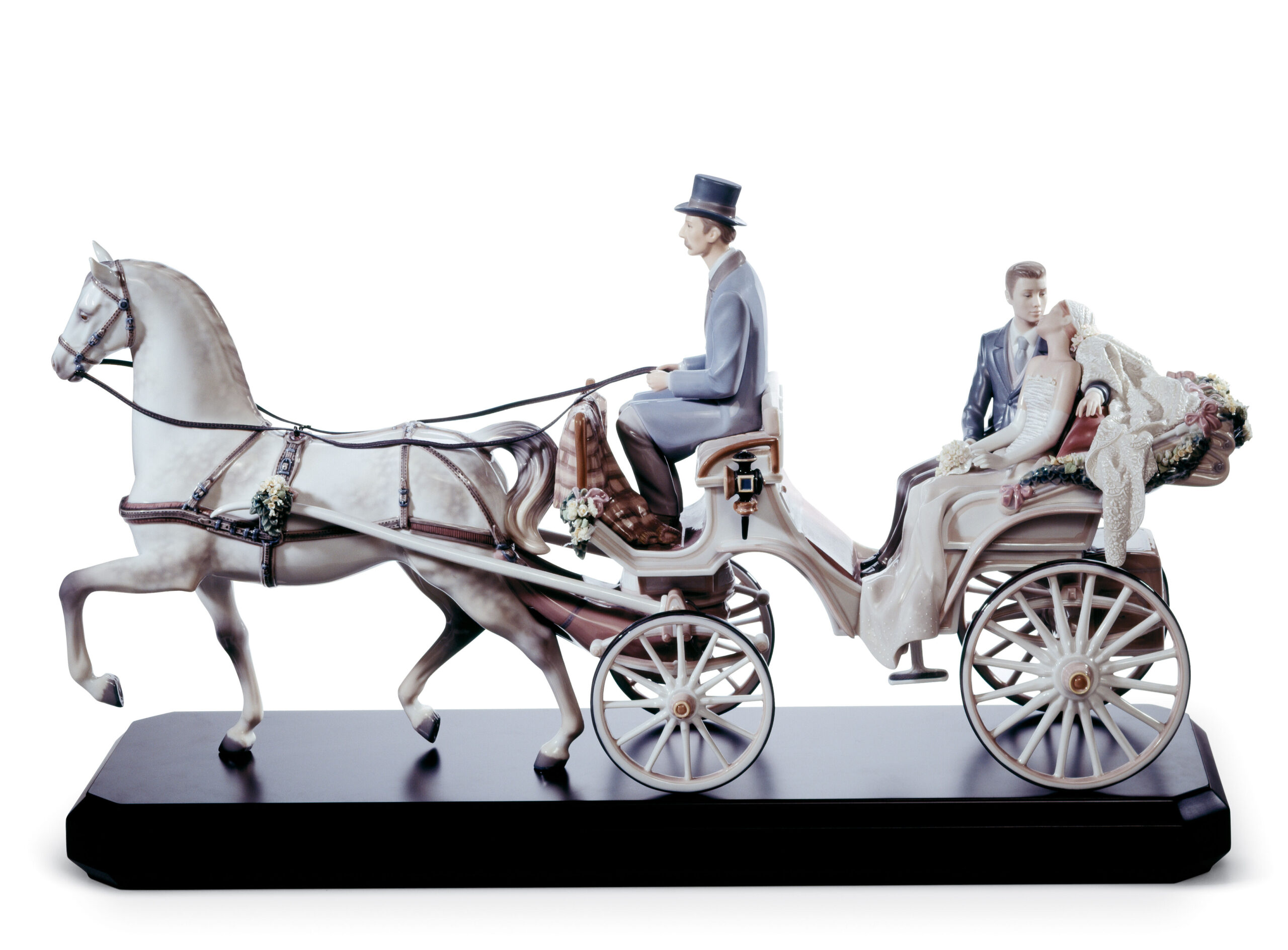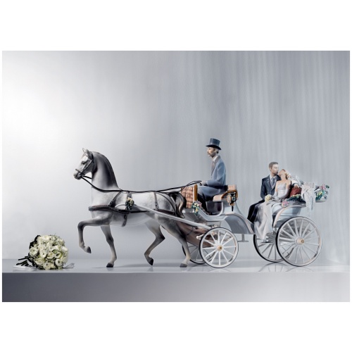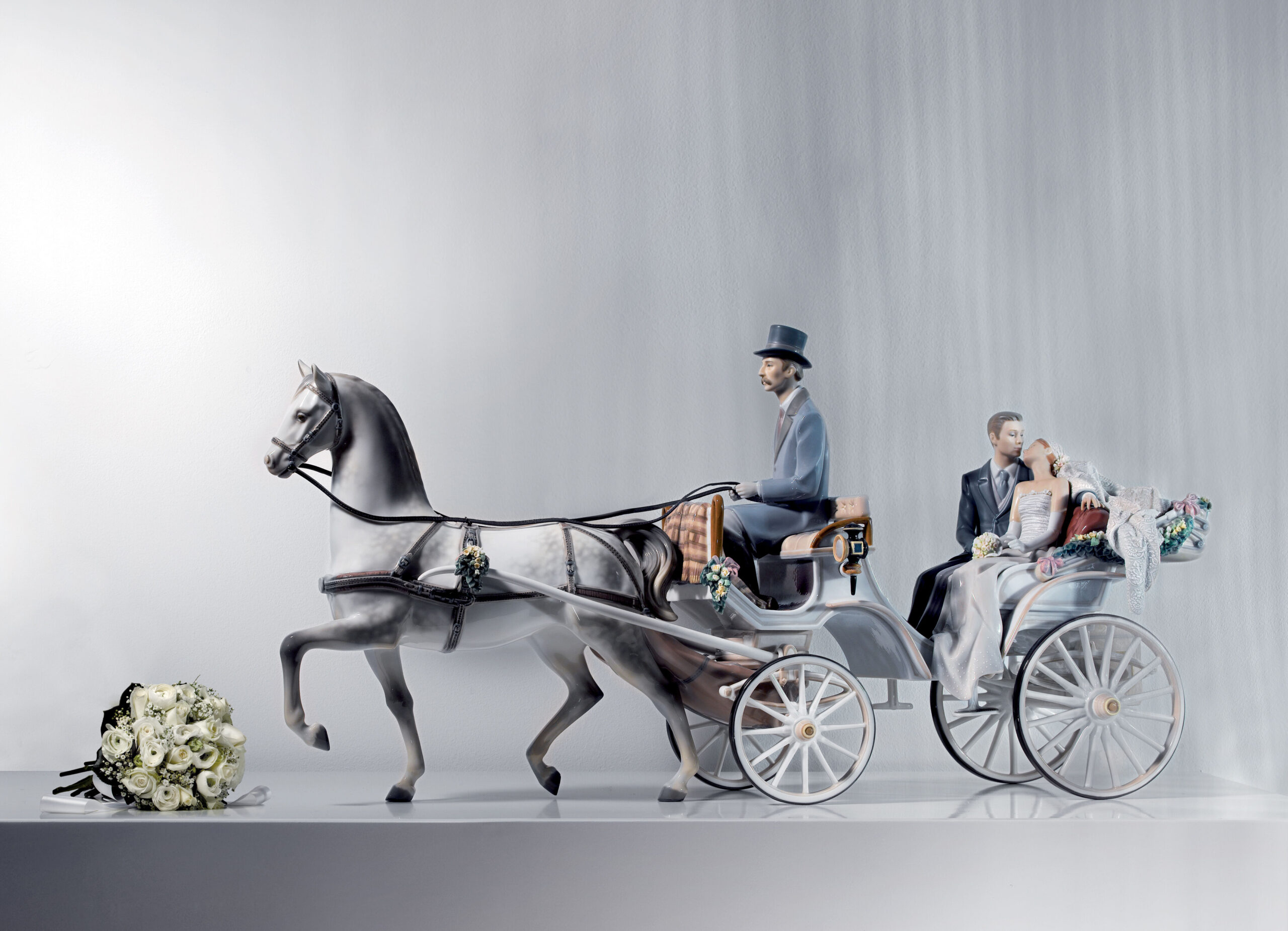 It is an unforgettable day, full of special moments to be remembered for a lifetime. Of these, the artist has chosen the romantic, evocative carriage ride in porcelain to immortalise the joining of a couple in love. This is a High Porcelain limited edition of considerable proportions, which has dispensed with the base upon which a piece of such characteristics usually rests, thus requiring the precise assembly of all parts in order to ensure the perfect balance of the whole piece. On a decorative level, it is an extraordinarily rich work, full of numerous details, such as the bride’s dress, flowers in the bouquet and headdress, and the ornamentation of the elegant carriage, inspired by a late nineteenth century model.