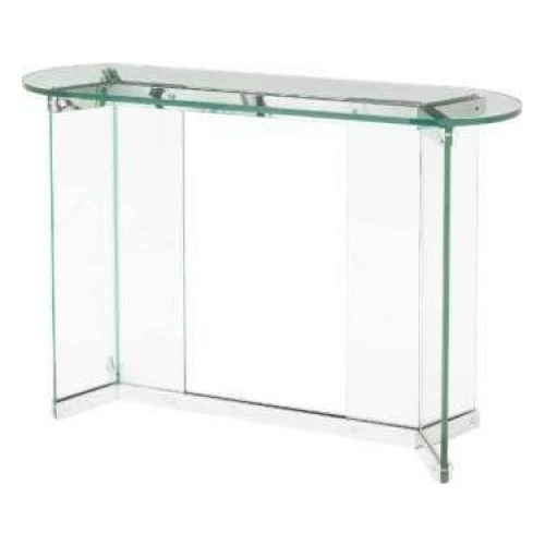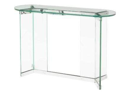 The Bruna Console finished completely in glass is a stunning modern design piece. It is a stand alone piece when placed in an apartment hallway. It also works well in the same interior setting as its matching end table (2144)