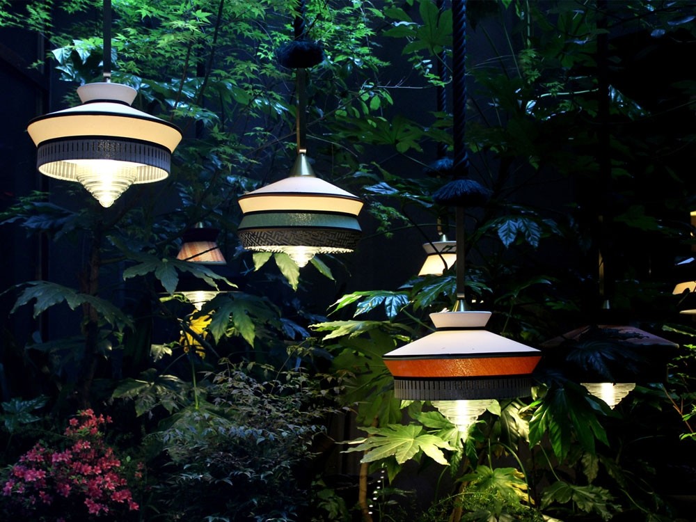 Calypso is a collection of outdoor lamps inspired by the musical hum of 1940s Caribbean culture. Traditional European Deco style, characterized by geometrical lines and black & whites, is twisted and revitalized, thanks to bright colours, patterns and twines.