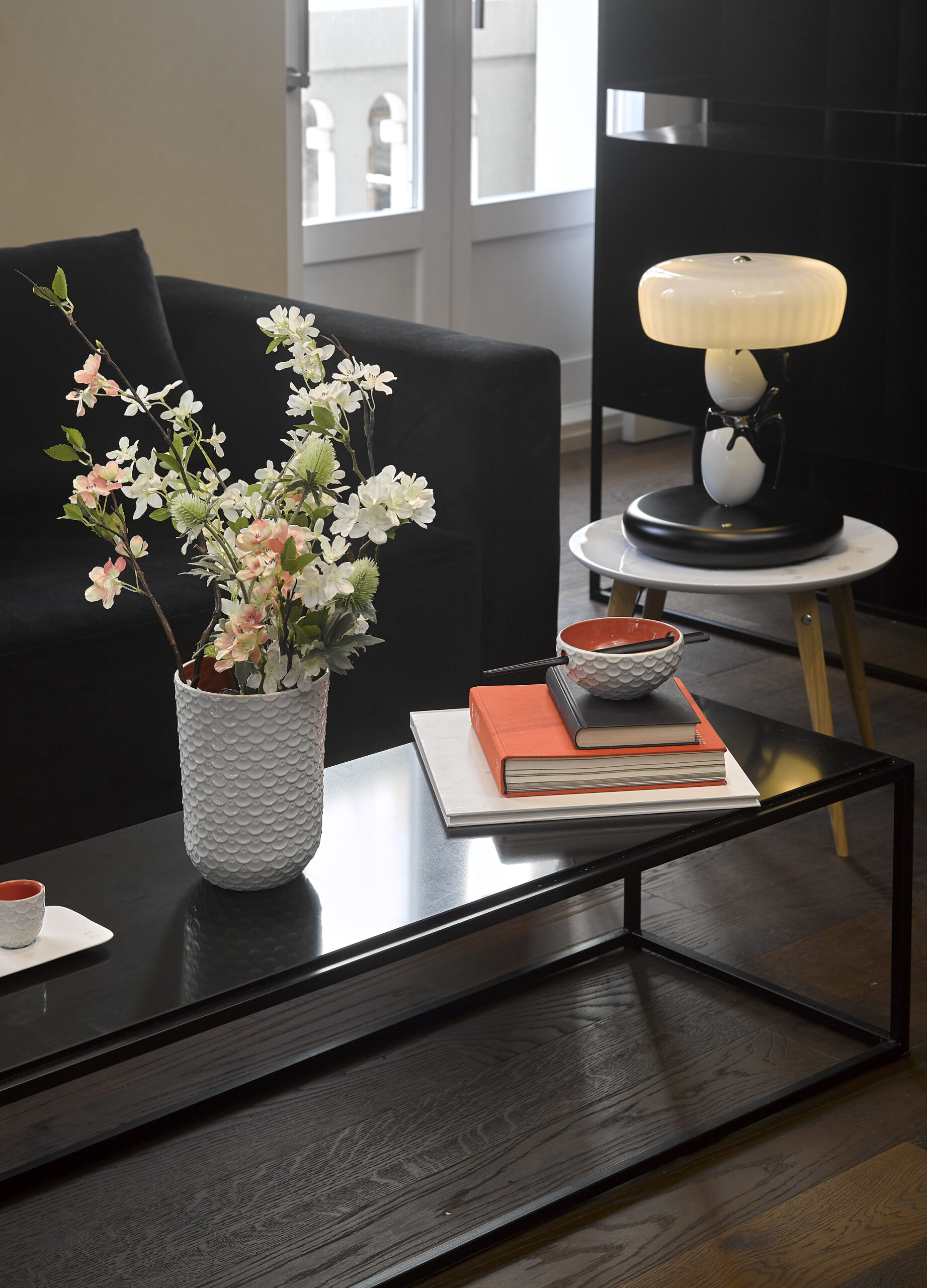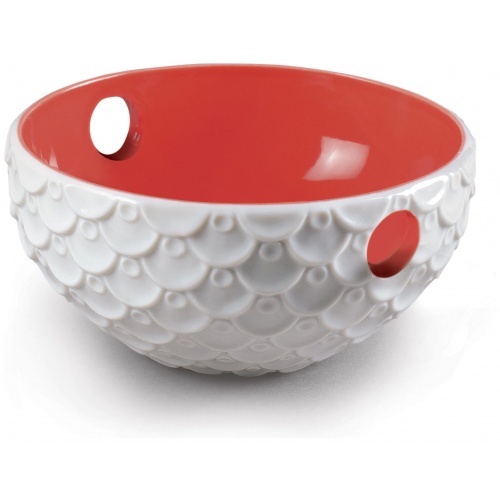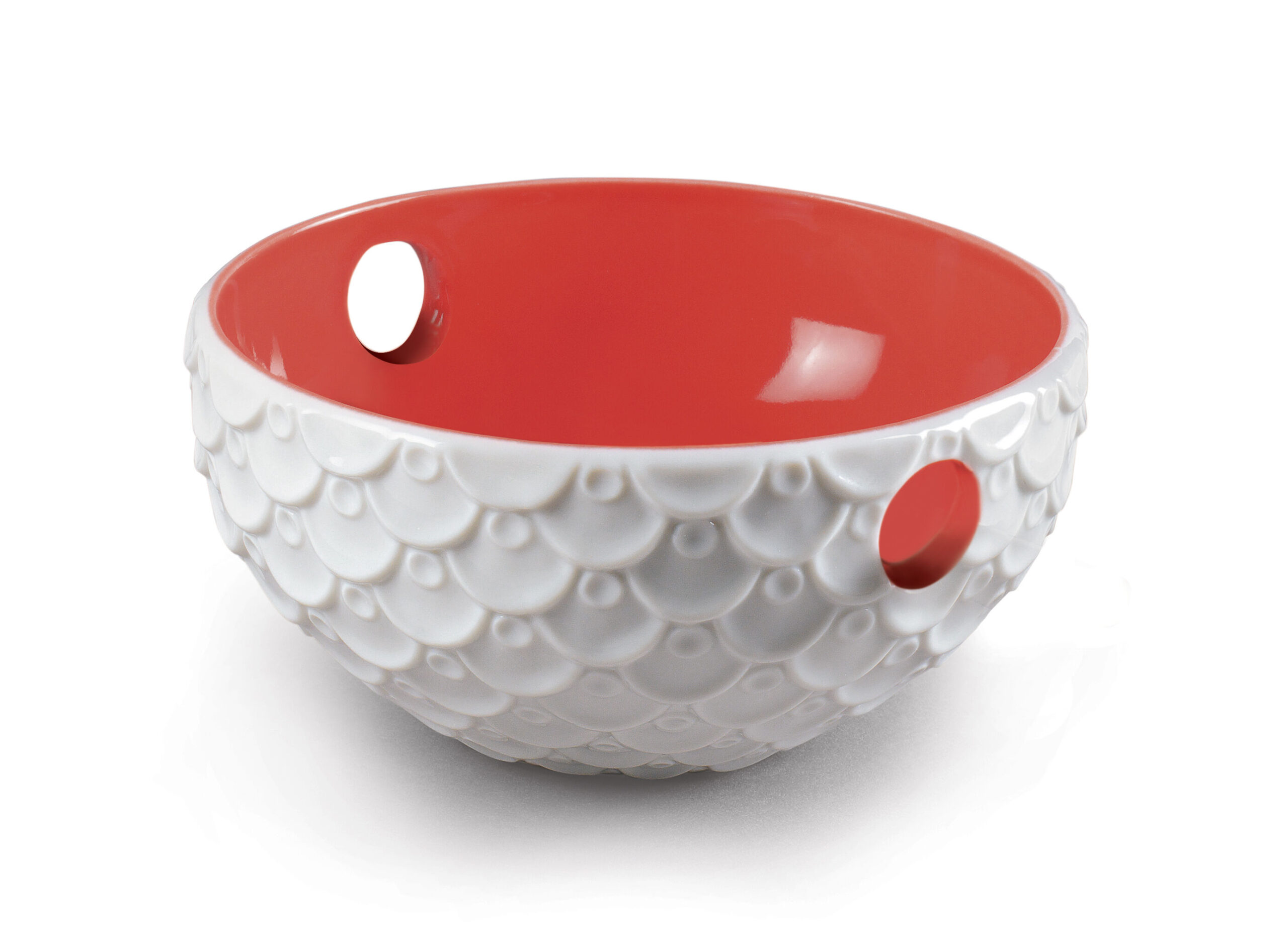 This bowl belongs to the Chinese Dragon Skin collection, inspired by the skin of the Chinese Dragon, representing a flaky texture. Finished in glossy white porcelain with a red decorated interior and holes in the sides to support the chopsticks. It can be used for both Japanese and Western cuisine.