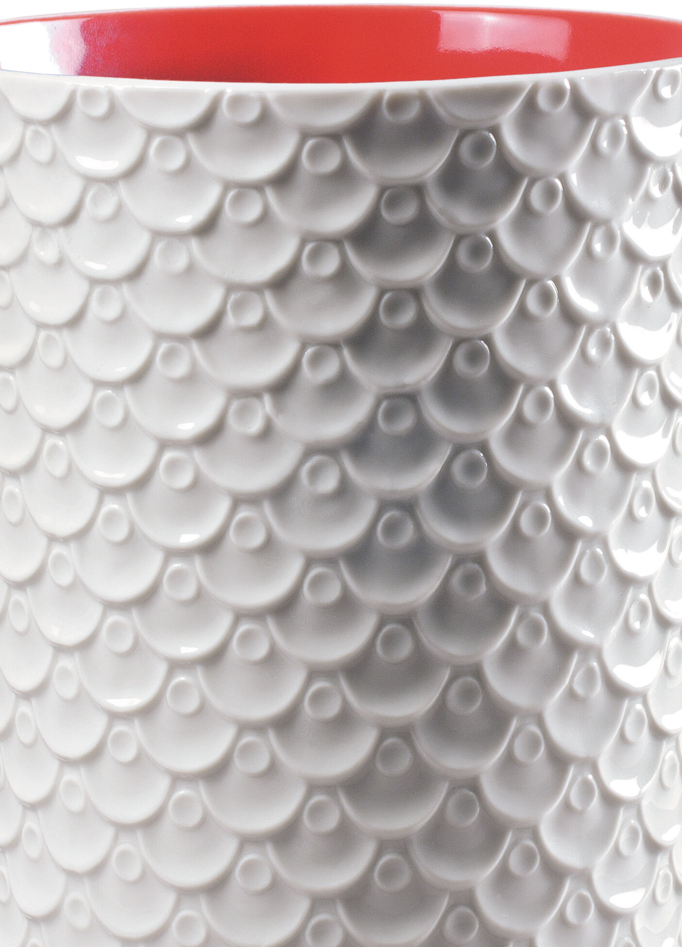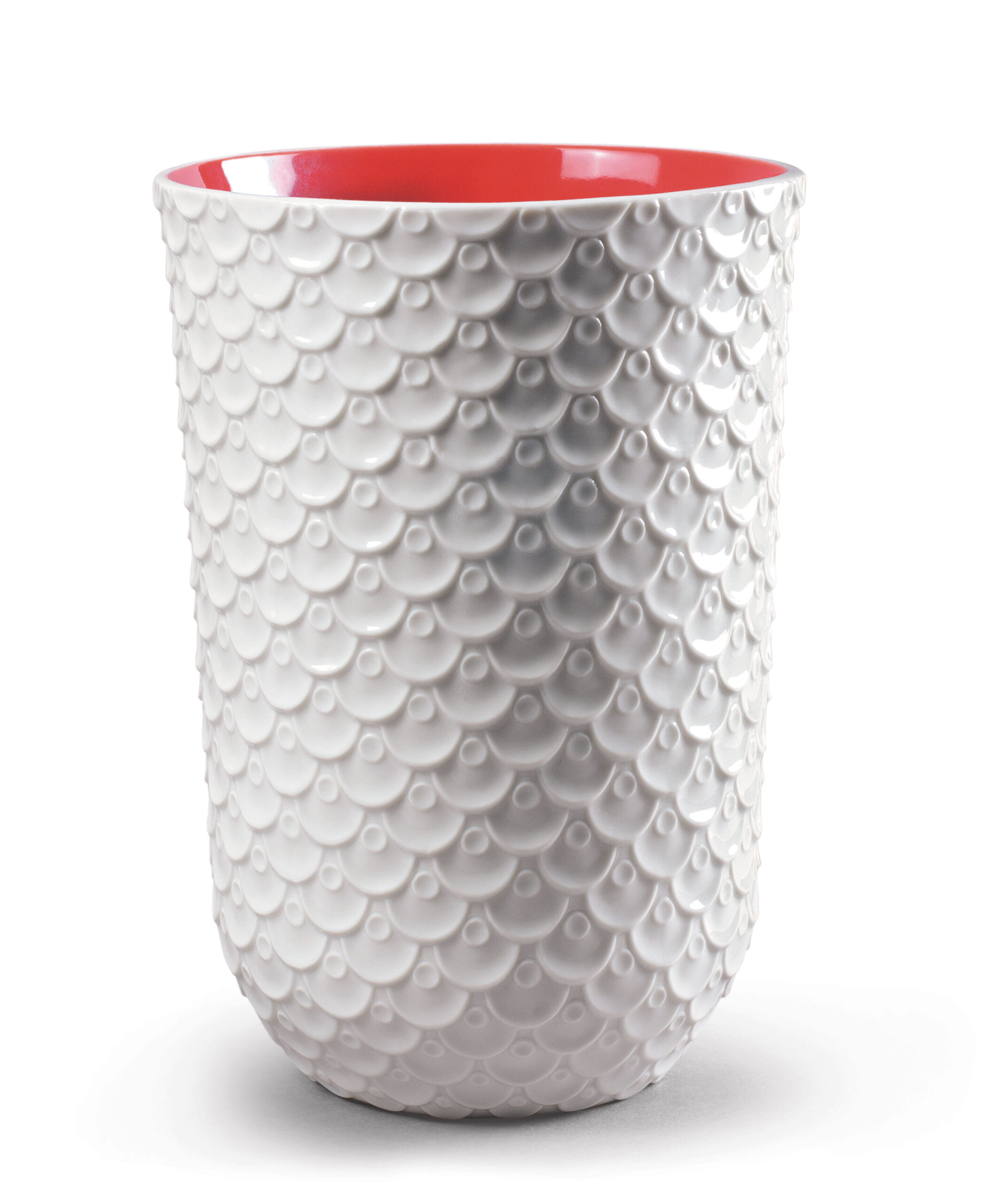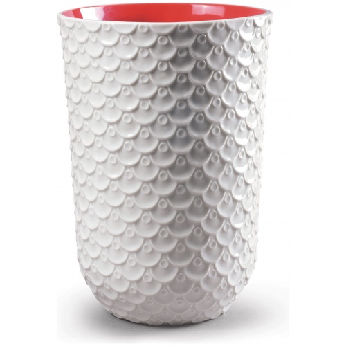 This vase belongs to the Chinese Dragon Skin collection, inspired by the skin of the Chinese Dragon, representing a flaky texture. White glossy porcelain finish with red interior decoration.It can be used for both Japanese and Western cuisine.
