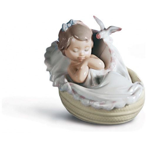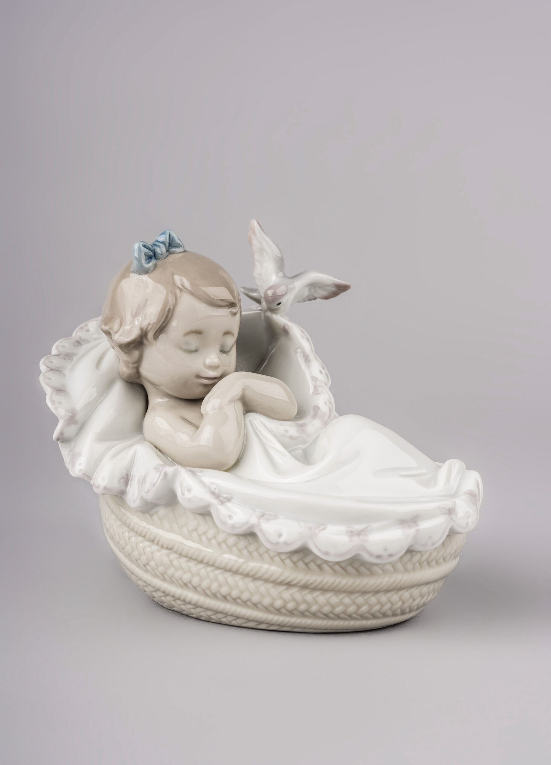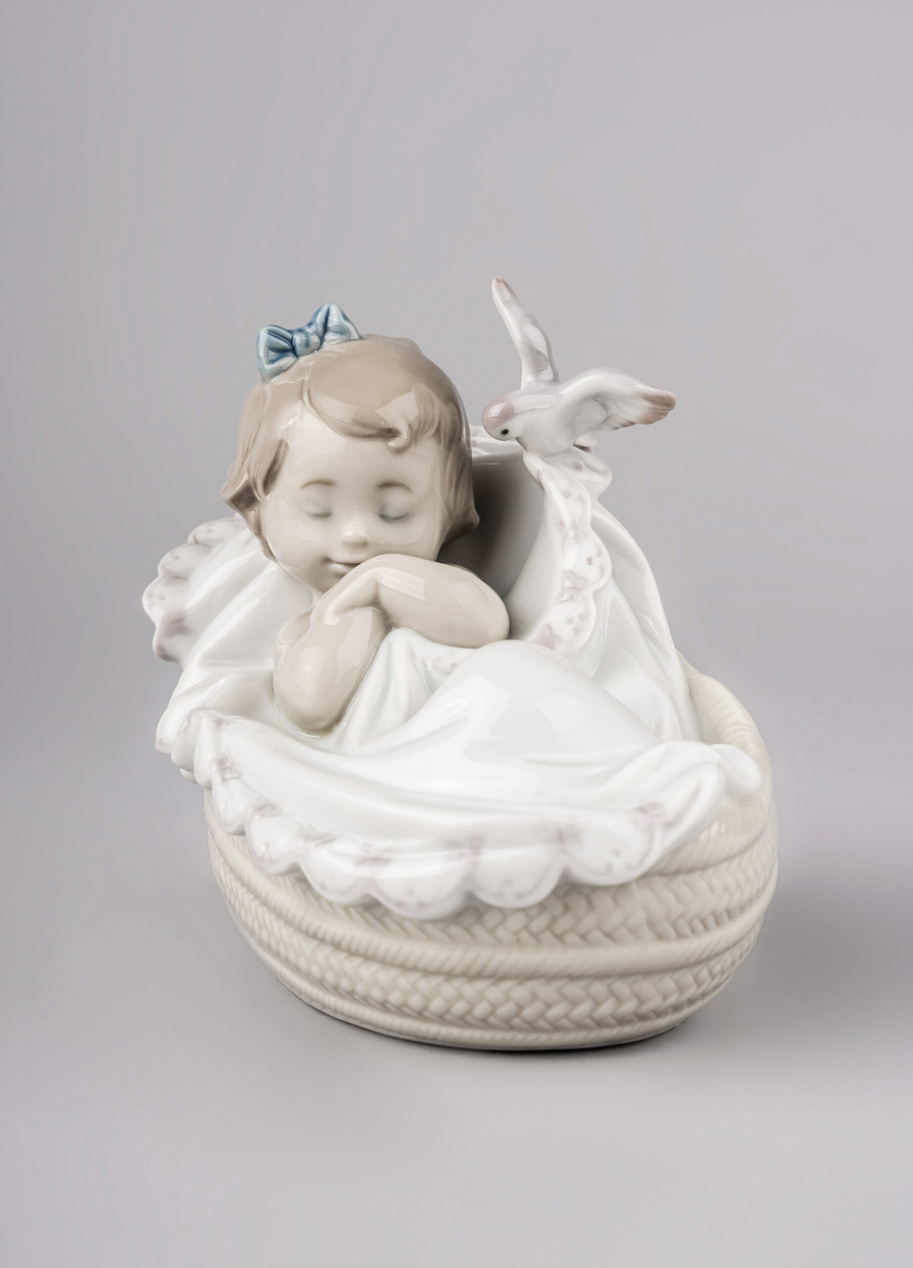 The sweet moment in which a girl closes her eyes and settles down to sleep, represented by a little bird that gently tucks her in. A scene full of emotion made in glossy porcelain, perfect to give as a gift, to keep as a memento of the birth of a baby or to collect.