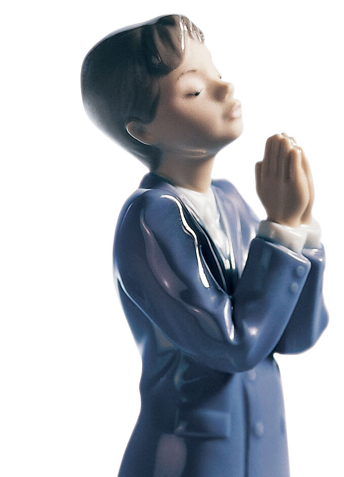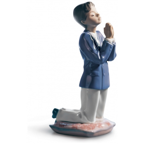 It’s a very special day, the whole family is gathered and he feels happy and radiant in his handsome suit. A glossy porcelain piece, finished in soft pastel shades, the perfect gift for a boy on the day of his first communion.