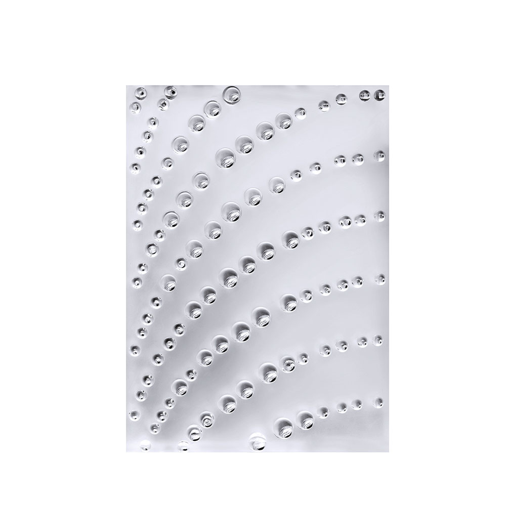 These panels, specially designed by René Lalique in 1935 at the request of a client, represent a spray of droplets gushing from the transparent satin crystal.