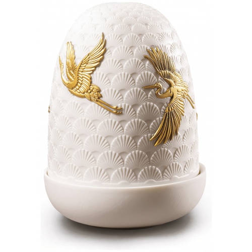 Cranes Dome lamp is a new line of lamps based on the technique of lithophanies. When turned on, the light projects the motifs emitting a warm and suggestive glow that invites to calm, to relaxation with a welcoming effect. His engravings highlight the shapes of golden cranes cramming across the sky.