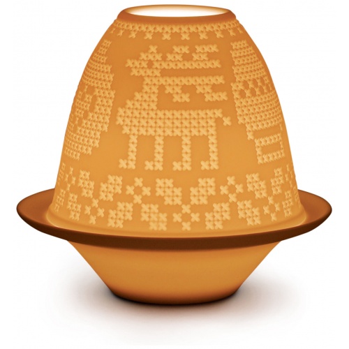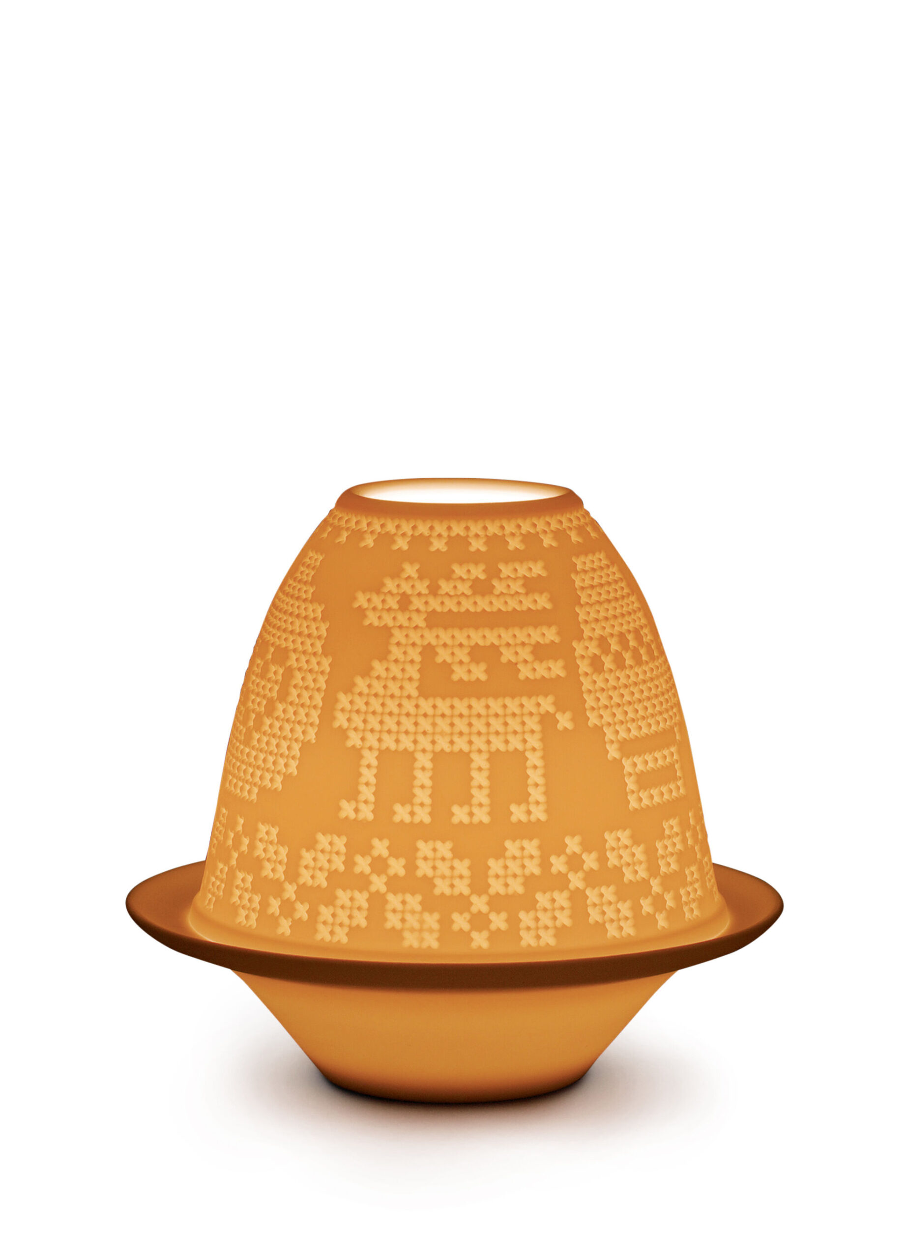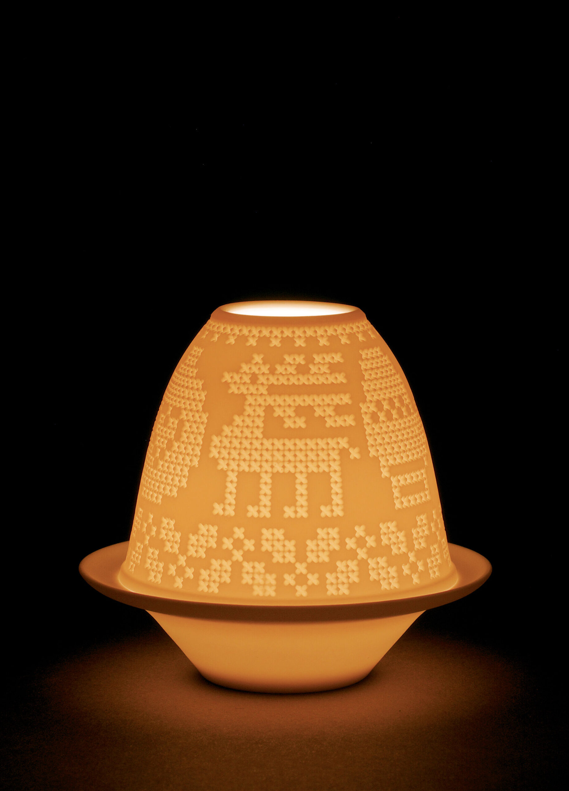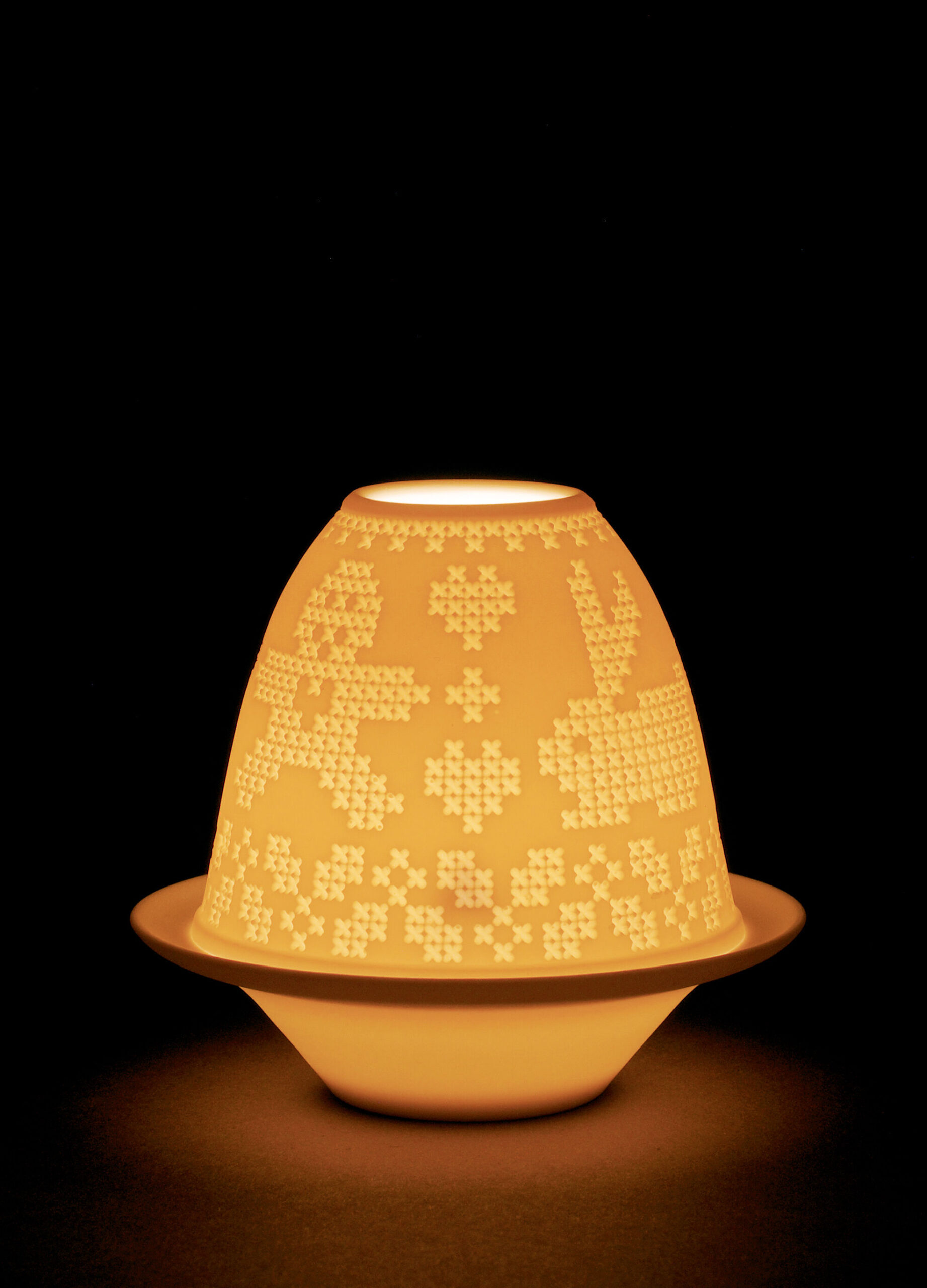 The magic of lithophany is born from the play of light with the translucent character of porcelain. By illuminating its interior, it projects warm lighting throughout the room and highlights the engraving that decorates it, producing surprising relief effects on its surface. This piece is decorated with an ornamentation inspired by homemade cross-stitch embroidery. Perfect to give as a present and to fill your home with a family atmosphere in parties throughout the year.