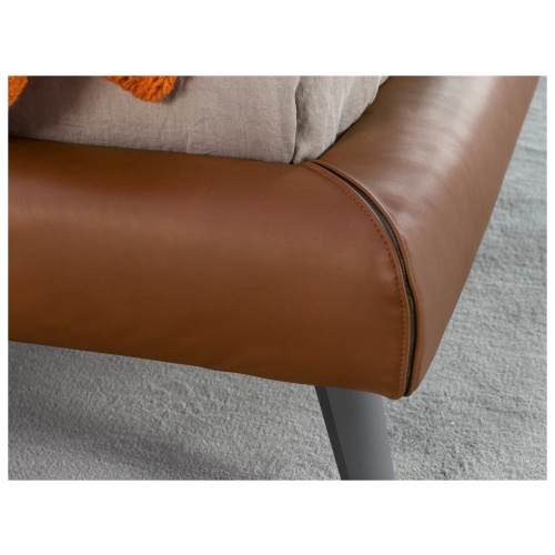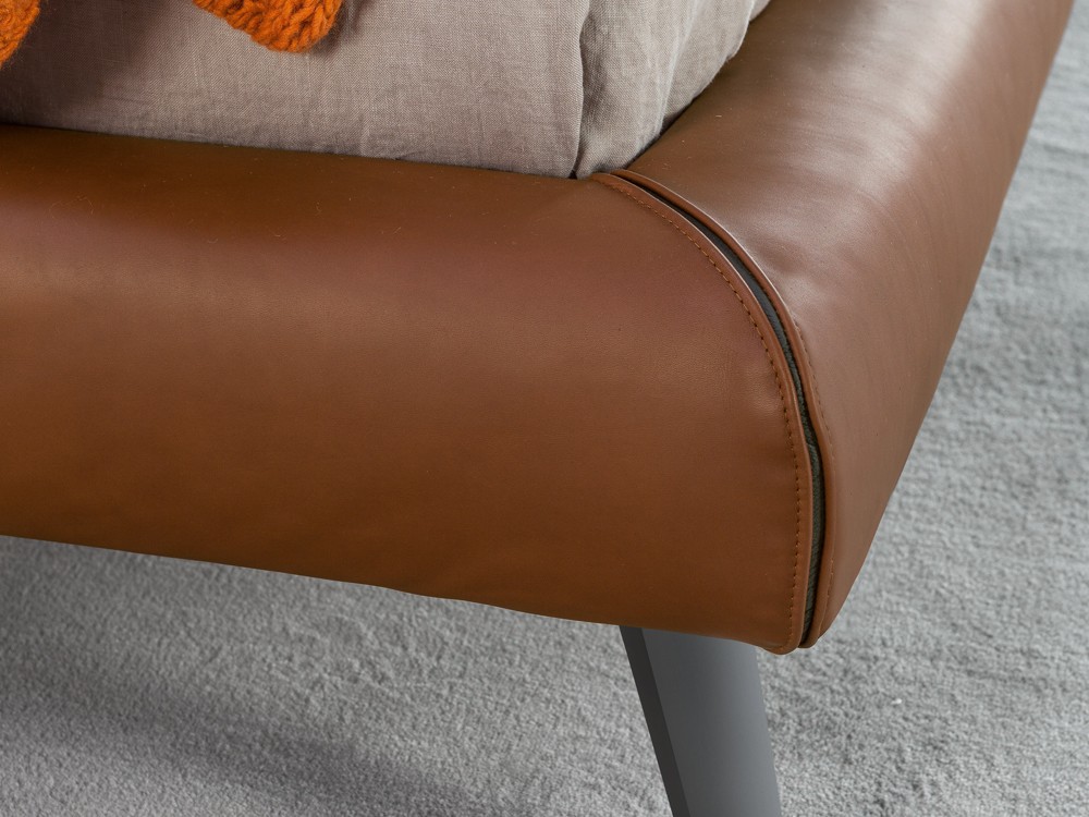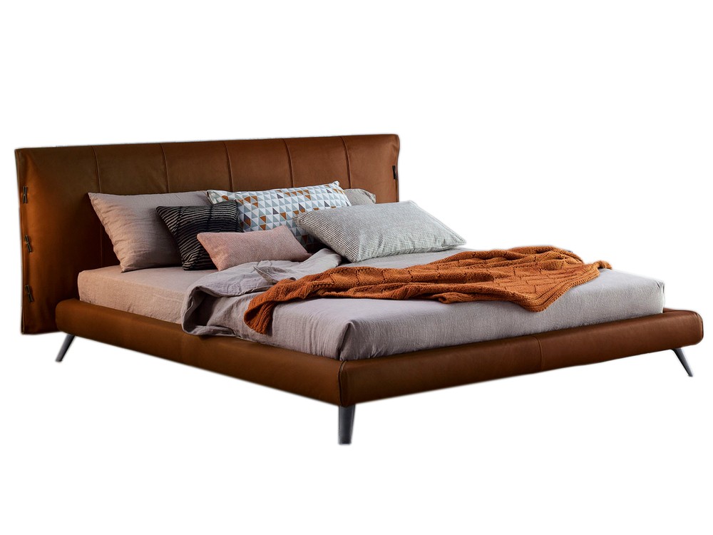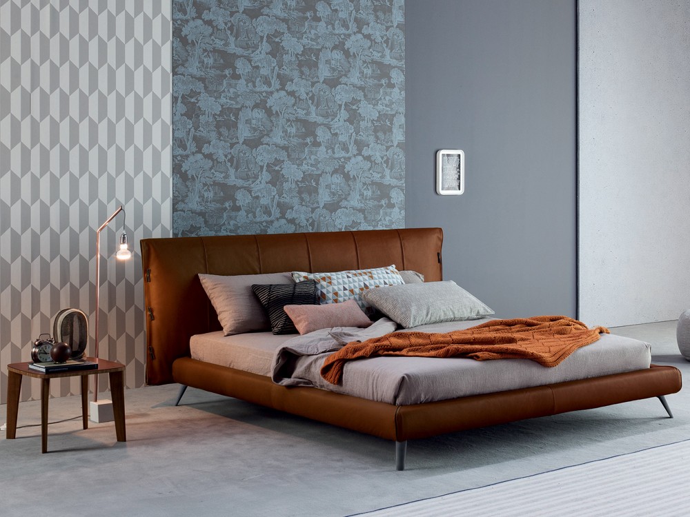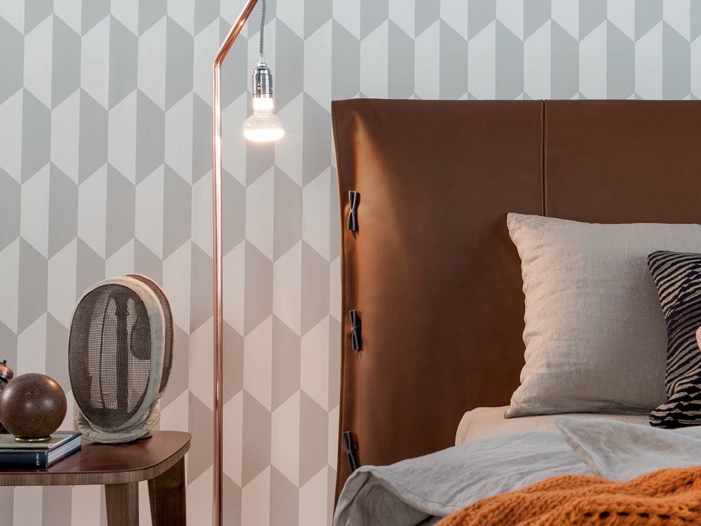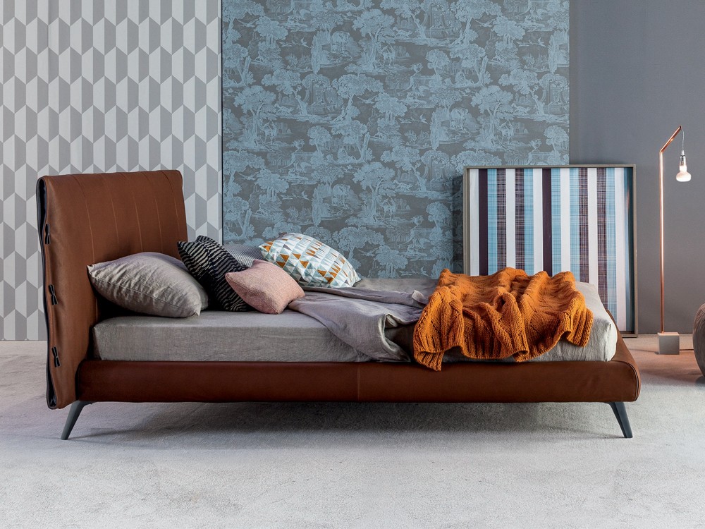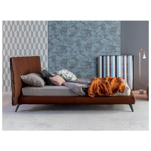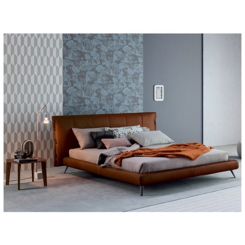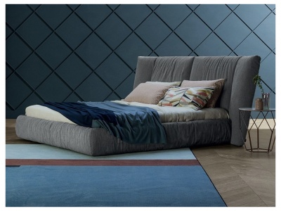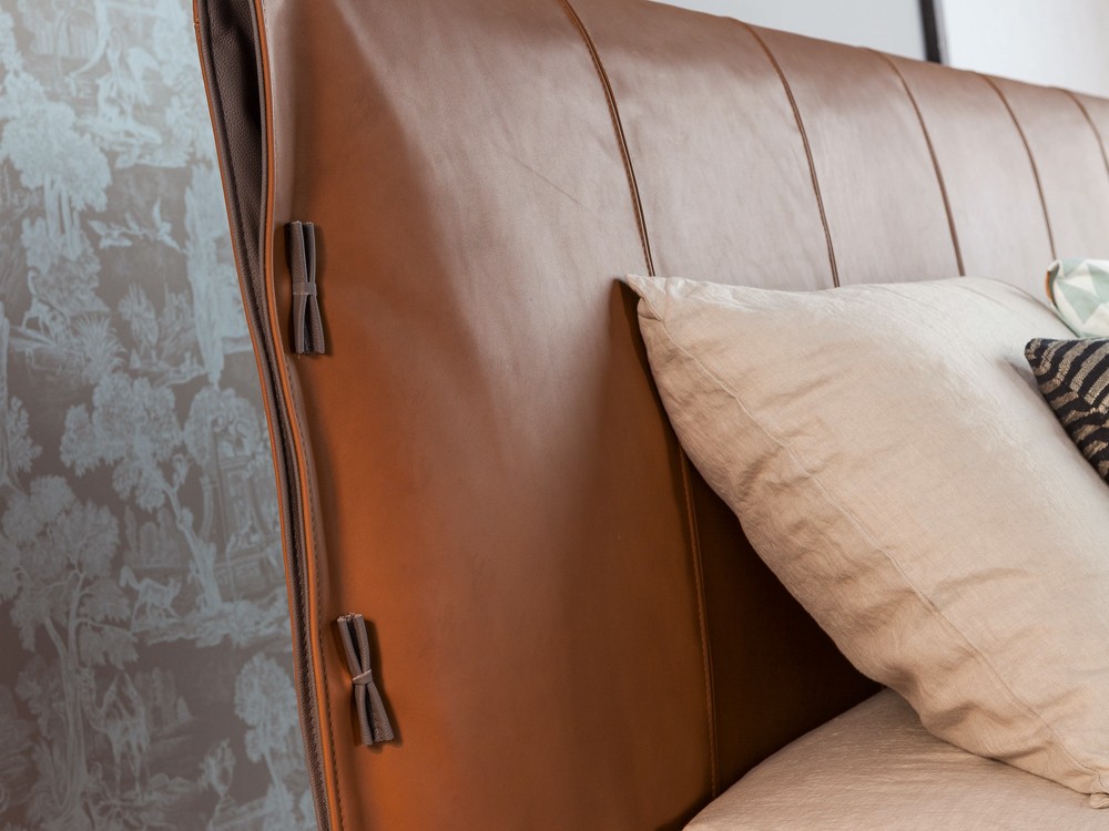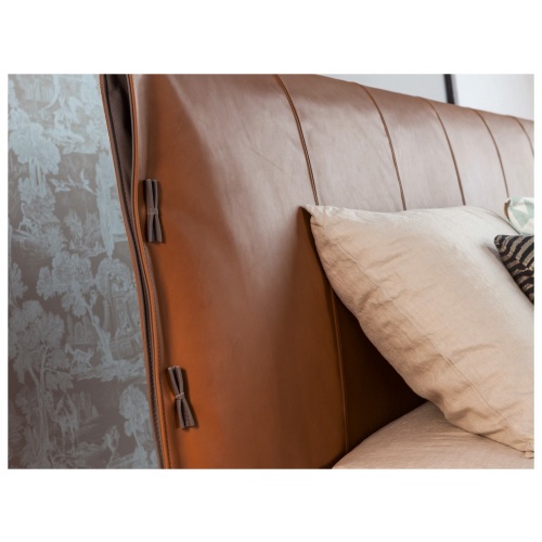 The Cuff bed expresses its strong personality in the tailoring details: from the frog fastenings that adorn the two flaps which cover the padded headboard, to the pleating that marks the vertical pattern of the back panel cover.