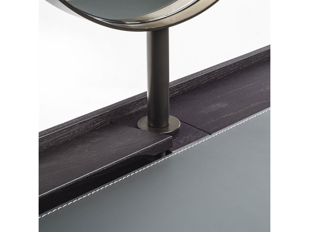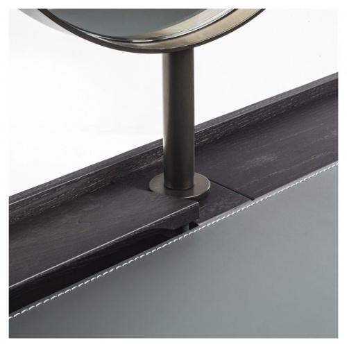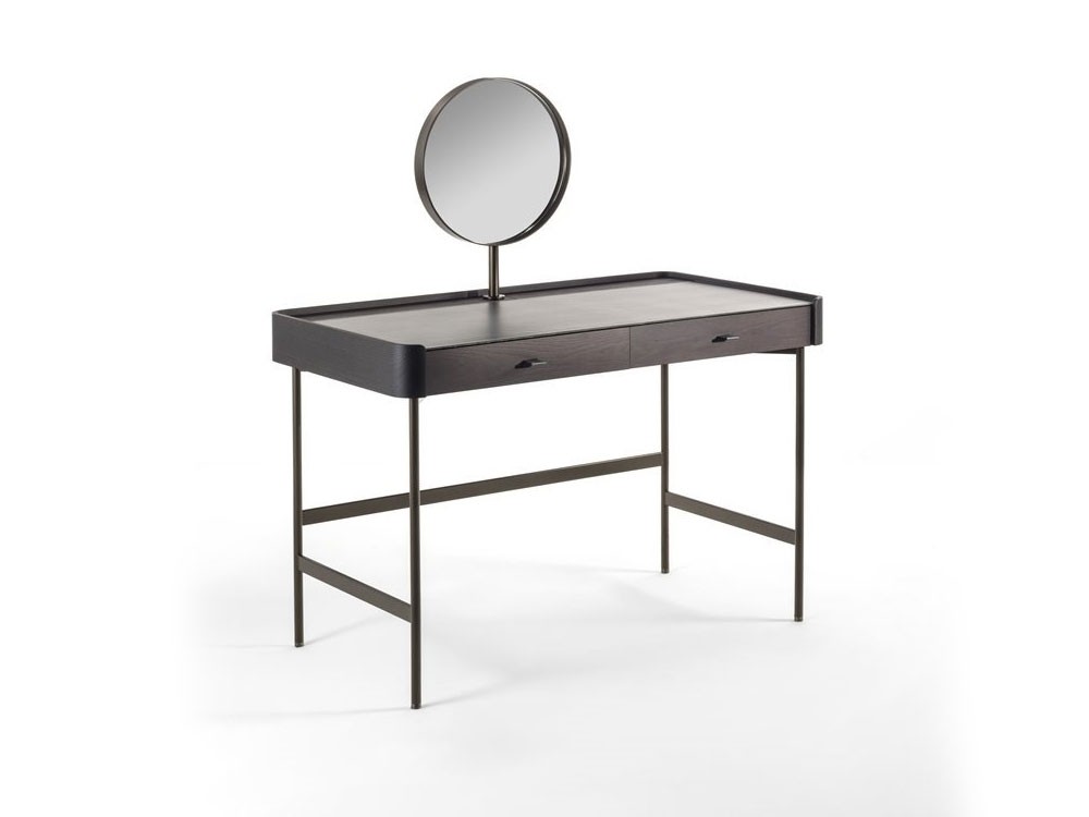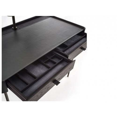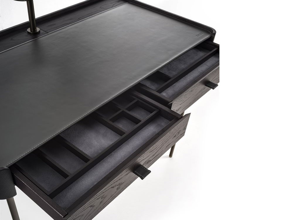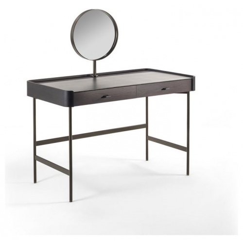A solid ash dressing table featuring two storage drawers finished with a bronzoro metal structure and leather top. Mirror Included.