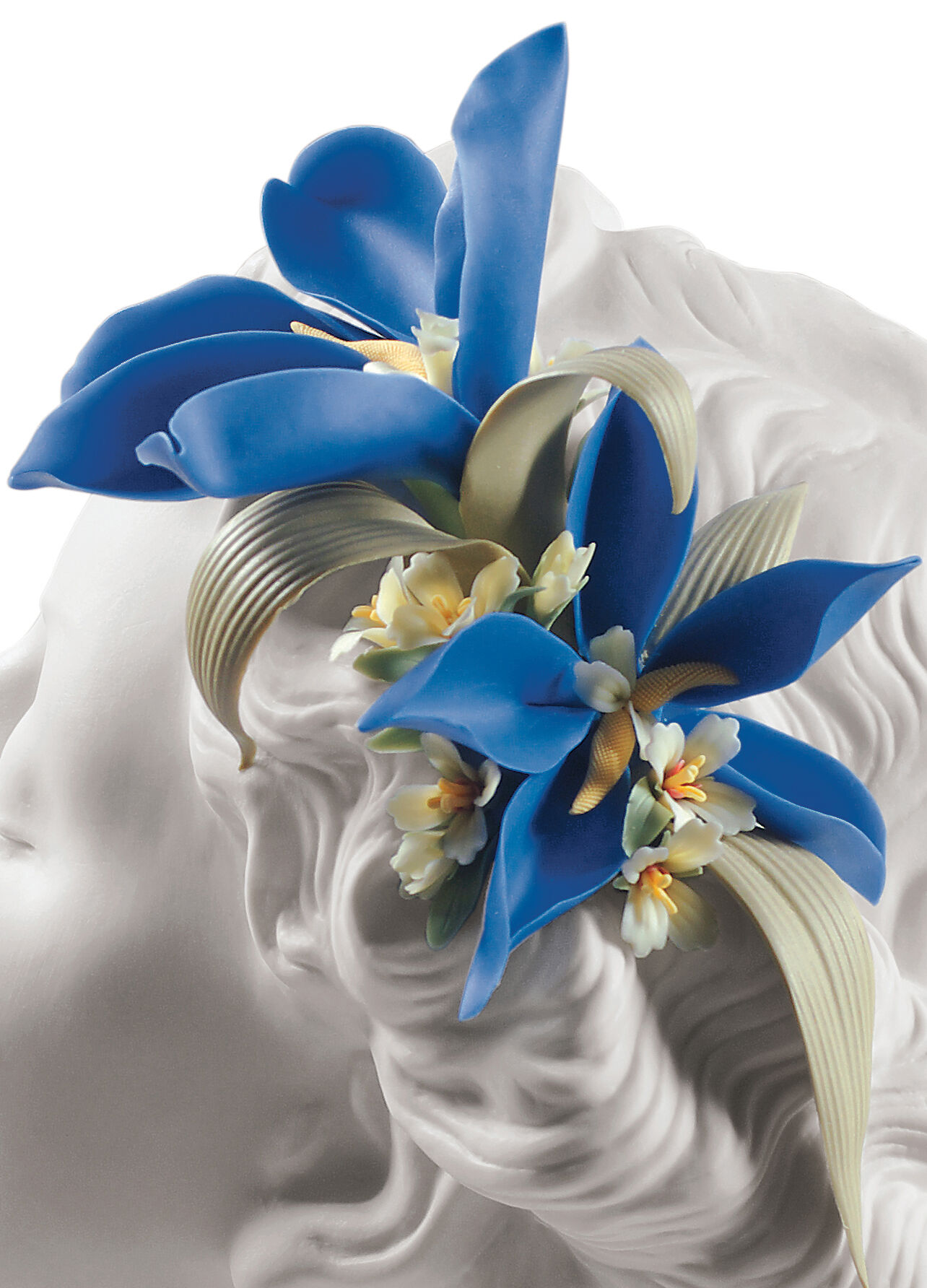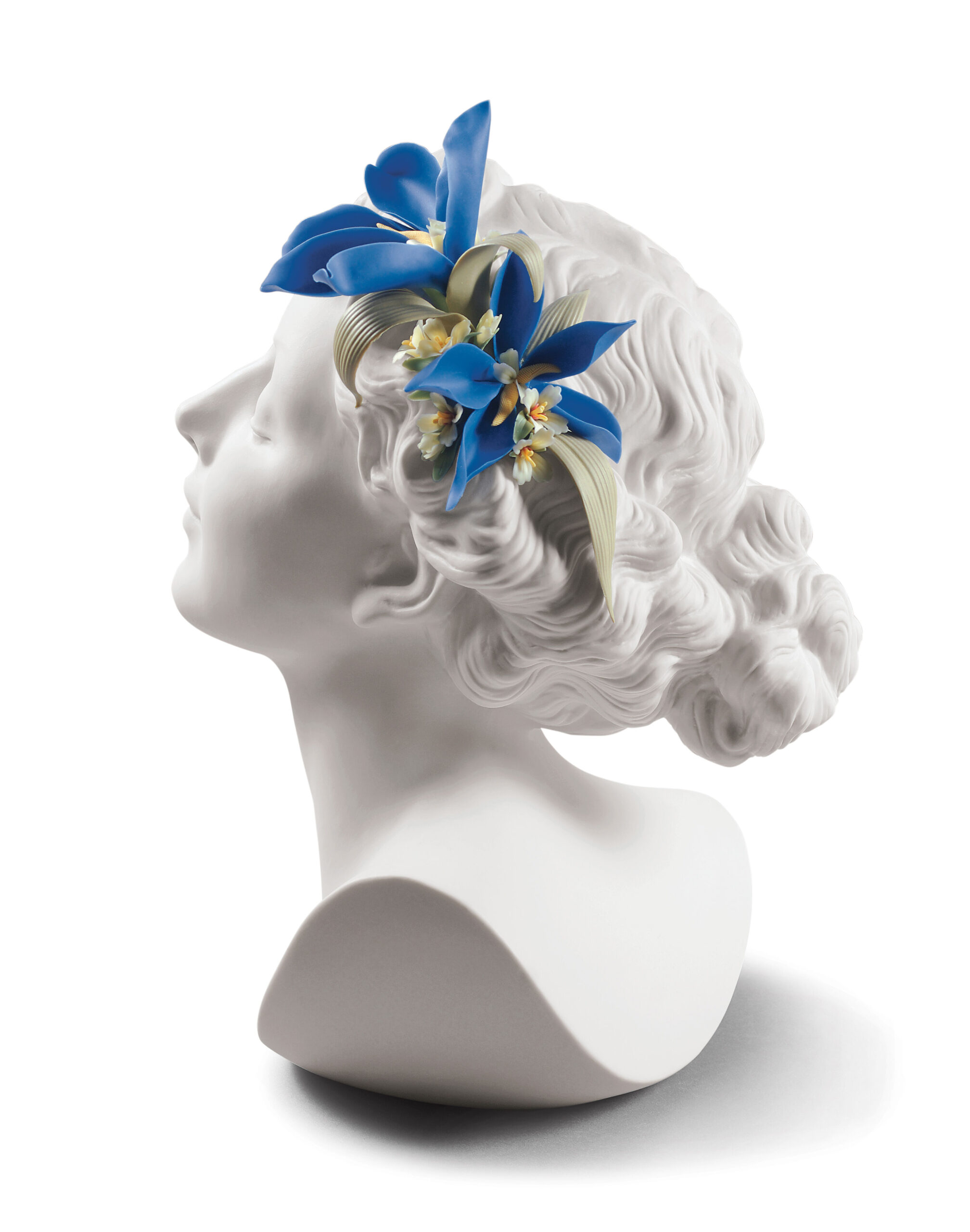 The classic beauty of this creation, enhanced by the flourish of a floral composition bursting with colour, contrasts with the white of the bust. A matte white porcelain piece with intense colours in the flowers and a strong decorative impact.