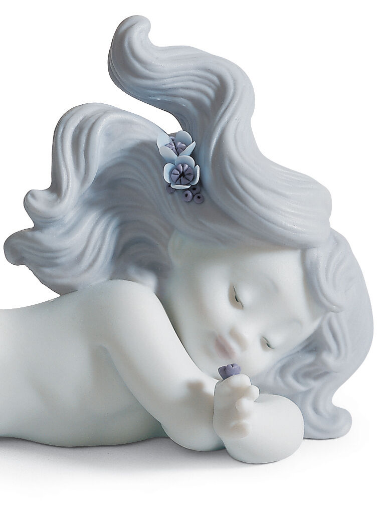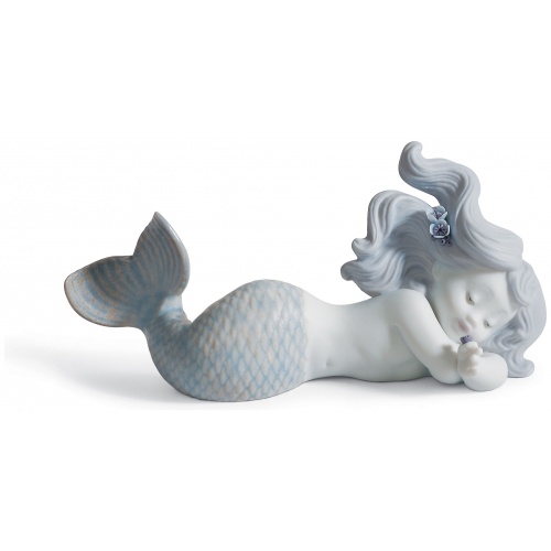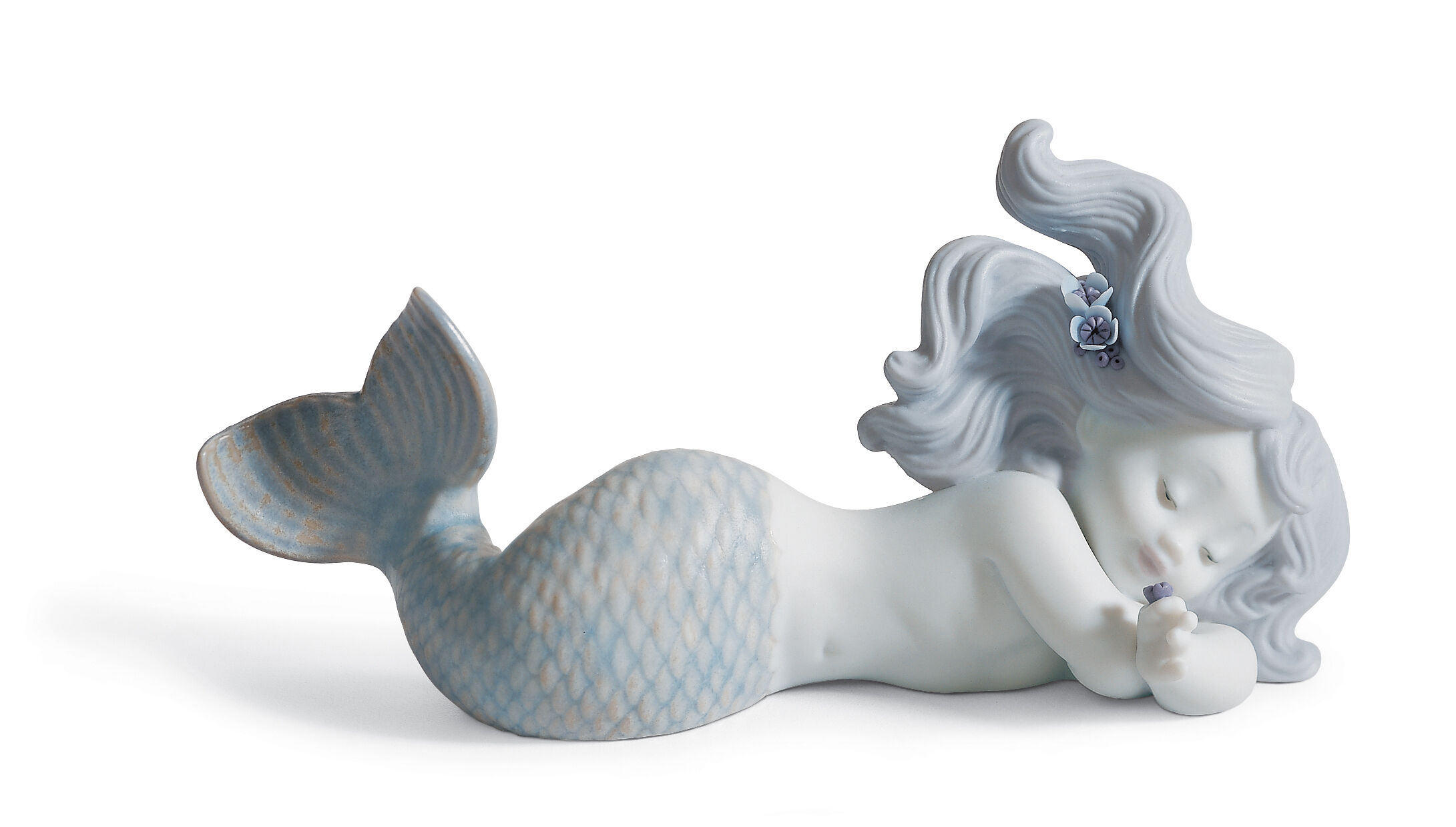 This sweet little mermaid languidly contemplating a flower transports us to an underwater fantasy world full of wonders. A matte porcelain piece, decorated in soft pastel colours, perfect as a gift, collectible or decoration.