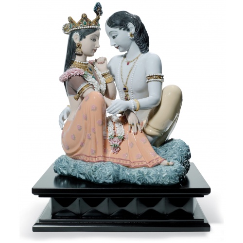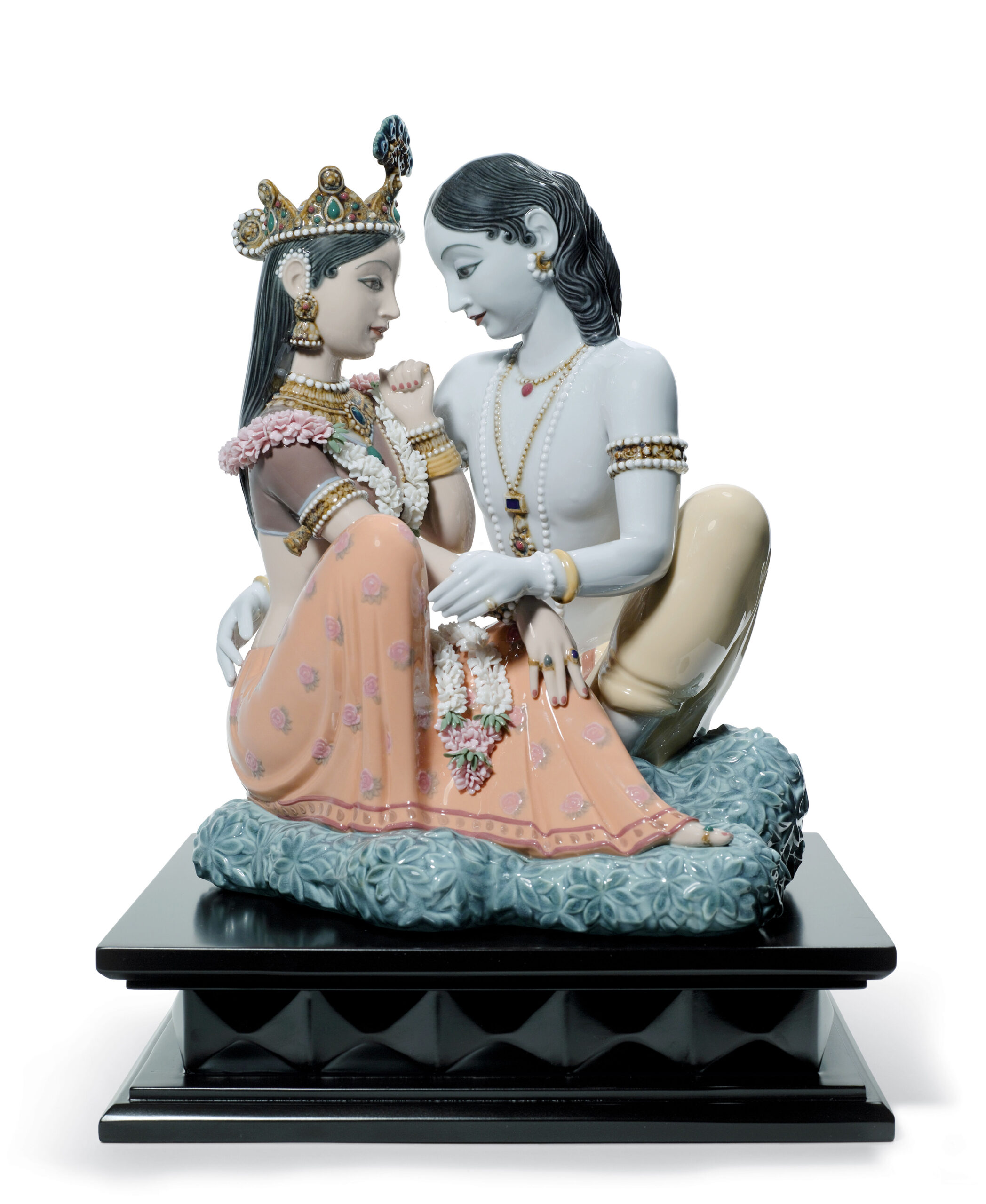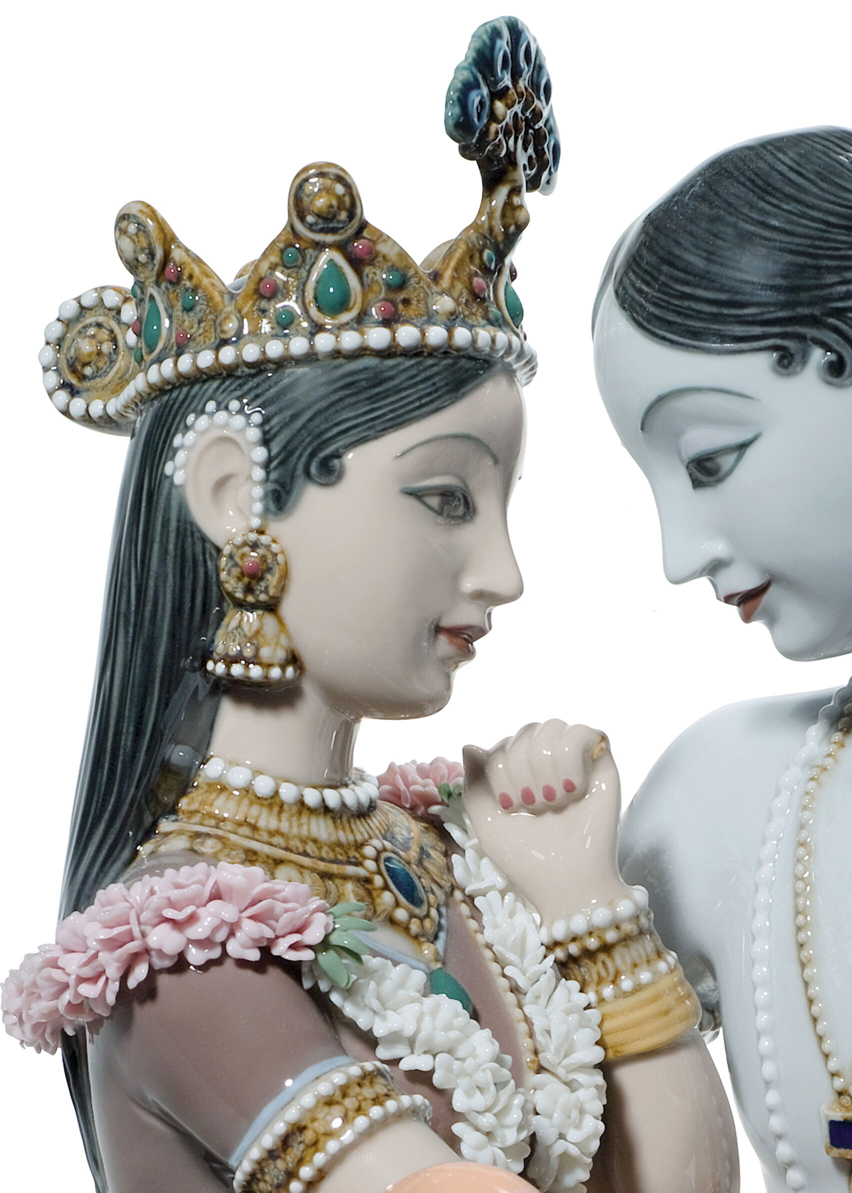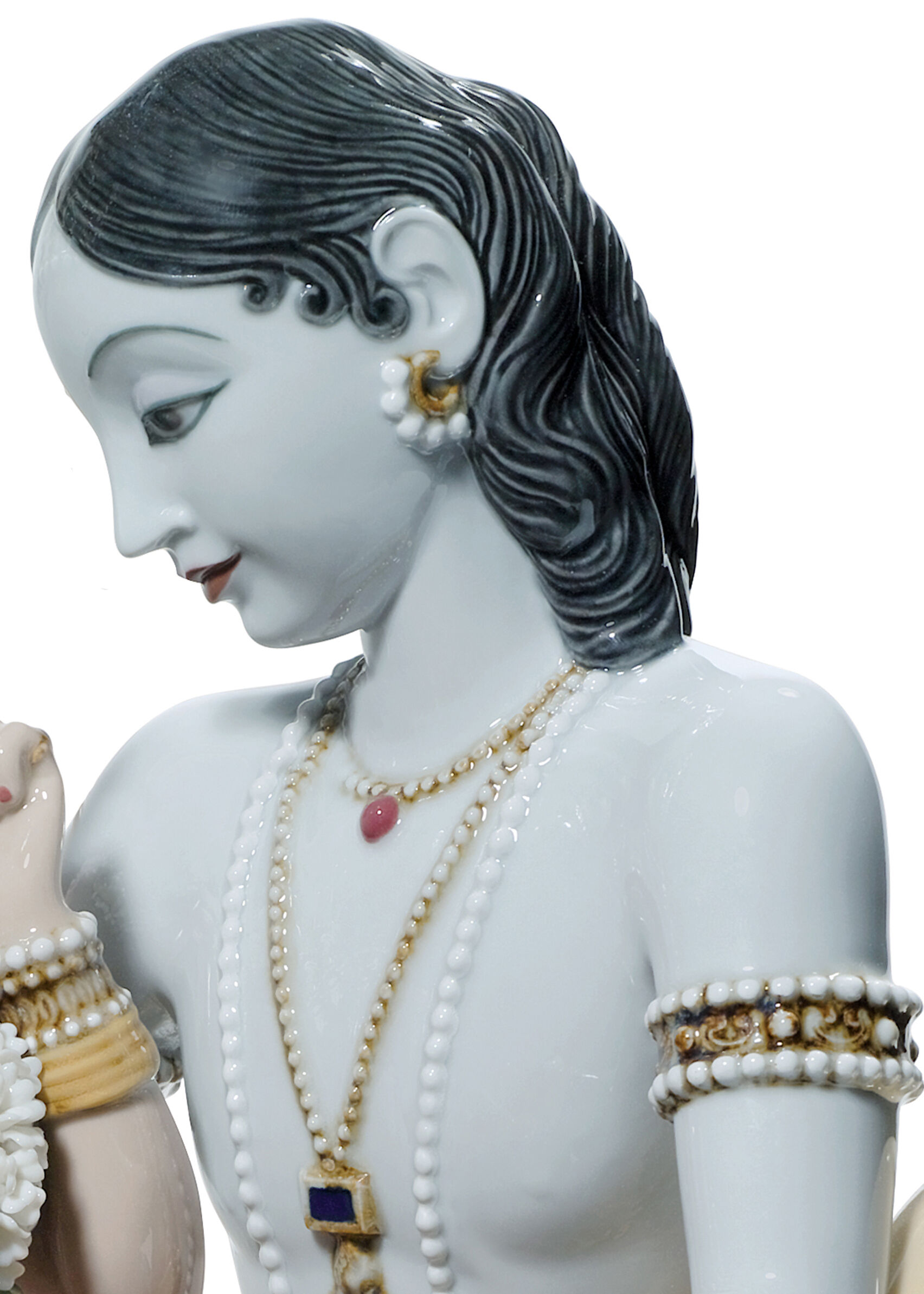 Fascinated by the Hindu rich iconography, LladrĂ³’s artist bring this romantic scene to life, capturing the moment when a couple sitting by the banks of the river Ganges bid farewell before the young man goes in search of the fortune he needs to marry his love one. As a sign of the riches they will share on his return, the young man offers her his crown, a symbol of love that will keep his memory alive while he is away. Bedecked in traditional Hindu jewelry and costumes, they have been decorated with festive intense colours, like orange and saffron, in contrast with the soft tones of their skin. Enamels were used in the crown and the jewelry to achieve a more realistic effect. We should also underline the garland of flowers worn by the young woman, handmade petal by petal by LladrĂ³’s artists.