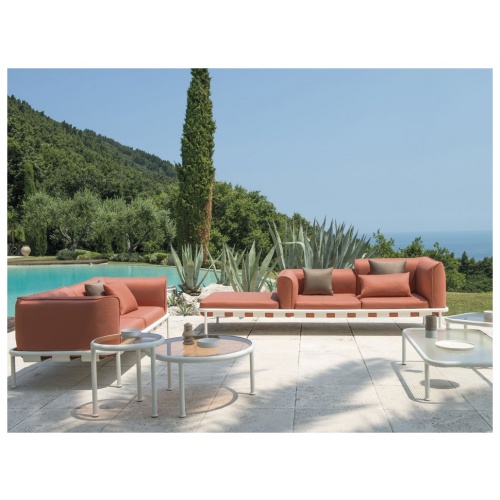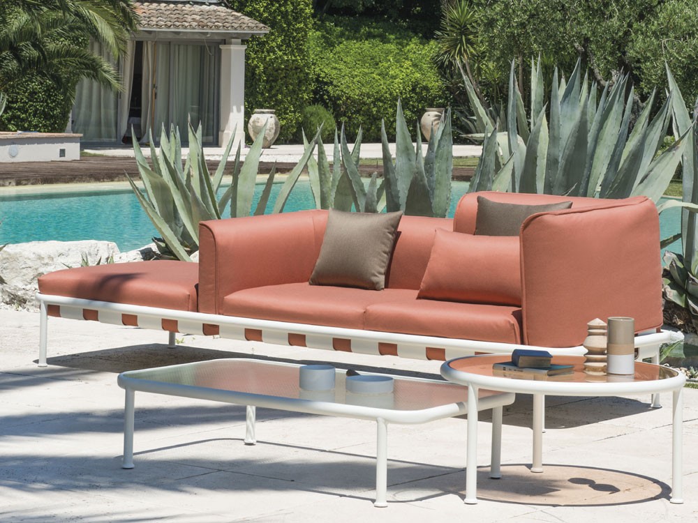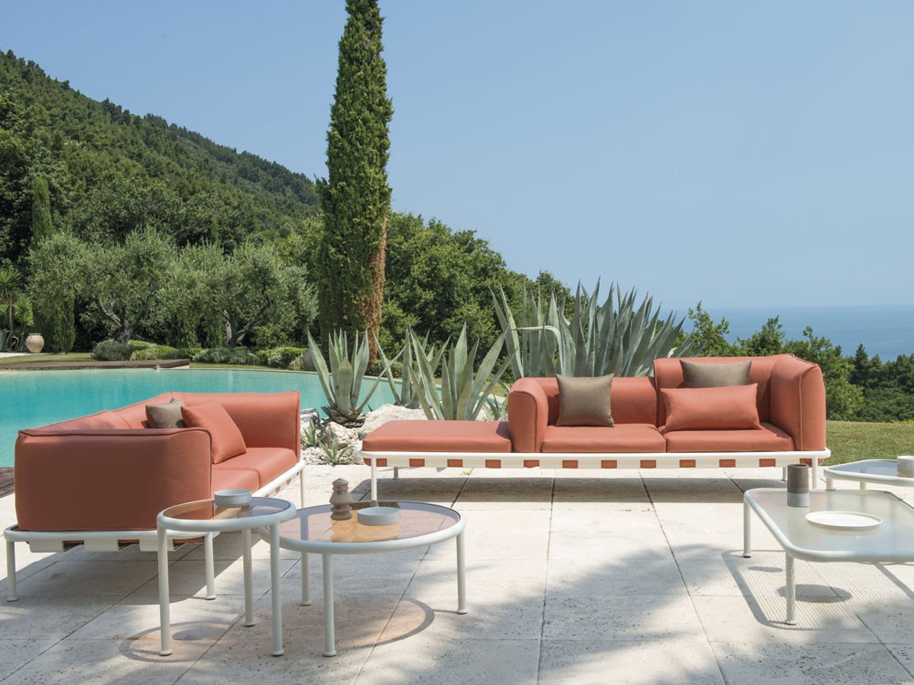 A modular seating and low table collection released in 2017 by Sebastian Herkner for vibrant Italian outdoor furniture manufacturer EMU.