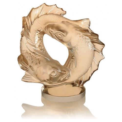 Highly symbolic, the fish has often inspired artists including René Lalique. Designed in 1953 by Marc Lalique, the Double Fish sculpture shows two carps gushing from water in a movement evoking infinity. This model is now available in a medium size. The purity of crystal highlights the finely carved scales.