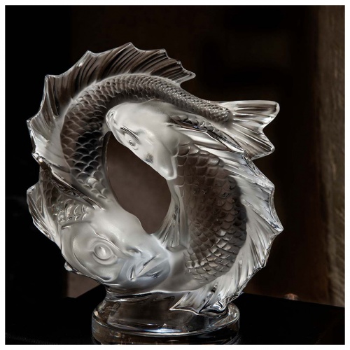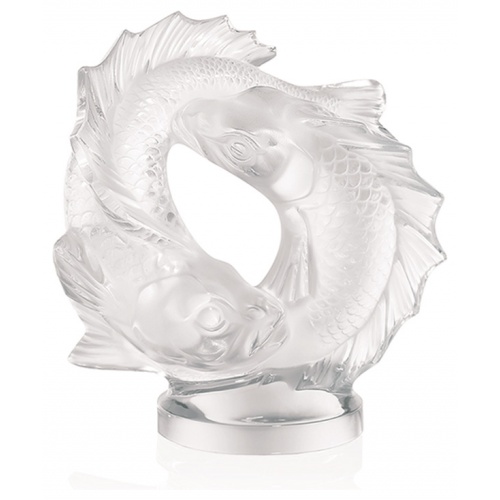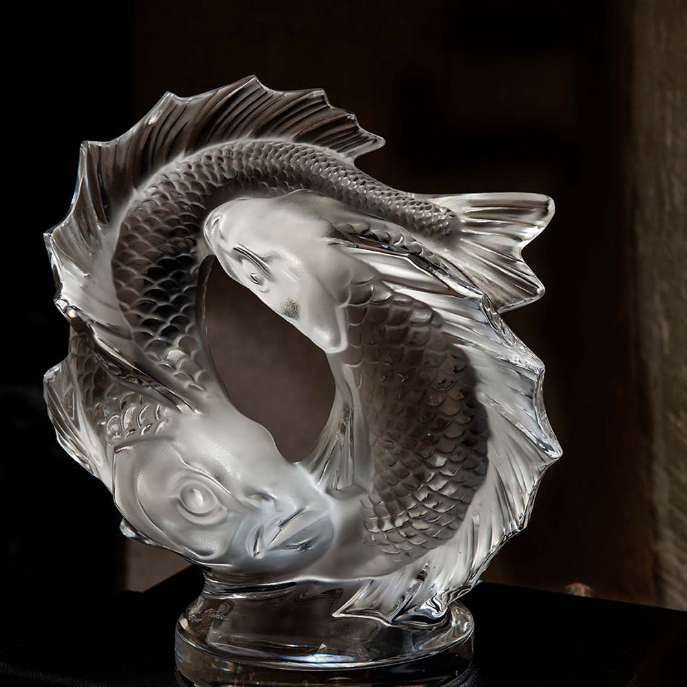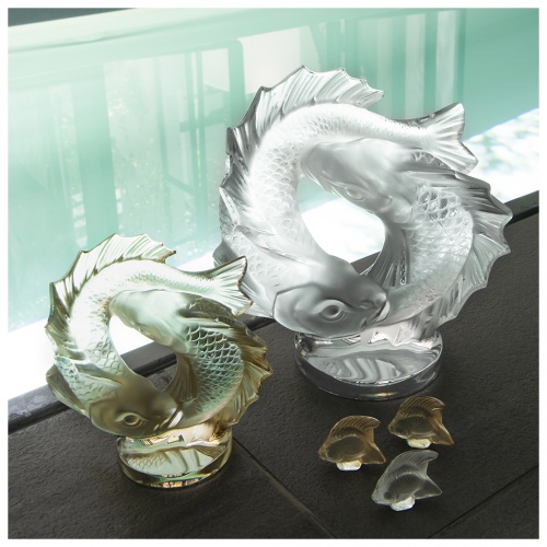 On this large satin crystal figure, designed in 1953 by Marc Lalique, the two fish seem to emerge from the water.