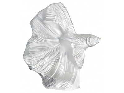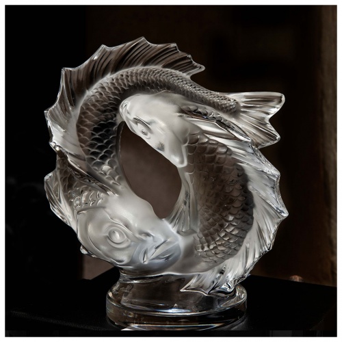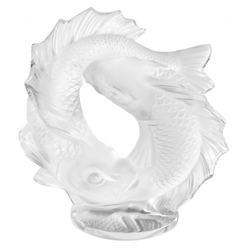 Symbol of prosperity and perseverance, the Koi fish has often inspired artists. Designed in 1953 by Marc Lalique, the Double Fish sculpture depicts two carps gushing from water in a movement evoking infinity. This model is now available in a small size. The satin-finished crystal, emblematic of Lalique, highlights the finely carved scales.