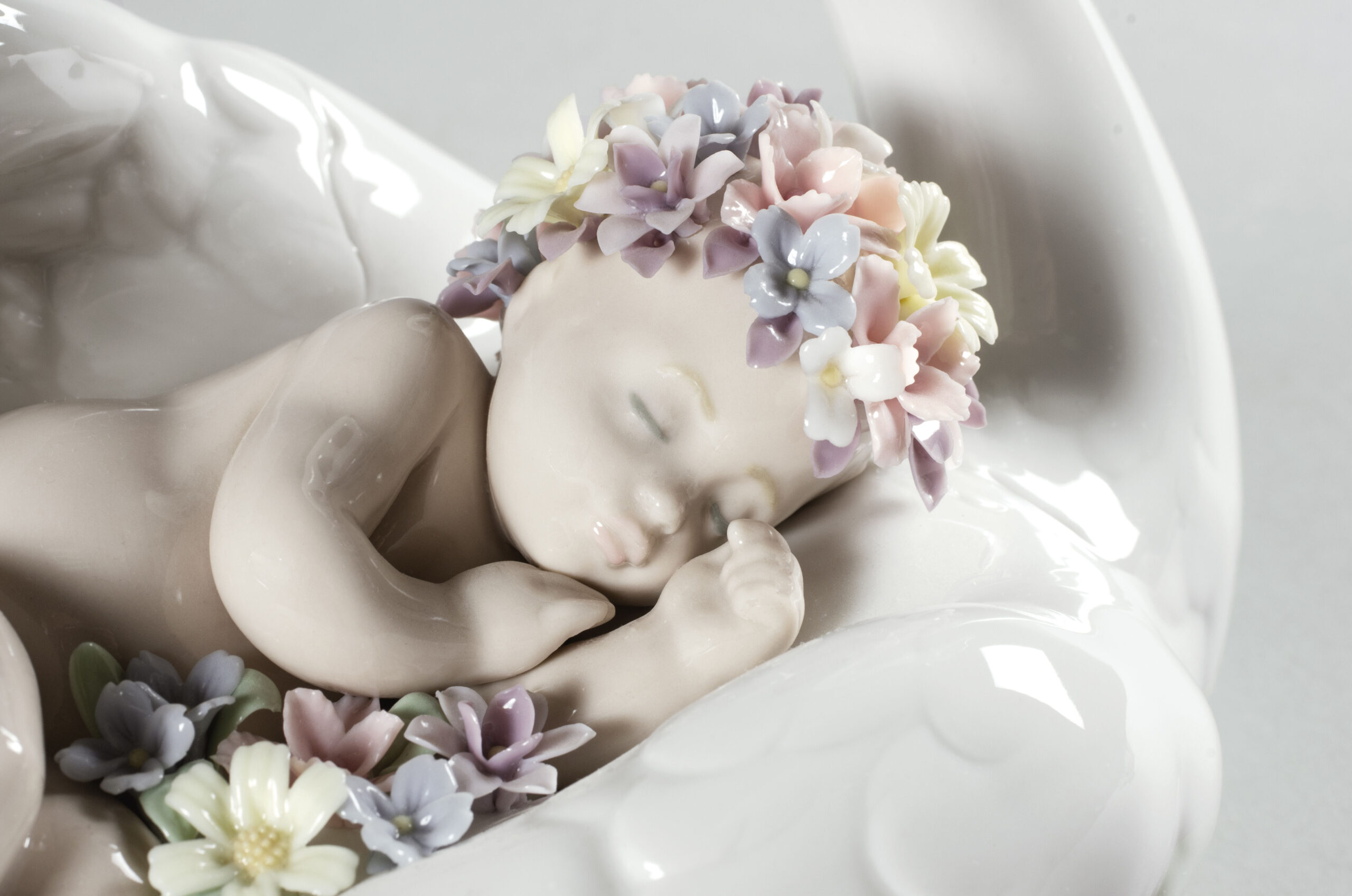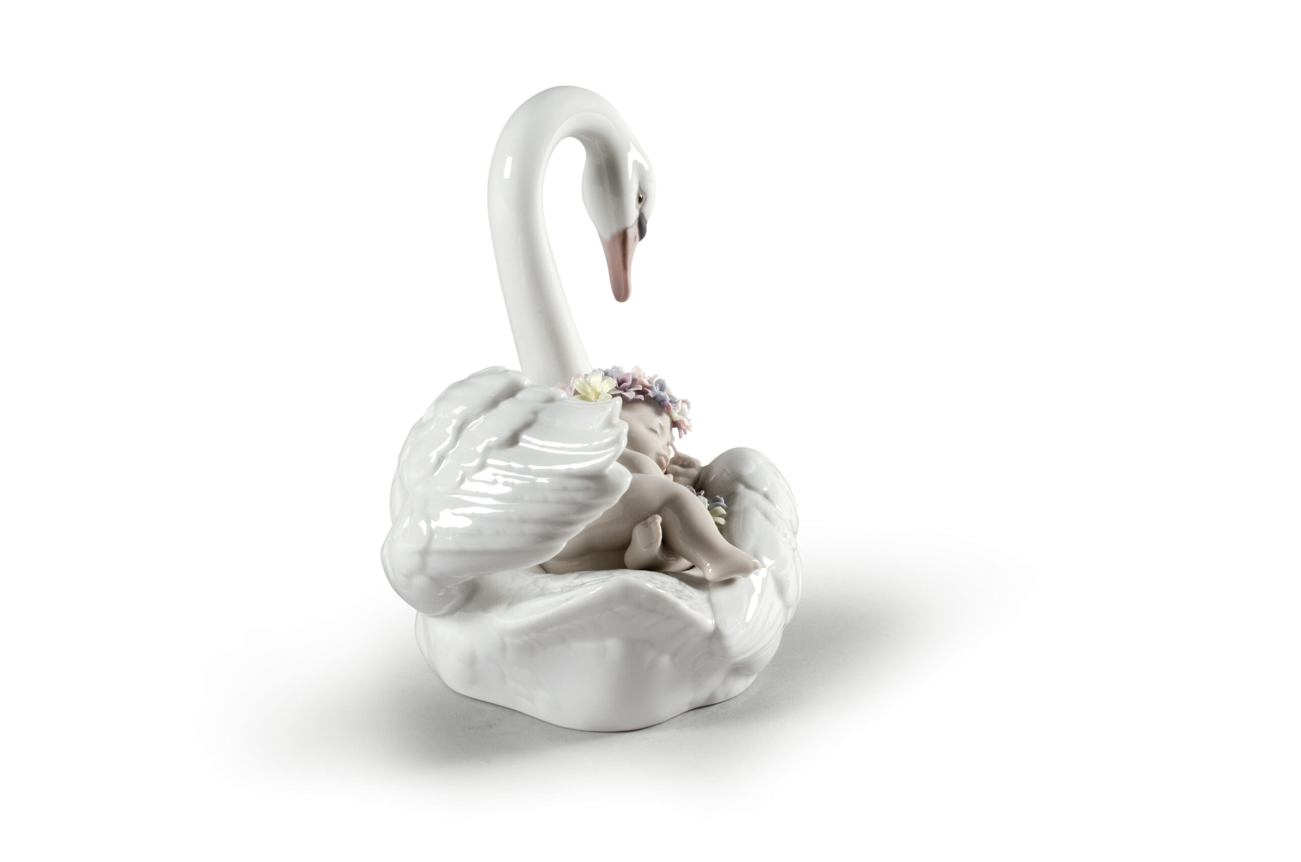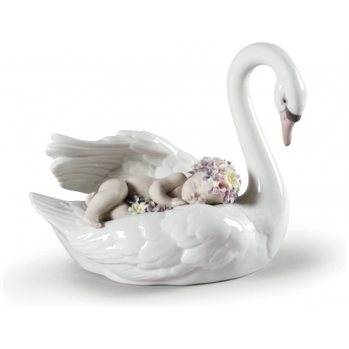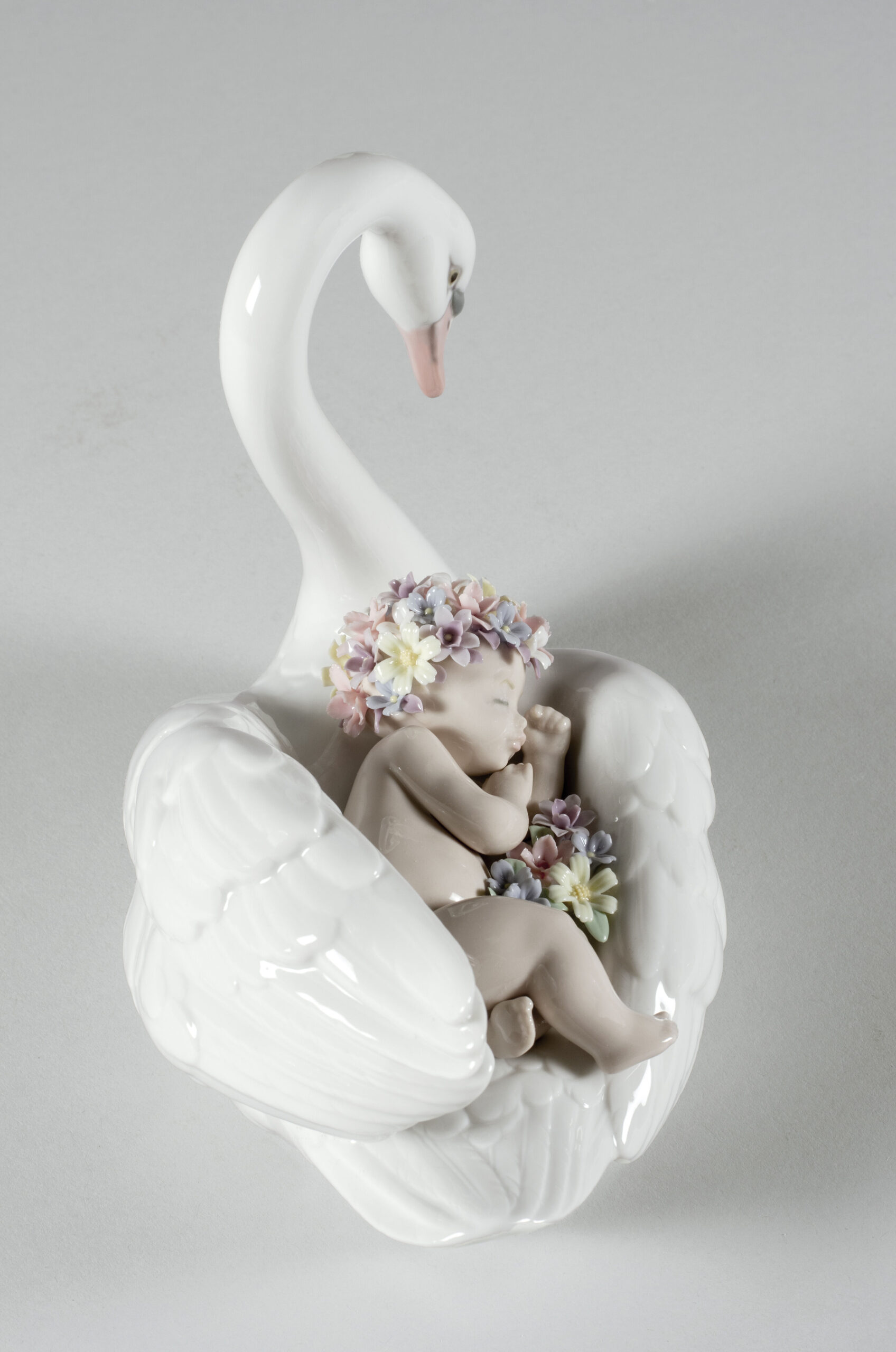 In his dreams, a beautiful swan carries him over a placid lake and perfumed flowers cover his hair. This beautiful fantasy is brought to life in delicate glossy porcelain, decorated in soft pastel colours, in this piece that is perfect as a gift, collector’s item or decoration.