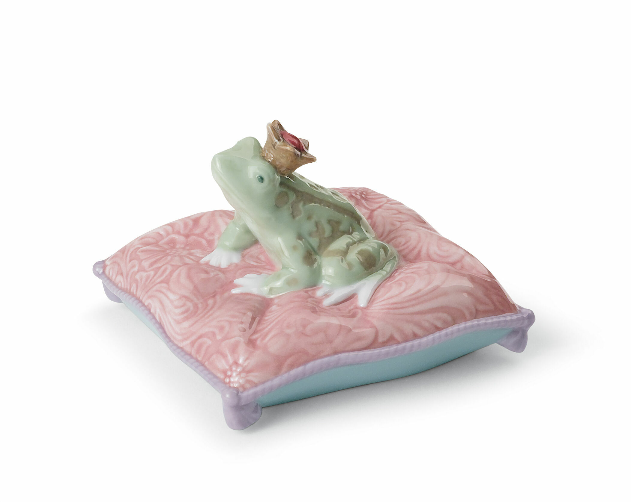 This cute and funny piece shows a green and white frog with a golden crown topped with a red velvet cup, resting on an elegant cushion as if it were the throne of a real king. The cushion is soft red with damask drappings and haberdashery tassel in purple colour (a traditional royal distinctive). A popular phrase related to this character is, You have to kiss a lot of frogs before you find your handsome prince. It is used to encourage women who have romance troubles.