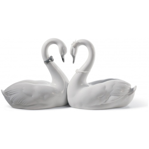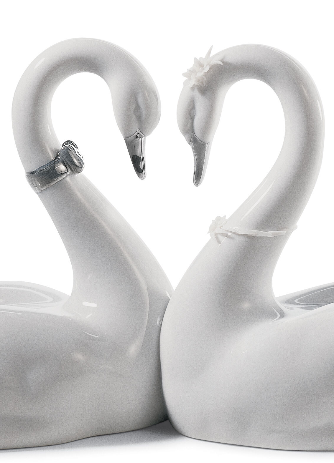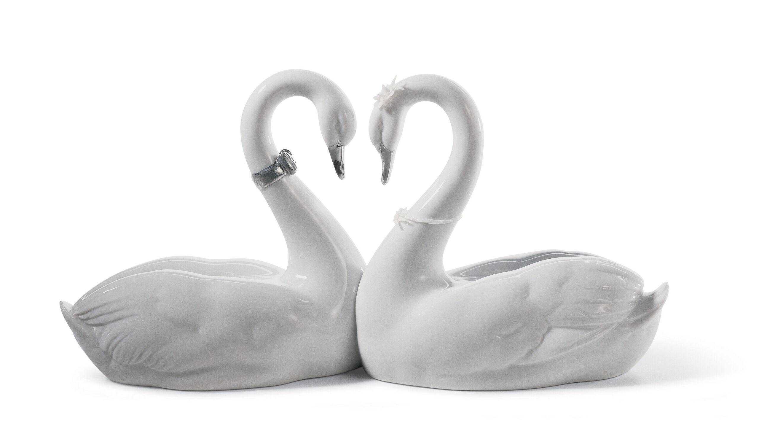 The Re-Deco concept gives a new life to the classic pieces of the LladrĂ³ catalogue through a new and striking decorative approach. This romantic pair of swans is given a much more contemporary style through the contrast between the matte white porcelain finish and the silver lustre that lifts details of the piece.