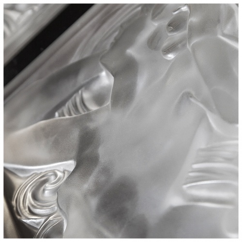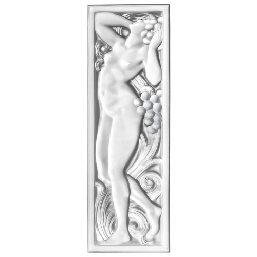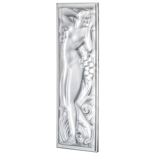 We can witness a sensual and elegant dance. The women moves gracefully surrounded by volutes and grapes. This crystal panel captures light and plunges the viewer into a poetic world.