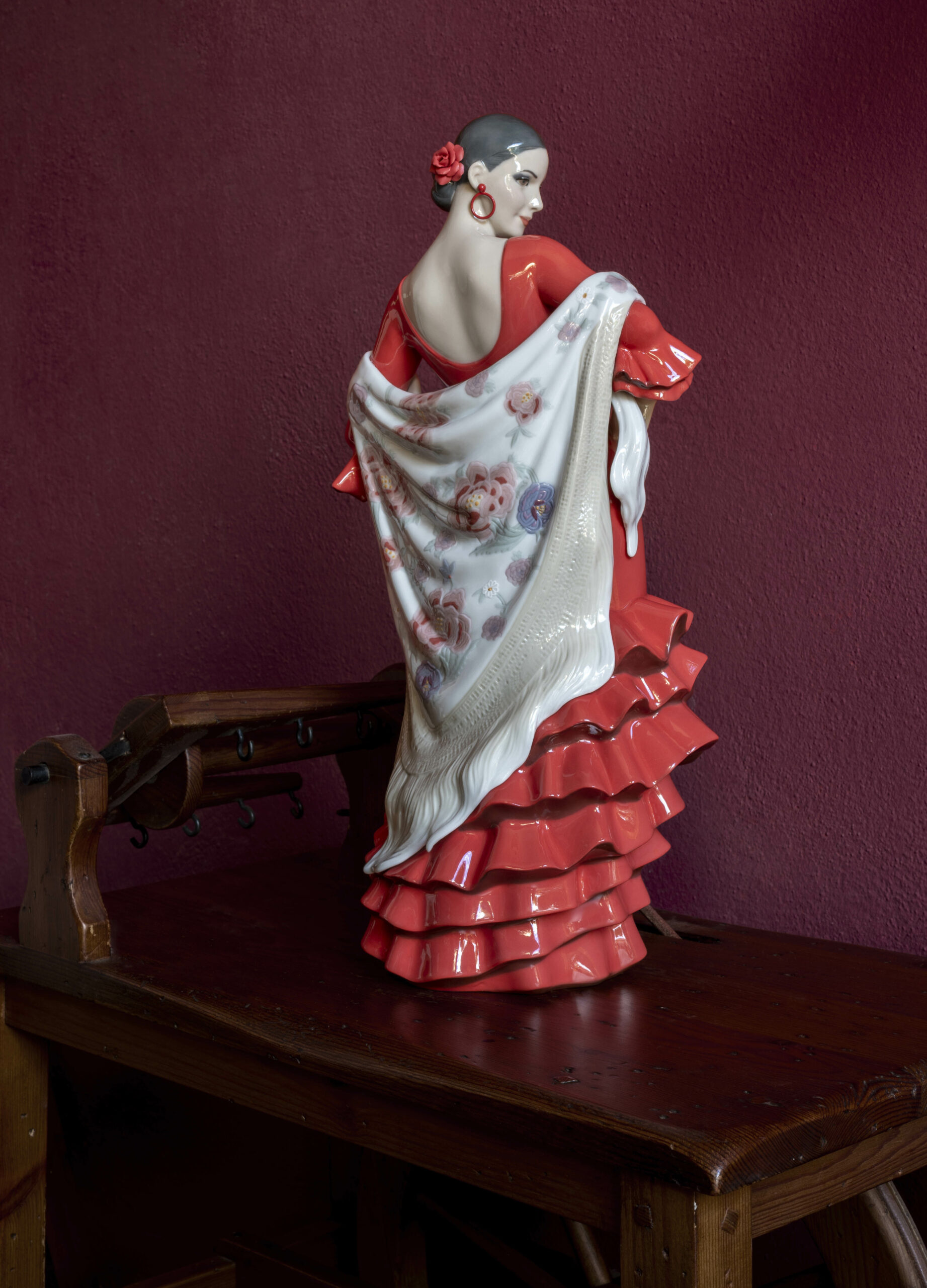 Made in glazed porcelain and decorated with a deep red color for the dress, the finish of this piece also includes delicately painted details in the shawl and the rose which adorns the young woman’s hair, handmade petal by petal. Perfect for decorating, as a gift or for collectors, or as a souvenir of a trip to Spain. Handmade in the Lladró workshops.