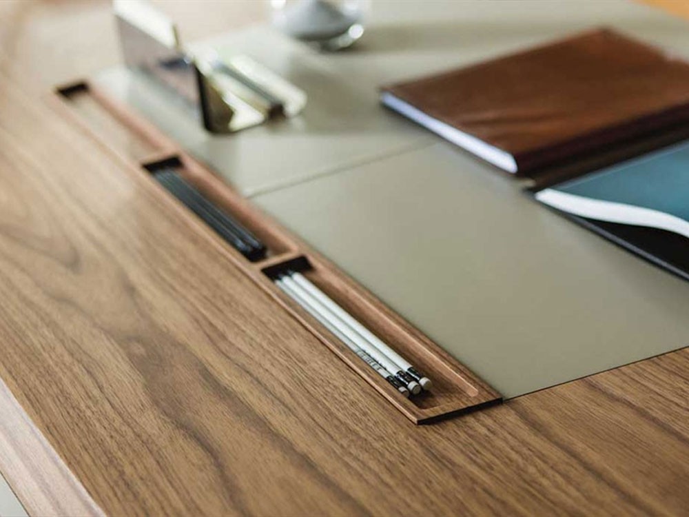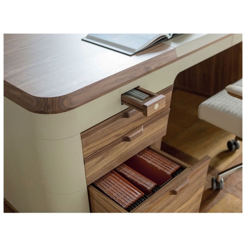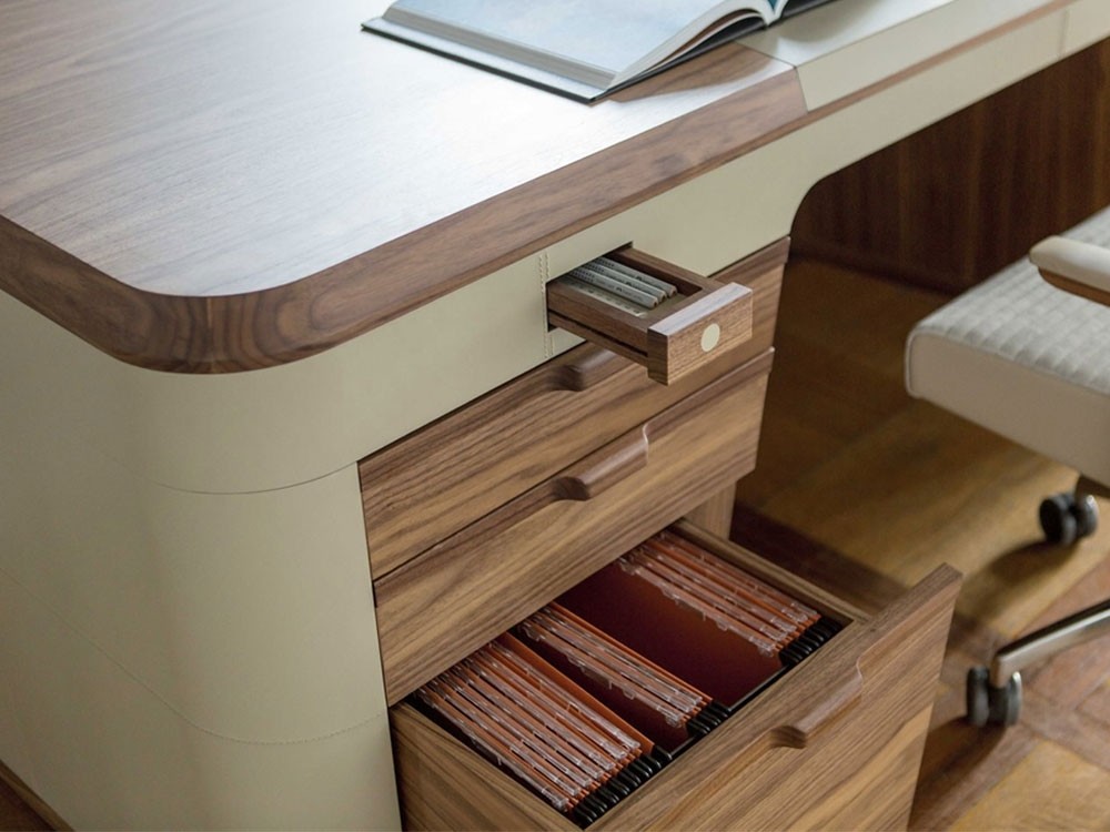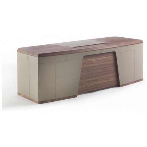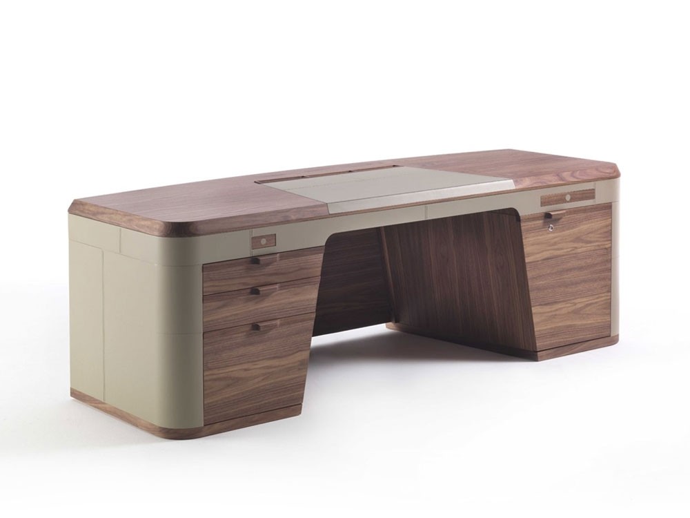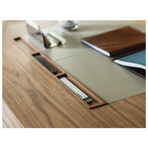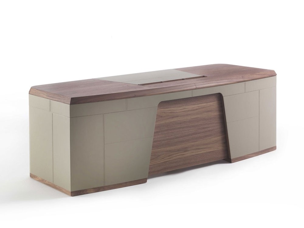 Utter sophistication and innovative design. The executive Flavio writing desk is composed of solid canaletta walnut with its exterior frame impeccably covered by exquisite Cuoietto leather.