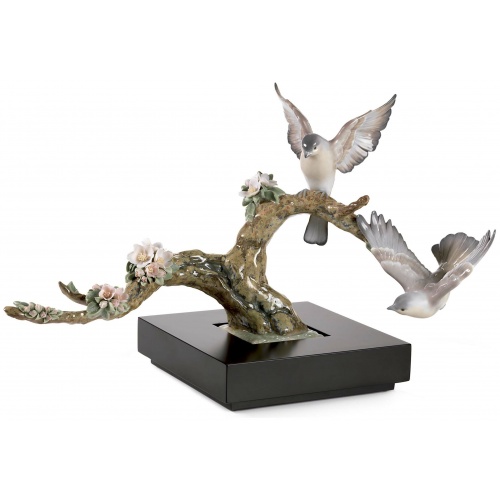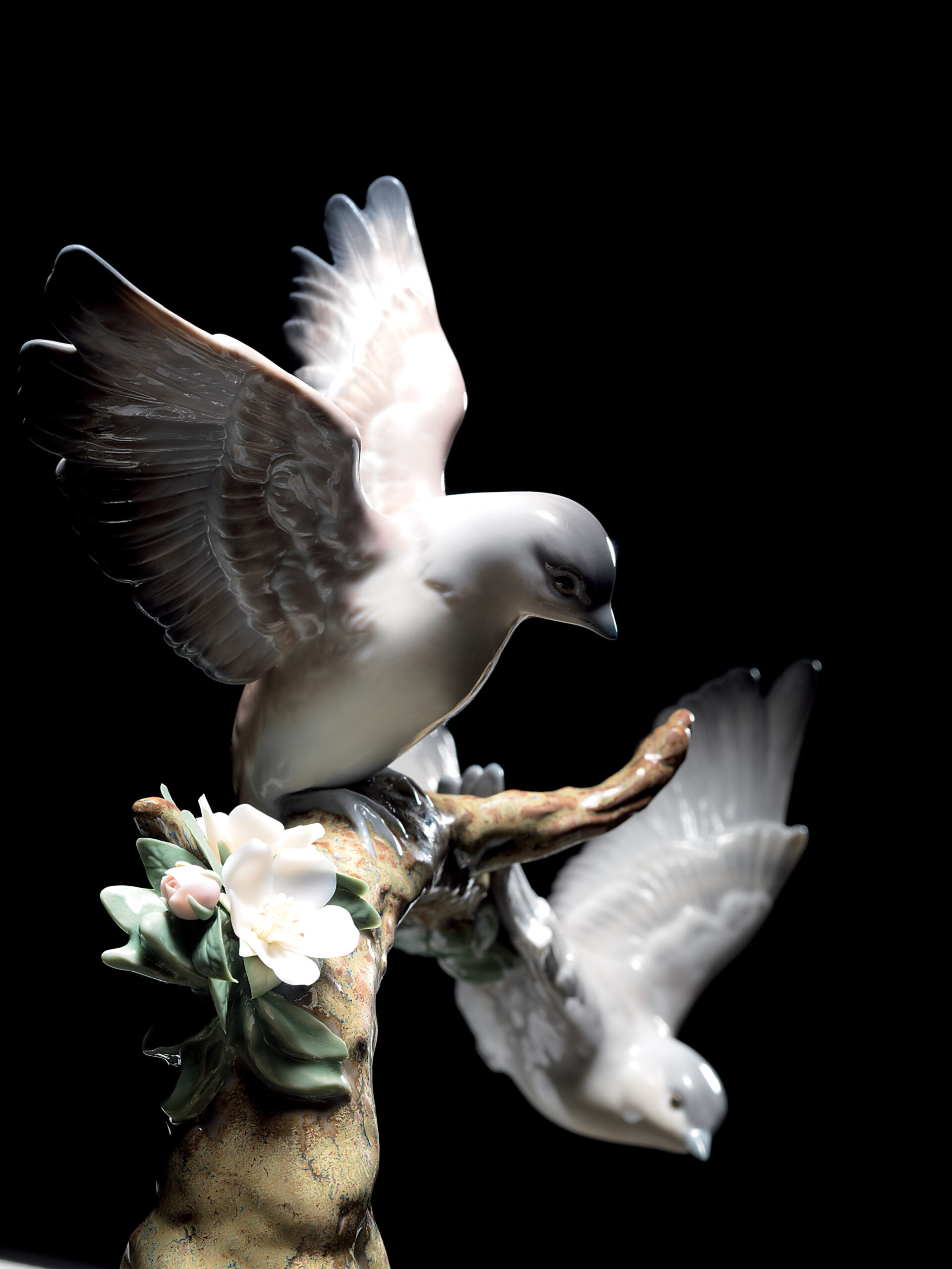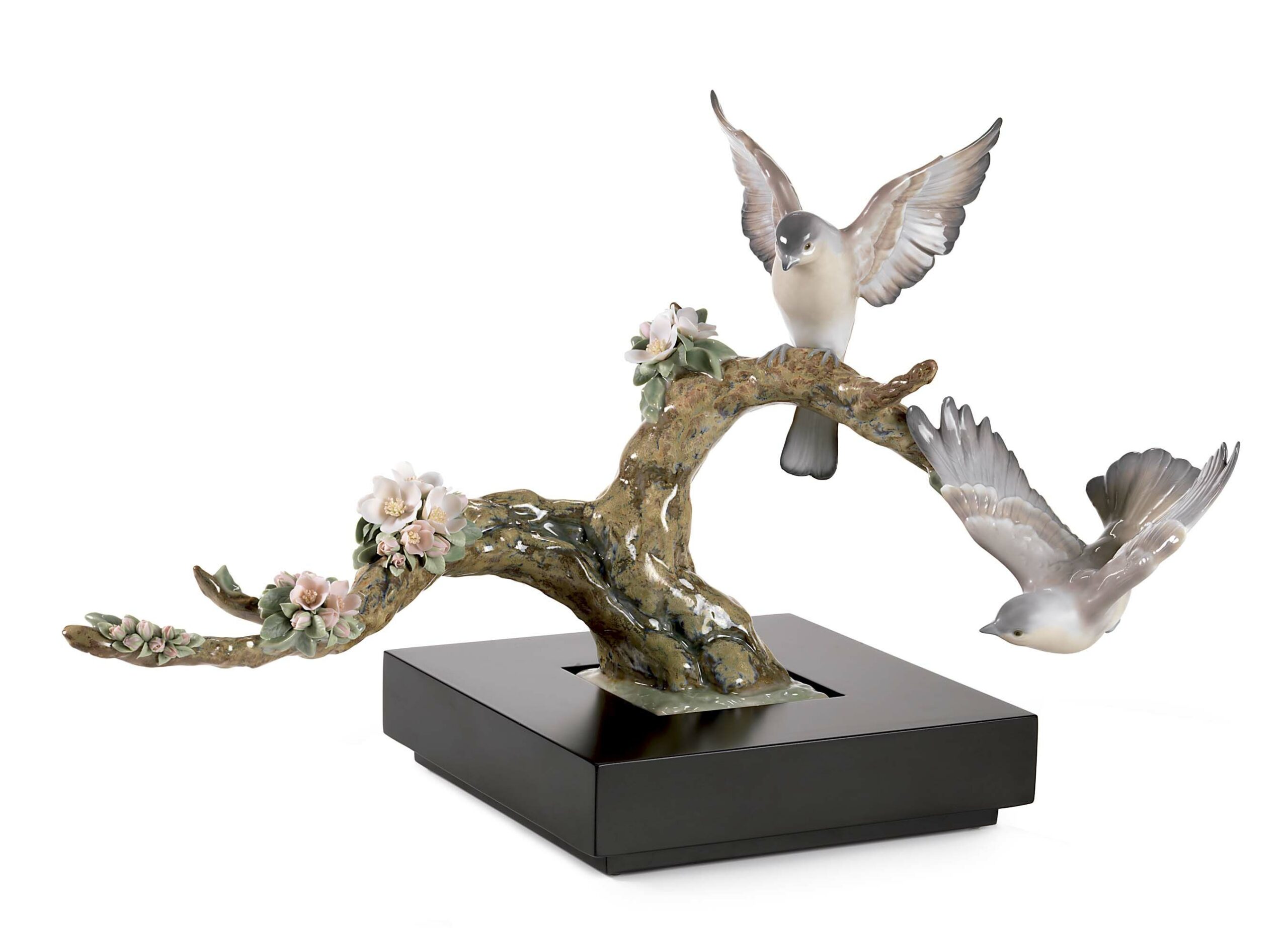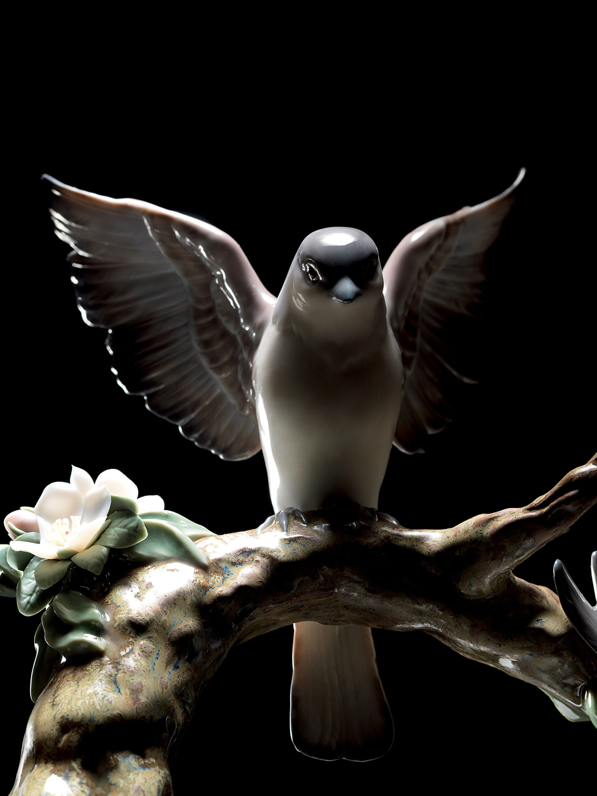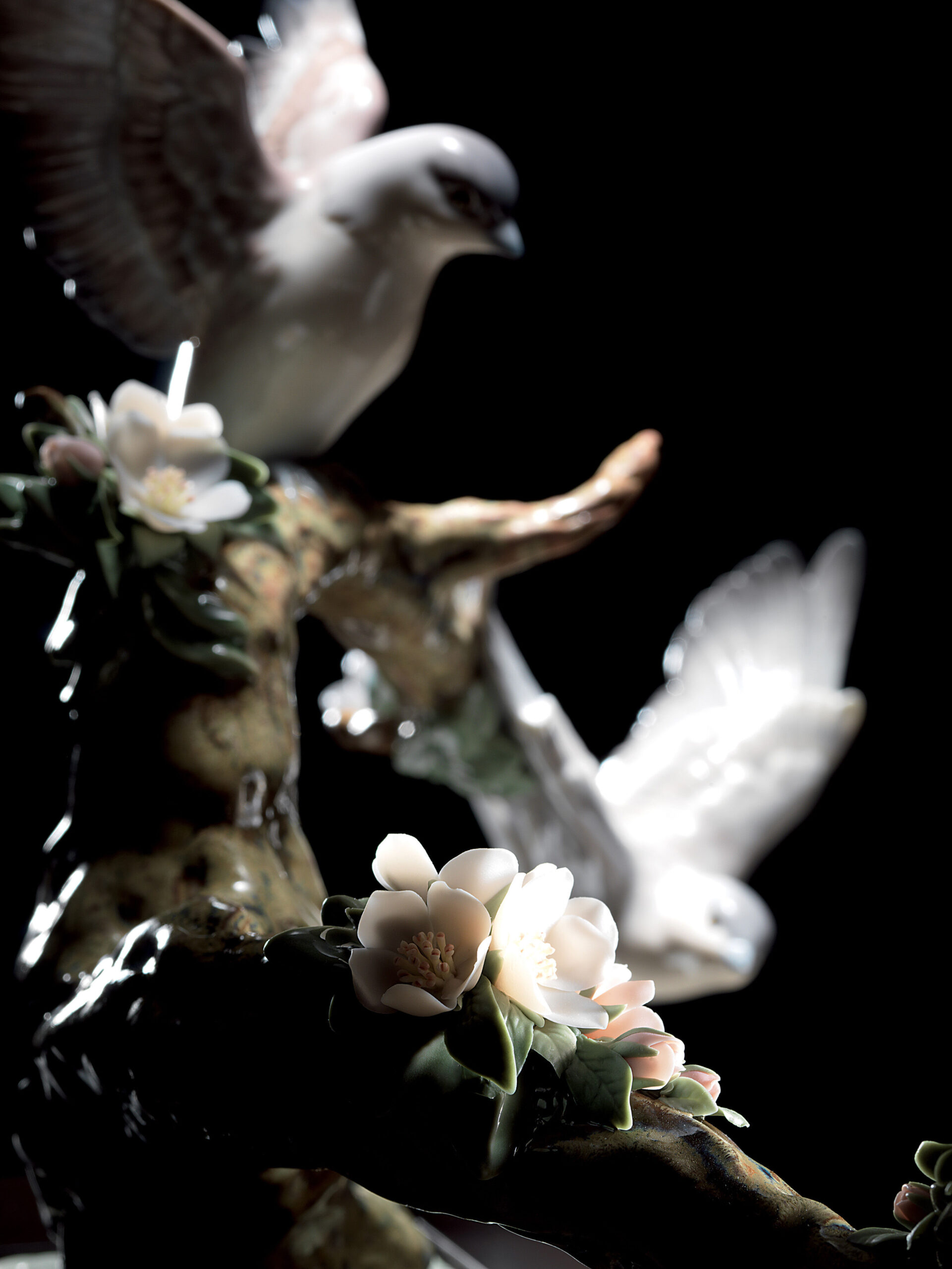 A piece depicting two birds inspired on chaffinches on a blossoming tree branch. The scene expresses all the beauty of untamed nature. The horizontal composition is not very frequent in porcelain creations. The balance of the different elements, seemingly suspended in air, is truly impressive. The birds, on the point of landing or perhaps taking off, imbue the piece with extraordinary movement and give it an almost realistic style. Three or four small groups of pinkish porcelain flowers with little hand-made green leaves are budding on the branch.