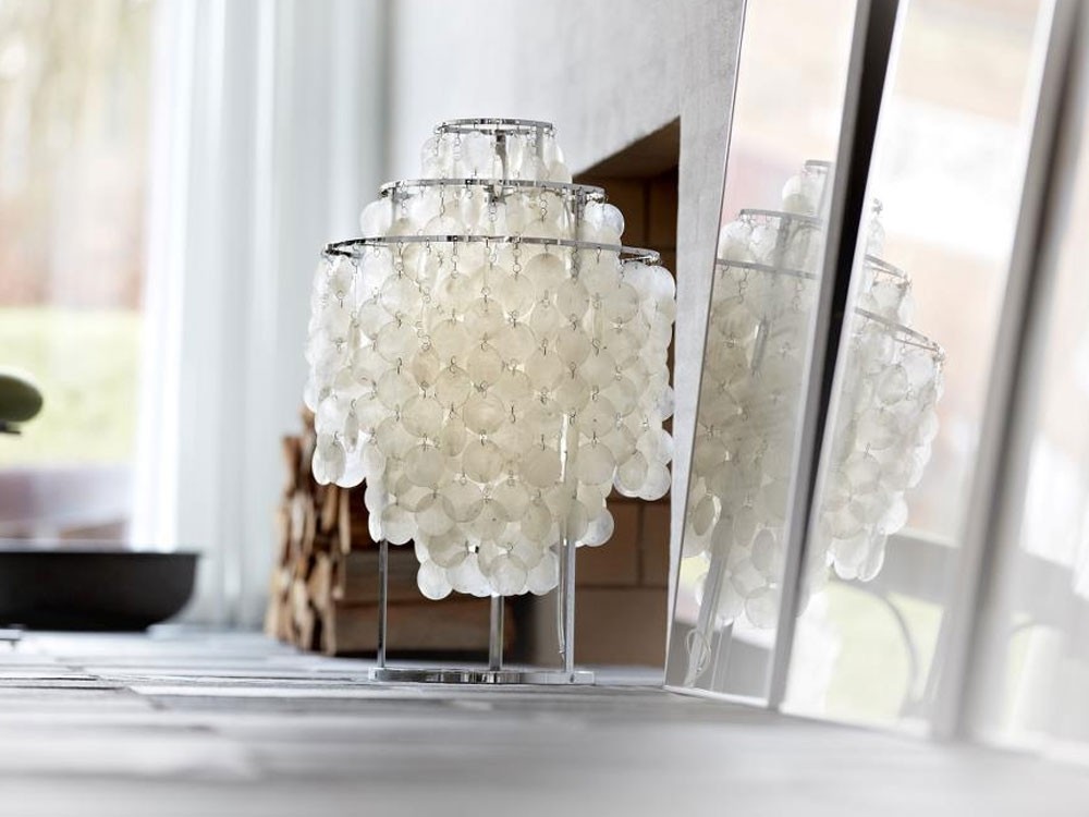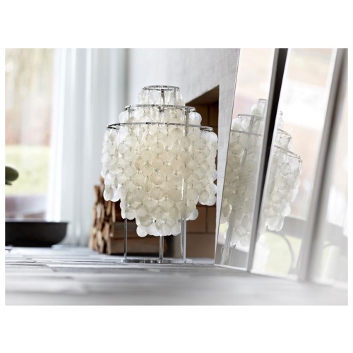 A contemporary table lamp with large clusters of seashell discs.