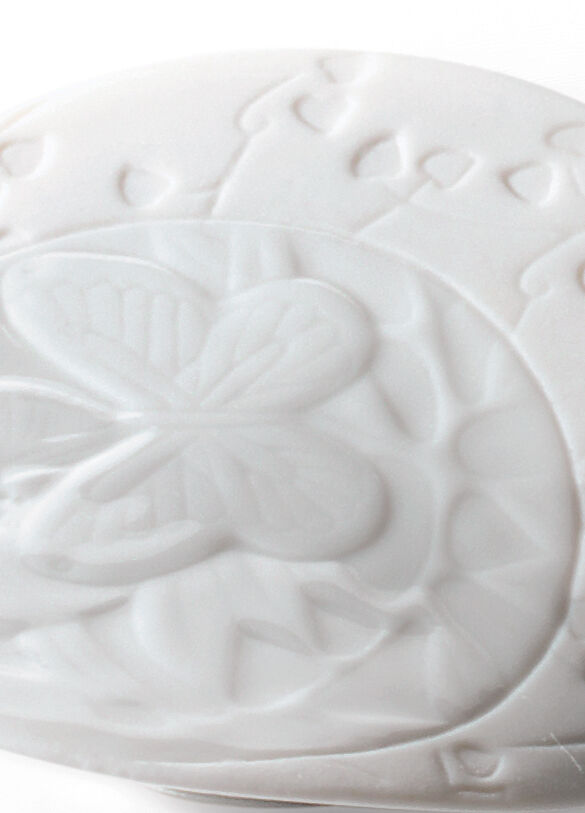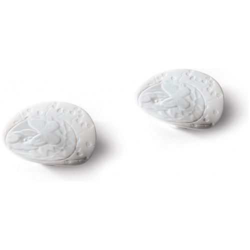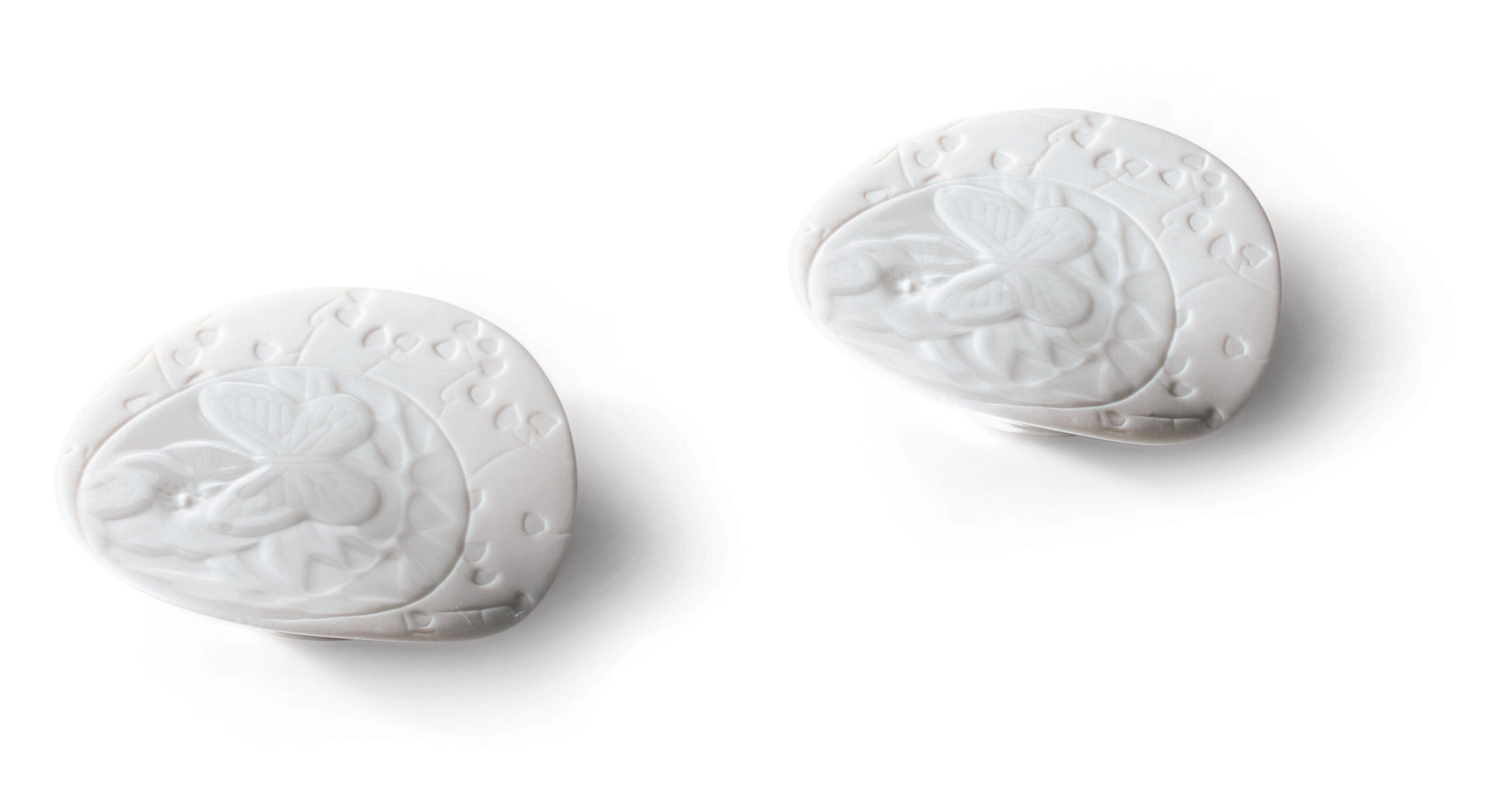 This chopstick rest belongs to a set of three items which form part of the Garden Aperitif collection, all in white with decorative motifs. White glossy and matte porcelain with engraved flowers and butterflies. The engravings will appear and become more visible when in use. You can use these items for both Japanese and Western food. They make a perfect gift for weddings, special occasions, and as corporate gifts
